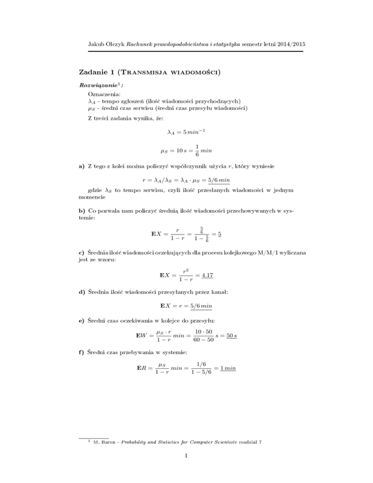 Jakub Olczyk Rachunek prawdopodobie«stwa i statystyka semestr letni 2014/2015 Zadanie 1 (Transmisja wiadomo±ci) 1 Rozwi¡zanie : Oznaczenia: λ - tempo zgªosze« (ilo±¢ wiadomo±ci przychodz¡cych) µ - ±redni czas serwisu (±redni czas przesyªu wiadomo±ci) Z tre±ci zadania wynika, »e: A S λA = 5 min−1 µS = 10 s = a) 1 min 6 Z tego z kolei mo»na policzy¢ wspóªczynnik u»ycia r, który wyniesie r = λA /λS = λA · µS = 5/6 min gdzie λ to tempo serwisu, czyli ilo±¢ przesªanych wiadomo±ci w jednym momencie b) Co pozwala nam policzy¢ ±redni¡ ilo±¢ wiadomo±ci przechowywanych w systemie: S EX = 5 r = 6 1−r 1− 5 6 =5 rednia ilo±¢ wiadomo±ci oczekuj¡cych dla procesu kolejkowego M/M/1 wyliczana jest ze wzoru: c) EX = d) r2 = 4.17 1−r rednia ilo±¢ wiadomo±ci przesyªanych przez kanaª: EX = r = 5/6 min e) redni czas oczekiwania w kolejce do przesyªu: EW = f) µS · r 10 · 50 min = s = 50 s 1−r 60 − 50 redni czas przebywania w systemie: ER = 1 M. Baron - µS 1/6 min = = 1 min 1−r 1 − 5/6 Probability and Statistics for Computer Scientists 1 rozdziaª 7 Zadanie 2 (Symulacja systemu kolejkowego) 2 Rozwi¡zanie : Cz¦±¢ analityczna Mamy do zamodelowania system zbudowany z 4 serwerów o ró»nych charakterystykach: S ∼ Gamma(α = 7; λ = 7 min ) S ∼ Gamma(α = 5; λ = 2 min ) S ∼ Exp(λ = 0.3 min S ∼ U nif orm(a = 4 min; b = 9 min) Zgªoszenia do systemu nadchodz¡ zgodnie z procesem Poissona. Oznaczmy go przez −1 I −1 II III −1 IV A(t) ∼ P oisson(λt) Znamy ±redni czas mi¦dzy zgªoszeniami. Ze wzgl¦du na to, »e jest to proces Poissona to rozkªad czasu mi¦dzy nimi b¦dzie wykªadniczy i z tego mo»emy zacz¡¢ co± mówi¢ na temat samego procesu. EY = 1 1 = λ 2 dla zmiennej Y opisuj¡cej czas mi¦dzy zgªoszeniami. Z czego wynika, »e A(t) ∼ P oisson(2t) 2 M. Baron Probability and Statistics for Computer Scientists 2 rodziaª 7