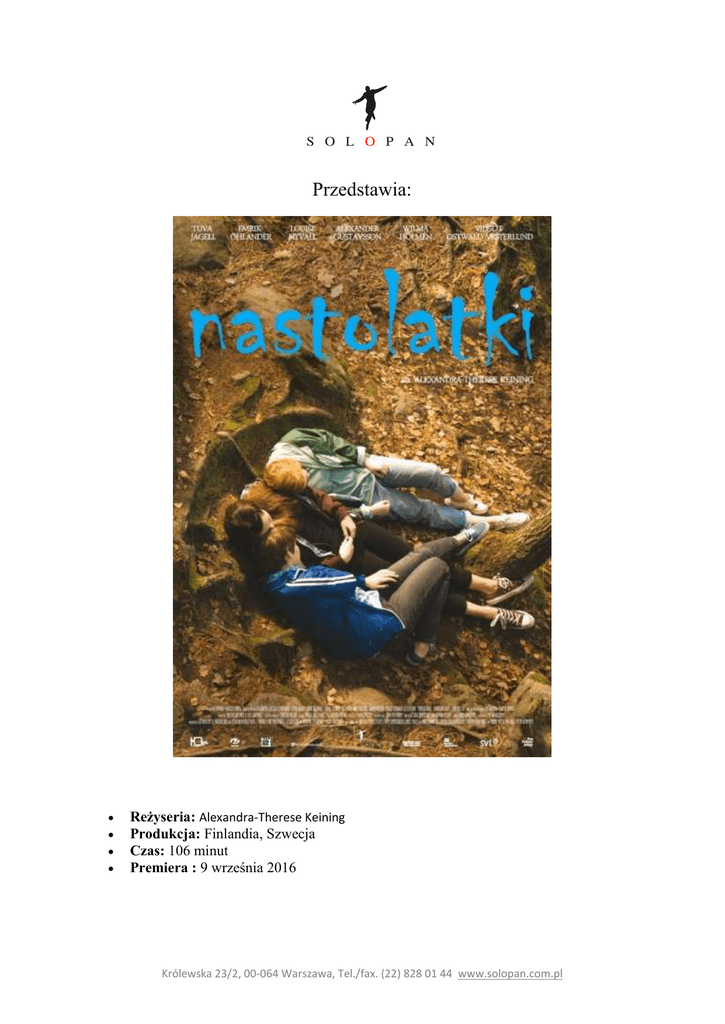 Przedstawia: Reżyseria: Alexandra-Therese Keining Produkcja: Finlandia, Szwecja Czas: 106 minut Premiera : 9 września 2016 Królewska 23/2, 00-064 Warszawa, Tel./fax. (22) 828 01 44 www.solopan.com.pl SYNOPSIS Kim, Bella i Momo, trzy prześladowane w szkole nastolatki, przechodzą przez trudny proces dojrzewania. Otoczone przez mroczny świat nastoletniej przemocy, zmarginalizowane i zagubione dziewczyny, mają tylko siebie. Wszystko się zmienia, gdy w ogrodzie jednej z nich, Belli, znajdują magiczny kwiat, którego sok zamienia dziewczęta w chłopców. Zmienia się nie tylko ich płeć ale także ich reakcja na to co znały do tej pory z perspektywy dziewczyn . Momo i Bella zdają sobie sprawę, że to tylko zabawa i udawanie. Jednak dla Kim, która jest nie pogodzona ze swoją płcią, bycie chłopcem jest czymś więcej. W swojej nowej skórze wreszcie czuję się ze sobą dobrze. To odważna opowieść o dojrzewaniu, przyjaźni i zmaganiu się z własnymi lękami. KOMENTARZ REŻYSERKI Alexandra-Therese Keining: „W tym filmie chciałam zbadać granice jaźni i ciała, a rola Kim pokazuje, że zjawiska tożsamości i płci opisane jako trwałe i nie zmieniające się, nieustannie się zmieniają i podlegają negocjacji. Jednocześnie możemy dostrzec różnice między dziewczynkami a chłopcami dzięki temu, że zadajemy ważne pytania dotyczące płci.” Królewska 23/2, 00-064 Warszawa, Tel./fax. (22) 828 01 44 www.solopan.com.pl NAGRODY I RECENZJE Powieść Schiefauer ( na podstawie , której powstał film) wygrała Szwedzką Nagrodę Sierpnia w 2011 roku w kategorii Najlepsza literatura dla dzieci i młodzieży Alexandra-Therese Keining dostała nominację do Europejskiej Nagrody Filmowej - Nagroda Młodej Widowni. 2016 Antalya Golden Orange Film Festival - Grand PRIX – 2015 RECENZJE: Bernadetta Trusewicz - http://fdb.pl/wiadomosci/27027-recenzja-nastolatki INSIDE OUT - https://cinemaaxis.com/2016/06/03/inside-out-2016-girlslost/ SALTY POPCORNhttp:// saltypopcorn.com.au/ girls-lost/ Królewska 23/2, 00-064 Warszawa, Tel./fax. (22) 828 01 44 www.solopan.com.pl PODSTAWOWE INFORMACJE REŻYSERIA I SCENARIUSZ: Oparty na podstawie noweli Jessici Schiefauer „Pojkarna” WYSTĘPUJĄ: Tuva Jagell, Emrik Öhlander, Louise Nyvall, Alexander Gustavsson, Wilma Holmén, Vilgot Ostwald Vesterlund, Mandus Berg, Adam Dahlgren, Filip Vester PRODUKCJA: Helena Wirenhed & Olle Wirenhed KOSTIUMY: Sara Pertmann MUZYKA: Sophia Ersson Królewska 23/2, 00-064 Warszawa, Tel./fax. (22) 828 01 44 www.solopan.com.pl