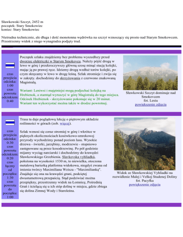Sławkowski Szczyt, 2452 m początek: Stary Smokowiec koniec: Stary Smokowiec Nietrudna technicznie, ale długa i dość monotonna wędrówka na szczyt wznoszący się prosto nad Starym Smokowcem. Przestrzenny widok z niego wynagradza podjęty trud. Początek szlaku znajdziemy bez problemu wyszedłszy przed dworzec elektriczki w Starym Smokovcu. Należy pójść drogą w lewo w górę i przekroczywszy główną szosę minąć stację kolejki, mając ją po prawej ręce. Idziemy drogą wzdłuż torów kolejki, po czas czym skręcamy w lewo w drogę leśną. Szlak stromieje i zwija się przejścia w zakręty. dochodzimy do skrzyżowania z czerwono znakowaną odcinka: Magistralą. 1:00 czas Wariant: Leniwsi i majętniejsi mogą podjechać kolejką na powrotu Hrebienok, a stamtąd wyruszyć w górę Magistralą do tego miejsca. odcinkiem: Odcinek Hrebienok - skrzyżowanie pokonuje się w 20 minut. 0:40 Wariant ten wykorzystać można także w drodze powrotnej. Sławkowski Szczyt dominuje nad Smokovcem fot. Lesiu powiększenie zdjęcia Trasa ta daje poglądową lekcję o piętrowym układzie roślinności w górach (zob. więcej). czas przejścia odcinka: 0:30 czas powrotu odcinkiem: 0:20 czas łączny od początku: 1:30 czas powrotu do początku: 1:00 Szlak wznosi się coraz stromiej w górę i wkrótce w pięknych okolicznościach kosówkowo-smrekowej przyrody wychodzimy ponad poziom lasu. Wysokie drzewa - świerki, jarzębiny, modrzewie - stopniowo zastępowane są przez kosodrzewinę. Po pół godzinie mijamy wyciąg narciarski i dochodzimy do krawędzi Sławkowskiego Grzebienia. Slavkovska vyhliadká, położona na wysokości 1530 m, to niewielka, otoczona metalową barierką platforma widokowa, niegdyś zwana od imienia twórcy Maximiliana Weisza - "Maximilianką". Znajduje się ona na krawędzi grani, podciętej dwustumetrową przepaścią. Stąd podziwiać można przepiękny, przestrzenny widok na Łomnicę, Pośrednią Grań i ścielącą się u ich stóp dolinę w miejcu, gdzie zbiega się dolina Zimnej Wody i Staroleśna. Widok ze Sławkowskiej Vyhliadki na rozwidlenie Malej i Velkej Studenej Doliny fot. Pacyfka powiększenie zdjęcia Od tego miejsca szlak długimi zakosami odchodzi od grani i czterokrotnie do niej wraca - na wysokości 1650m, 1730 m, 1810m i 1890m. Za każdym razem mamy znów okazję czas podziwiać widok na doliny, który stopniowo się poszerza. przejścia Pokonując ostatni zakos wychodzimy ponad kosodrzewinę. odcinka: 3:00 Od tego momentu idziemy podchodzimy kolejne 150m czas deniwelacji granią, a potem znów zboczem, wśród potężnych powrotu odcinkiem: usypisk i złomów skalnych. Olrzymie głazy porośnięte są ciepłolubnymi porostami. Jesteśmy na południowym, 2:25 nieosłoniętym stoku, więc jeśli nie ma chmur, słońce zdążyło czas łączny już podnieść się wysoko nad horyzont i praży nas bezlitośnie. W końcu opuszczamy południowe zbocze dochodząc znów od początku: do grani poniżej jej wypiętrzenia o nazwie Sławkowski Nos 4:30 (2273m) i przechodzimy na północną stronę. czas powrotu do początku: 3:25 Widok z grani Sławkowskiego (trzecie 'okno') na Pośrednią Grań i Łomnicę fot. Lesiu powiększenie zdjęcia Masyw Sławkowskiego zamyka od południa Dolinę Staroleśną, więc kiedy omijamy Sławkowski Nos, otwiera się nam widok na jej ogrom, na porośnięte miękką zielenią lasu dno ponad pół kilometra pod nami, na położone w niej liczne stawy i wspaniałe otaczające ją szczyty. Od tego momentu widać również nasz czas cel - szczyt Sławkowskiego. Wydaje się, że jest tak blisko, że już namęczyliśmy się tak bardzo mozolnym przejścia podejściem, że zasługujemy już na nagrodę spełnienia i dotarcia do celu. Tymczasem czeka nas jeszcze 40 odcinka: minut podchodzenia wśród osypujących się drobnych kamieni, żwiru i skalnego pyłu. 0:40 czas W końcu dochodzimy do Sławkowskiego Szczytu. Pięknie stąd prezentują się Tatry Wysokie: bliski powrotu odcinkiem: Gerlach i Staroleśna, Jaworowe Szczyty i Pośrednia Grań, Lodowy, Durny i Łomnica, w dali Tatry Polskie. Widać stąd 24 stawy w odgałęzieniach doliny Staroleśnej. Z drugiej strony Tatr już nie ma: rozpościera się 0:30 pokryta polami i miasteczkami płaskowizna Kotliny Popradzko-Spiskiej, otoczona odległym pasmem czas łączny Niskich Tatr. Mimo dużej wysokości rośnie tu sporo gatunków roślinności wysokogórskiej. od początku: 5:10 czas powrotu do początku: 3:55
