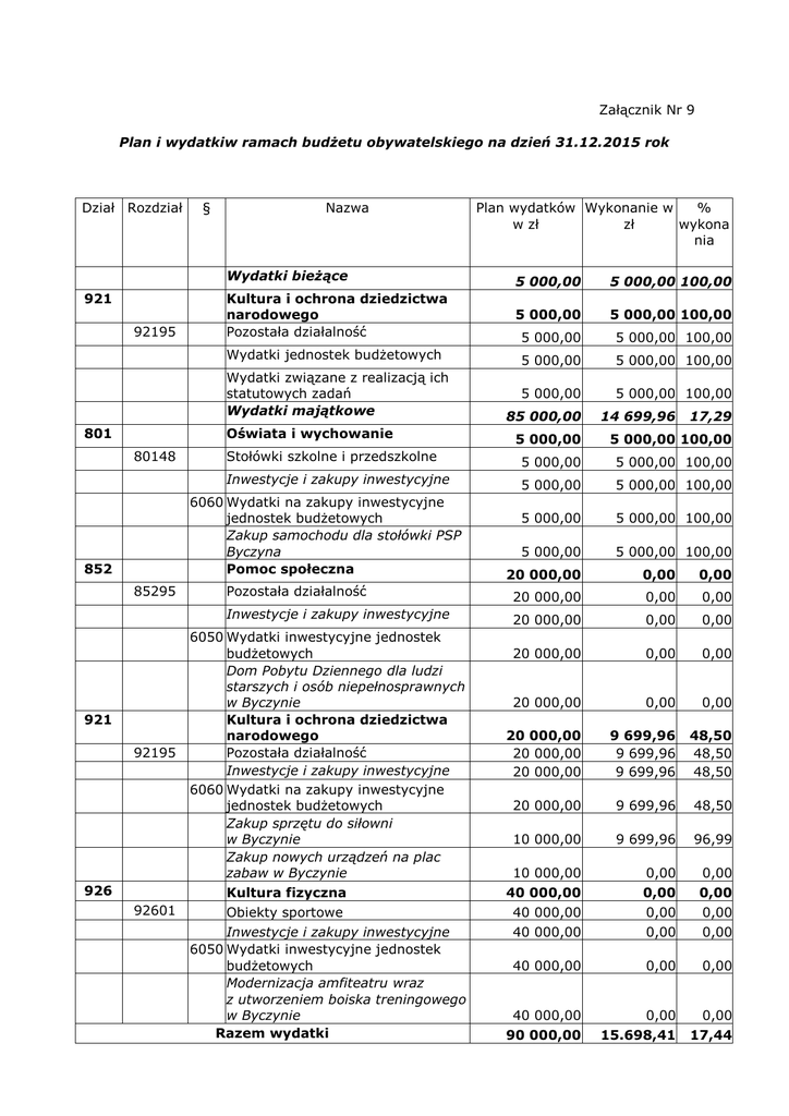 Załącznik Nr 9 Plan i wydatkiw ramach budżetu obywatelskiego na dzień 31.12.2015 rok Dział Rozdział 921 92195 801 § Nazwa Wydatki bieżące 5 000,00 5 000,00 100,00 Kultura i ochrona dziedzictwa narodowego Pozostała działalność 5 000,00 5 000,00 100,00 5 000,00 5 000,00 100,00 Wydatki jednostek budżetowych 5 000,00 5 000,00 100,00 Wydatki związane z realizacją ich statutowych zadań Wydatki majątkowe 5 000,00 5 000,00 100,00 Oświata i wychowanie 80148 85295 921 92195 926 92601 85 000,00 14 699,96 17,29 5 000,00 5 000,00 100,00 Stołówki szkolne i przedszkolne 5 000,00 5 000,00 100,00 Inwestycje i zakupy inwestycyjne 5 000,00 5 000,00 100,00 5 000,00 5 000,00 100,00 5 000,00 5 000,00 100,00 6060 Wydatki na zakupy inwestycyjne jednostek budżetowych Zakup samochodu dla stołówki PSP Byczyna Pomoc społeczna 852 Plan wydatków Wykonanie w % w zł zł wykona nia 20 000,00 0,00 0,00 Pozostała działalność 20 000,00 0,00 0,00 Inwestycje i zakupy inwestycyjne 20 000,00 0,00 0,00 20 000,00 0,00 0,00 20 000,00 0,00 0,00 20 000,00 20 000,00 20 000,00 9 699,96 9 699,96 9 699,96 48,50 48,50 48,50 20 000,00 9 699,96 48,50 10 000,00 9 699,96 96,99 10 000,00 40 000,00 40 000,00 40 000,00 0,00 0,00 0,00 0,00 0,00 0,00 0,00 0,00 40 000,00 0,00 0,00 40 000,00 90 000,00 0,00 15.698,41 0,00 17,44 6050 Wydatki inwestycyjne jednostek budżetowych Dom Pobytu Dziennego dla ludzi starszych i osób niepełnosprawnych w Byczynie Kultura i ochrona dziedzictwa narodowego Pozostała działalność Inwestycje i zakupy inwestycyjne 6060 Wydatki na zakupy inwestycyjne jednostek budżetowych Zakup sprzętu do siłowni w Byczynie Zakup nowych urządzeń na plac zabaw w Byczynie Kultura fizyczna Obiekty sportowe Inwestycje i zakupy inwestycyjne 6050 Wydatki inwestycyjne jednostek budżetowych Modernizacja amfiteatru wraz z utworzeniem boiska treningowego w Byczynie Razem wydatki Wydatki bieżące Wydatki bieżące wykonano w 100% na zakupy artykułów spożywczych, kwiatów, czajnika i termosów na organizację Dnia Kobiet dla 60 osób, na zakup biletów wstępu do Tatrzańskiego Parku Narodowego oraz za przejazd do Zakopanego. Wydatki majątkowe Zakup samochodu dla samochodu dla stołówki PSP Byczyna– w I półroczu tego roku zakupiono samochód dla stołówki przy PSP Byczyna, który rozwozi ciepłe posiłki do pozostałych placówek oświatowych na terenie gminy Byczyna. Środki na ten cel zaplanowane były w budżecie Urzędu Miejskiego w Byczynie oraz w Budżecie Obywatelskim. Dom Pobytu Dziennego dla ludzi starszych i osób niepełnosprawnych w Byczynie – zadanie to ma na celu utworzenie Domu Pobytu Dziennego dla osób starszych i niepełnosprawnych. Zaplanowane wydatki dotyczą opracowania dokumentacji technicznej budynku. Zrezygnowano z realizacji tego zadania. Zakup sprzętu do siłowni w Byczynie – zadanie to miało na celu doposażenie w nowe sprzęty istniejącej już siłowni na terenie miasta Byczyna. W miesiącu marcu zakupiono: Bieżnię Marathon 7.0, 2 sztuki Orbitrek (trenażer) SF1020 Antares, Platformę Wibracyjną masażer PRO 2660, 2 sztuki Rower Treningowy Orion SF1180. Zakup nowych urządzeń na plac zabaw w Byczynie – zrezygnowano z realizacji tego zadania. Wydatki związane z placem zabaw poniesiono z budżetu gminy. Modernizacja amfiteatru wraz z utworzeniem boiska treningowego w Byczynie – zrezygnowano z tego zadania. Przystąpiono do prac, które mają na celu wykonanie tej inwestycji w partnerstwie publiczno-prywatnym.