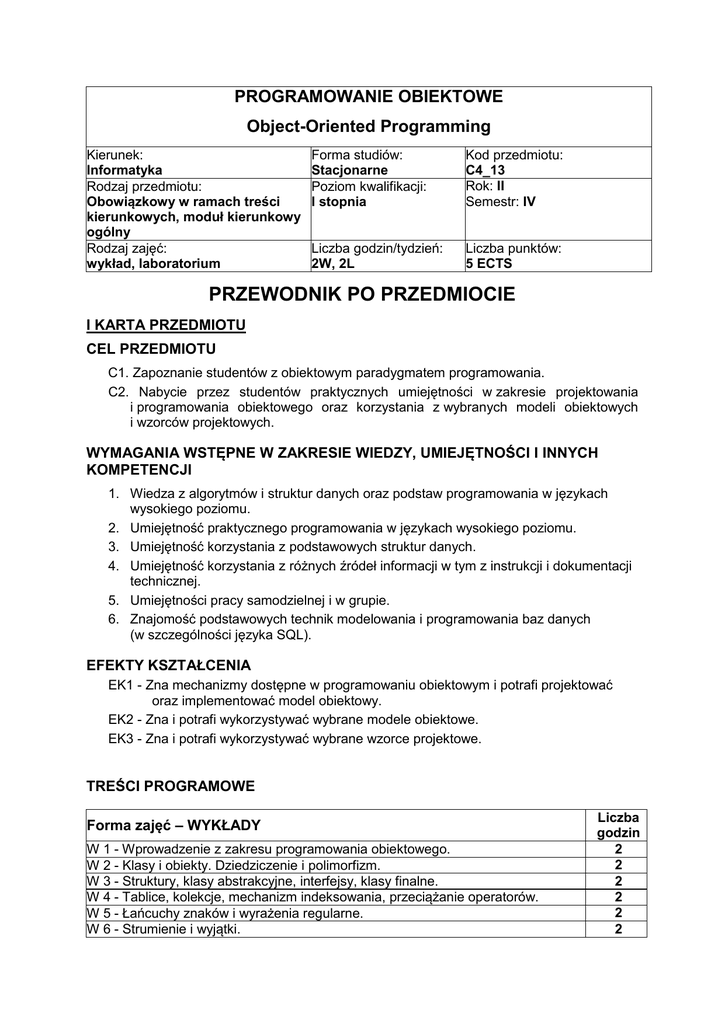 PROGRAMOWANIE OBIEKTOWE Object-Oriented Programming Kierunek: Informatyka Rodzaj przedmiotu: Obowiązkowy w ramach treści kierunkowych, moduł kierunkowy ogólny Rodzaj zajęć: wykład, laboratorium Forma studiów: Stacjonarne Poziom kwalifikacji: I stopnia Kod przedmiotu: C4_13 Rok: II Semestr: IV Liczba godzin/tydzień: 2W, 2L Liczba punktów: 5 ECTS PRZEWODNIK PO PRZEDMIOCIE I KARTA PRZEDMIOTU CEL PRZEDMIOTU C1. Zapoznanie studentów z obiektowym paradygmatem programowania. C2. Nabycie przez studentów praktycznych umiejętności w zakresie projektowania i programowania obiektowego oraz korzystania z wybranych modeli obiektowych i wzorców projektowych. WYMAGANIA WSTĘPNE W ZAKRESIE WIEDZY, UMIEJĘTNOŚCI I INNYCH KOMPETENCJI 1. Wiedza z algorytmów i struktur danych oraz podstaw programowania w językach wysokiego poziomu. 2. Umiejętność praktycznego programowania w językach wysokiego poziomu. 3. Umiejętność korzystania z podstawowych struktur danych. 4. Umiejętność korzystania z różnych źródeł informacji w tym z instrukcji i dokumentacji technicznej. 5. Umiejętności pracy samodzielnej i w grupie. 6. Znajomość podstawowych technik modelowania i programowania baz danych (w szczególności języka SQL). EFEKTY KSZTAŁCENIA EK1 - Zna mechanizmy dostępne w programowaniu obiektowym i potrafi projektować oraz implementować model obiektowy. EK2 - Zna i potrafi wykorzystywać wybrane modele obiektowe. EK3 - Zna i potrafi wykorzystywać wybrane wzorce projektowe. TREŚCI PROGRAMOWE Forma zajęć – WYKŁADY W 1 - Wprowadzenie z zakresu programowania obiektowego. W 2 - Klasy i obiekty. Dziedziczenie i polimorfizm. W 3 - Struktury, klasy abstrakcyjne, interfejsy, klasy finalne. W 4 - Tablice, kolekcje, mechanizm indeksowania, przeciążanie operatorów. W 5 - Łańcuchy znaków i wyrażenia regularne. W 6 - Strumienie i wyjątki. Liczba godzin 2 2 2 2 2 2 W 7 - Dynamiczne struktury danych. W 8 - Podstawy języka UML i projektowanie związków między klasami na podstawie słownego opisu problemu. W 9 - Tworzenie aplikacji okienkowych. Delegacje i zdarzenia. W 10 - Powiązanie modelu obiektowego (logiki aplikacji) z modelem okienkowym (warstwą prezentacyjną). W 11 - Tworzenie aplikacji mających dostęp do danych. W 12 - Idea tworzenia aplikacji mobilnych, sieciowych, wielowątkowych i rozproszonych. W 13 - Idea tworzenia gier w XNA. W 14 - Wzorce projektowe kreacyjne, strukturalne i czynnościowe. Forma zajęć – LABORATORIUM L 1. - Zapoznanie ze narzędziami programistycznymi wykorzystywanymi w ramach laboratorium. L 2. - Klasy i obiekty. Dziedziczenie i polimorfizm. L 3. - Struktury, klasy abstrakcyjne, interfejsy, klasy finalne. L 4. - Tablice, kolekcje, mechanizm indeksowania, przeciążanie operatorów. L 5. - Łańcuchy znaków i wyrażenia regularne. L 6. - Strumienie i wyjątki. L 7. - Dynamiczne struktury danych. L 8. - Podstawy języka UML i projektowanie związków między klasami na podstawie słownego opisu problemu. L 9. - Tworzenie aplikacji okienkowych. Delegacje i zdarzenia. L 10. - Powiązanie modelu obiektowego (logiki aplikacji) z modelem okienkowym (warstwą prezentacyjną). L 11. - Tworzenie aplikacji mających dostęp do danych. L 12. - Idea tworzenia aplikacji mobilnych, sieciowych, wielowątkowych i rozproszonych. L 13. - Idea tworzenia gier w XNA. L 14. - Wzorce projektowe kreacyjne, strukturalne i czynnościowe. 2 2 2 2 2 2 2 4 Liczba godzin 2 2 2 2 2 2 2 2 2 2 2 2 2 4 NARZĘDZIA DYDAKTYCZNE 1. – wykład z wykorzystaniem prezentacji multimedialnych 2. – ćwiczenia laboratoryjne 3. – przykładowe aplikacje w przedstawianych technologiach programistycznych 4. – instrukcje do wykonania ćwiczeń laboratoryjnych 5. – oprogramowanie do tworzenia i testowania oprogramowania SPOSOBY OCENY ( F – FORMUJĄCA, P – PODSUMOWUJĄCA) F1. – ocena przygotowania do ćwiczeń laboratoryjnych F2. – ocena umiejętności stosowania zdobytej wiedzy podczas wykonywania ćwiczeń F3. – ocena aktywności podczas zajęć P1. – ocena umiejętności rozwiązywania postawionych problemów – zaliczenie na ocenę* P2. – ocena opanowania materiału nauczania będącego przedmiotem wykładu – zaliczenie wykładu *) warunkiem uzyskania zaliczenia jest otrzymanie pozytywnych ocen ze wszystkich ćwiczeń laboratoryjnych, OBCIĄŻENIE PRACĄ STUDENTA Forma aktywności Średnia liczba godzin na zrealizowanie aktywności Godziny kontaktowe z prowadzącym 30W 30L 60 h Godziny konsultacji z prowadzącym 5h Zapoznanie się ze wskazaną literaturą 15 h Przygotowanie do ćwiczeń laboratoryjnych 15 h Wykonanie sprawozdań z realizacji ćwiczeń laboratoryjnych (czas poza zajęciami laboratoryjnymi) 10 h Przygotowanie do zaliczenia (kolokwium) 20 h Suma SUMARYCZNA LICZBA PUNKTÓW ECTS DLA PRZEDMIOTU Liczba punktów ECTS, którą student uzyskuje na zajęciach wymagających bezpośredniego udziału prowadzącego Liczba punktów ECTS, którą student uzyskuje w ramach zajęć o charakterze praktycznym, w tym zajęć laboratoryjnych i projektowych 125 h 5 ECTS 2.6 ECTS 2.2 ECTS LITERATURA PODSTAWOWA I UZUPEŁNIAJĄCA 1. Andrew Troelsen, „Język C# 2010 i platforma .NET 4.0”, PWN 2011. 2. Erich Gamma, Richard Helm, Ralph Johnson, John M. Vlissides, „Wzorce projektowe. Elementy oprogramowania obiektowego wielokrotnego użytku”, Helion 2010. 3. Craig Larman, „UML i wzorce projektowe. Analiza i projektowanie obiektowe oraz iteracyjny model wytwarzania aplikacji. Wydanie III”, Helion 2011. PROWADZĄCY PRZEDMIOT ( IMIĘ, NAZWISKO, ADRES E-MAIL) 1. dr hab. inż. Krzysztof Cpałka, prof. P. Cz., [email protected] Odniesienie danego efektu do Efekt efektów Cele Treści Narzędzia kształcenia zdefiniowanych przedmiotu programowe dydaktyczne dla całego programu (PEK) K_W08 K_W13 W1-8 EK1 C1-2 1-5 K_U12 L1-8 K_U16 K_W08 K_W13 W9-13 EK2 C1-2 1-5 K_U12 L9-13 K_U16 K_W08 K_W13 W14-15 EK3 C1-2 1-5 K_U12 L14-15 K_U16 II. FORMY OCENY - SZCZEGÓŁY Sposób oceny 