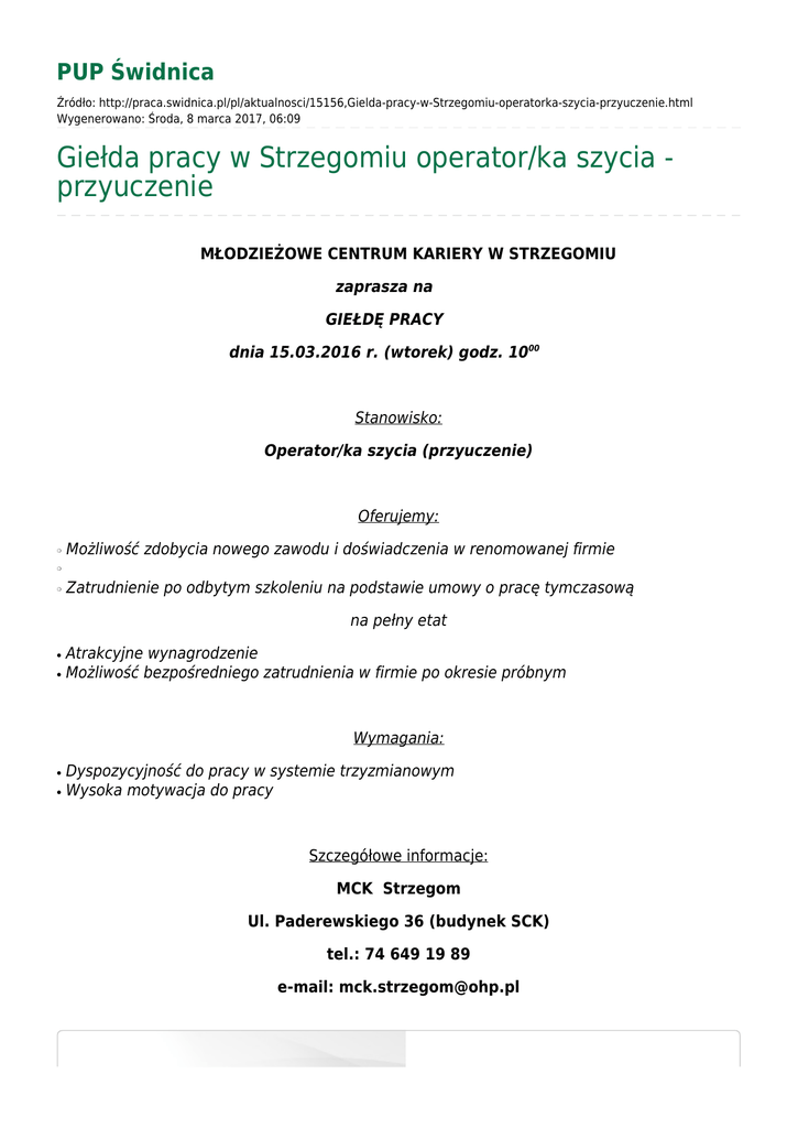 PUP Świdnica Źródło: http://praca.swidnica.pl/pl/aktualnosci/15156,Gielda-pracy-w-Strzegomiu-operatorka-szycia-przyuczenie.html Wygenerowano: Środa, 8 marca 2017, 06:09 Giełda pracy w Strzegomiu operator/ka szycia przyuczenie MŁODZIEŻOWE CENTRUM KARIERY W STRZEGOMIU zaprasza na GIEŁDĘ PRACY dnia 15.03.2016 r. (wtorek) godz. 1000 Stanowisko: Operator/ka szycia (przyuczenie) Oferujemy: ❍ Możliwość zdobycia nowego zawodu i doświadczenia w renomowanej firmie ❍ ❍ Zatrudnienie po odbytym szkoleniu na podstawie umowy o pracę tymczasową na pełny etat ● ● Atrakcyjne wynagrodzenie Możliwość bezpośredniego zatrudnienia w firmie po okresie próbnym Wymagania: ● ● Dyspozycyjność do pracy w systemie trzyzmianowym Wysoka motywacja do pracy Szczegółowe informacje: MCK Strzegom Ul. Paderewskiego 36 (budynek SCK) tel.: 74 649 19 89 e-mail: [email protected] Metryka strony Data publikacji 14.03.2016 Rejestr zmian Osoba publikująca: Krzysztof Bober Autor: Liczba wejść: 469 Drukuj Generuj PDF Powiadom znajomego Wstecz