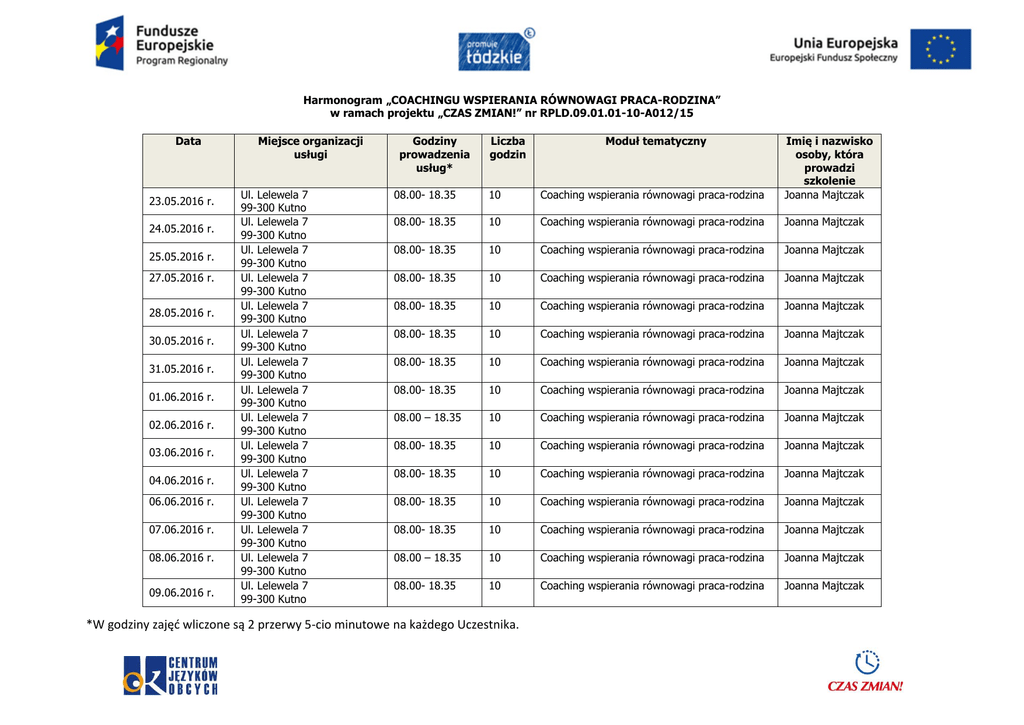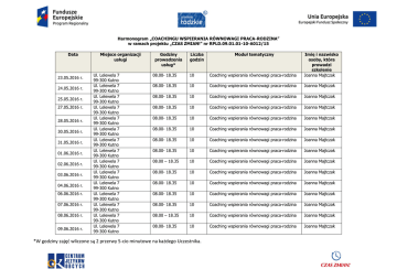 Harmonogram „COACHINGU WSPIERANIA RÓWNOWAGI PRACA-RODZINA” w ramach projektu „CZAS ZMIAN!” nr RPLD.09.01.01-10-A012/15 Data 23.05.2016 r. 24.05.2016 r. 25.05.2016 r. 27.05.2016 r. 28.05.2016 r. 30.05.2016 r. 31.05.2016 r. 01.06.2016 r. 02.06.2016 r. 03.06.2016 r. 04.06.2016 r. 06.06.2016 r. 07.06.2016 r. 08.06.2016 r. 09.06.2016 r. Miejsce organizacji usługi Ul. Lelewela 7 99-300 Kutno Ul. Lelewela 7 99-300 Kutno Ul. Lelewela 7 99-300 Kutno Ul. Lelewela 7 99-300 Kutno Ul. Lelewela 7 99-300 Kutno Ul. Lelewela 7 99-300 Kutno Ul. Lelewela 7 99-300 Kutno Ul. Lelewela 7 99-300 Kutno Ul. Lelewela 7 99-300 Kutno Ul. Lelewela 7 99-300 Kutno Ul. Lelewela 7 99-300 Kutno Ul. Lelewela 7 99-300 Kutno Ul. Lelewela 7 99-300 Kutno Ul. Lelewela 7 99-300 Kutno Ul. Lelewela 7 99-300 Kutno Godziny prowadzenia usług* Liczba godzin 08.00- 18.35 10 Coaching wspierania równowagi praca-rodzina Imię i nazwisko osoby, która prowadzi szkolenie Joanna Majtczak 08.00- 18.35 10 Coaching wspierania równowagi praca-rodzina Joanna Majtczak 08.00- 18.35 10 Coaching wspierania równowagi praca-rodzina Joanna Majtczak 08.00- 18.35 10 Coaching wspierania równowagi praca-rodzina Joanna Majtczak 08.00- 18.35 10 Coaching wspierania równowagi praca-rodzina Joanna Majtczak 08.00- 18.35 10 Coaching wspierania równowagi praca-rodzina Joanna Majtczak 08.00- 18.35 10 Coaching wspierania równowagi praca-rodzina Joanna Majtczak 08.00- 18.35 10 Coaching wspierania równowagi praca-rodzina Joanna Majtczak 08.00 – 18.35 10 Coaching wspierania równowagi praca-rodzina Joanna Majtczak 08.00- 18.35 10 Coaching wspierania równowagi praca-rodzina Joanna Majtczak 08.00- 18.35 10 Coaching wspierania równowagi praca-rodzina Joanna Majtczak 08.00- 18.35 10 Coaching wspierania równowagi praca-rodzina Joanna Majtczak 08.00- 18.35 10 Coaching wspierania równowagi praca-rodzina Joanna Majtczak 08.00 – 18.35 10 Coaching wspierania równowagi praca-rodzina Joanna Majtczak 08.00- 18.35 10 Coaching wspierania równowagi praca-rodzina Joanna Majtczak *W godziny zajęć wliczone są 2 przerwy 5-cio minutowe na każdego Uczestnika. Moduł tematyczny 10.06.2016 r. 11.06.2016 r. 13.06.2016 r. 14.06.2016 r. 15.06.2016 r. 16.06.2016 r. Ul. Lelewela 7 99-300 Kutno Ul. Lelewela 7 99-300 Kutno Ul. Lelewela 7 99-300 Kutno Ul. Lelewela 7 99-300 Kutno Ul. Lelewela 7 99-300 Kutno Ul. Lelewela 7 99-300 Kutno 08.00- 18.35 10 Coaching wspierania równowagi praca-rodzina Joanna Majtczak 08.00- 18.35 10 Coaching wspierania równowagi praca-rodzina Joanna Majtczak 08.00- 18.35 10 Coaching wspierania równowagi praca-rodzina Joanna Majtczak 08.00- 18.35 10 Coaching wspierania równowagi praca-rodzina Joanna Majtczak 08.00- 18.35 10 Coaching wspierania równowagi praca-rodzina Joanna Majtczak 08.00- 18.35 10 Coaching wspierania równowagi praca-rodzina Joanna Majtczak *W godziny zajęć wliczone są 2 przerwy 5-cio minutowe na każdego Uczestnika.