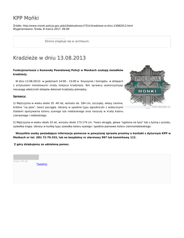 KPP Mońki Źródło: http://www.monki.policja.gov.pl/p10/aktualnosci/7314,Kradzieze-w-dniu-13082013.html Wygenerowano: Środa, 8 marca 2017, 06:09 Strona znajduje się w archiwum. Kradzieże w dniu 13.08.2013 Funkcjonariusze z Komendy Powiatowej Policji w Monkach szukają świadków kradzieży. W dniu 13.08.2013r. w godzinach 14:00 – 15:00 w Knyszynie i Goniądzu w sklepach z artykułami metalowymi miały miejsce kradzieże. N/n sprawcy wykorzystując nieuwagę właścicieli sklepów dokonali kradzieży pieniędzy. Sprawcy: 1) Mężczyzna w wieku około 35 -40 lat, wzrostu ok. 184 cm, szczupły, włosy ciemne, krótkie "na jeża", twarz pociągła. Ubrany w spodnie typu ogrodniczki z widocznymi śladami spożywania koloru szarego lub niebieskiego oraz koszulę w kratę koloru czerwonego i niebieskiego. 2) Mężczyzna w wieku około 33 lat, wzrostu około 173-174 cm. Twarz okrągła, głowa "ogolona na łyso" lub z łysiną z przodu, sylwetka krępa. Ubrany w kurtkę typu szwedka koloru szarego i spodnie jeansowe koloru ciemnoniebieskiego. Wszystkie osoby posiadające informacje pomocne w powyższej sprawie prosimy o kontakt z dyżurnym KPP w Mońkach nr tel. (85) 72-79-333, lub na bezpłatny nr alarmowy 997 lub komórkowy 112. Z góry dziękujemy za udzieloną pomoc. Ocena: 0/5 (0) Tweetnij