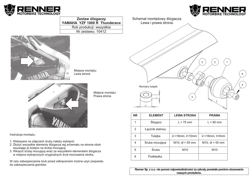 Zestaw œlizgaczy YAMAHA YZF 1000 R Thunderace Rok produkcji: wszystkie Nr zestawu: 10412 Schemat monta¿owy œlizgacza. Lewa i prawa strona. 3 2 1 Miejsce monta¿u Lewa strona 6 5 Wymiary tulejek: 4 t Miejsce monta¿u Prawa strona L d NR ELEMENT LEWA STRONA PRAWA 1 Œlizgacz L = 75 mm L = 80 mm 2 £¹cznik stalowy Instrukcja monta¿u: 3 Tulejka d =18mm, t=10mm d =16mm, t=5mm 1. Wskazane na zdjêciach œruby nale¿y wykrêciæ. 2. Z³o¿yæ wszystkie elementy œlizgacza wg schematu na stronie obok wsuwaj¹c je kolejno na œrubê mocuj¹c¹. 3. Wkrêciæ œrubê mocuj¹c¹ wraz ze wszystkimi elementami œlizgacza w miejsce wykrêconych oryginalnych œrub mocowania silnika. 4 Œruba mocuj¹ca M10, d³ = 55 mm M10, d³ = 55 mm 5 Œruba M10 6 Podk³adka M10 W celu zabezpieczenia œrub przed odkrêceniem mo¿na u¿yæ preparatu do zabezpieczania gwintów. Renner Sp. z o.o. nie ponosi odpowiedzialnoœci za szkody powsta³e pomimo stosowania naszych produktów.