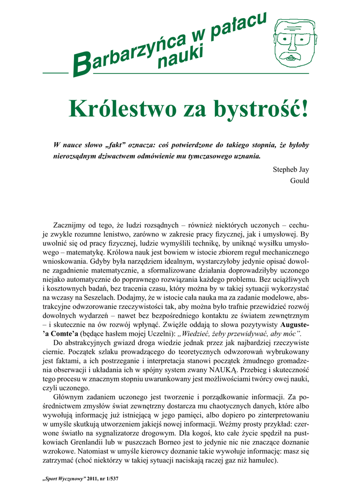 176 B cu a ł a p Barbarzyńca w pałacu nauki w a ńc ki y z r nau arba Królestwo za bystrość! W nauce słowo „fakt” oznacza: coś potwierdzone do takiego stopnia, że byłoby nierozsądnym dziwactwem odmówienie mu tymczasowego uznania. Stepheb Jay Gould Zacznijmy od tego, że ludzi rozsądnych – również niektórych uczonych – cechuje zwykle rozumne lenistwo, zarówno w zakresie pracy fizycznej, jak i umysłowej. By uwolnić się od pracy fizycznej, ludzie wymyślili technikę, by uniknąć wysiłku umysłowego – matematykę. Królowa nauk jest bowiem w istocie zbiorem reguł mechanicznego wnioskowania. Gdyby była narzędziem idealnym, wystarczyłoby jedynie opisać dowolne zagadnienie matematycznie, a sformalizowane działania doprowadziłyby uczonego niejako automatycznie do poprawnego rozwiązania każdego problemu. Bez uciążliwych i kosztownych badań, bez tracenia czasu, który można by w takiej sytuacji wykorzystać na wczasy na Seszelach. Dodajmy, że w istocie cała nauka ma za zadanie modelowe, abstrakcyjne odwzorowanie rzeczywistości tak, aby można było trafnie przewidzieć rozwój dowolnych wydarzeń – nawet bez bezpośredniego kontaktu ze światem zewnętrznym – i skutecznie na ów rozwój wpłynąć. Zwięźle oddają to słowa pozytywisty Auguste’a Comte’a (będące hasłem mojej Uczelni): „Wiedzieć, żeby przewidywać, aby móc”. Do abstrakcyjnych gwiazd droga wiedzie jednak przez jak najbardziej rzeczywiste ciernie. Początek szlaku prowadzącego do teoretycznych odwzorowań wybrukowany jest faktami, a ich postrzeganie i interpretacja stanowi początek żmudnego gromadzenia obserwacji i układania ich w spójny system zwany NAUKĄ. Przebieg i skuteczność tego procesu w znacznym stopniu uwarunkowany jest możliwościami twórcy owej nauki, czyli uczonego. Głównym zadaniem uczonego jest tworzenie i porządkowanie informacji. Za pośrednictwem zmysłów świat zewnętrzny dostarcza mu chaotycznych danych, które albo wywołują informację już istniejącą w jego pamięci, albo dopiero po zinterpretowaniu w umyśle skutkują utworzeniem jakiejś nowej informacji. Weźmy prosty przykład: czerwone światło na sygnalizatorze drogowym. Dla kogoś, kto całe życie spędził na pustkowiach Grenlandii lub w puszczach Borneo jest to jedynie nic nie znaczące doznanie wzrokowe. Natomiast w umyśle kierowcy doznanie takie wywołuje informację: masz się zatrzymać (choć niektórzy w takiej sytuacji naciskają raczej gaz niż hamulec). „Sport Wyczynowy” 2011, nr 1/537 Królestwo za bystrość! 177 Fakt, czyli jakiś istniejący w rzeczywistości przedmiot, zjawisko lub proces, może być odwzorowany w umyśle człowieka – również uczonego – na trzy sposoby: jako pomiar, obserwacja lub interpretacja. Pomiar polega na dokładnej, powtarzalnej ocenie określonego aspektu danego faktu, na ogół przy użyciu jakichś urządzeń technicznych. Odznacza się wysokim poziomem obiektywności (czyli niezależnością od czynników emocjonalnych), na ogół wysoką dokładnością, ale niską wymiarowością. Krótko mówiąc, pomiar jest dokładny, powtarzalny i obiektywny, ściśle zakorzeniony w rzeczywistości, ale jednowymiarowy. Obserwacja – to ocena doznań zmysłowych. Jest bardziej subiektywna niż pomiar, czyli mają na nią wpływ czynniki emocjonalne i intelektualne obserwatora. Ujmuje więcej wymiarów faktu, ale tylko tych, które wynikają z doznań zmysłowych. Obserwacja jest więc niezbyt dokładna, a zatem cechuje się również niską powtarzalnością, jest w znacznej mierze subiektywna, wymaga kontaktu z rzeczywistością – ale jest kilkuwymiarowa. Kontaktu takiego nie wymaga natomiast interpretacja. Jest mało powtarzalna, mało dokładna, wysoce subiektywna. Ma jednak pewną niezaprzeczalna zaletę: może sięgać do takich cech faktu, które nie są dostępne ani obserwacji, ani – tym bardziej – pomiarom. Interpretacja jest zatem mało dokładna, mało powtarzalna, wysoce subiektywna, ale za to może być całkowicie oderwana od rzeczywistości i wielowymiarowa. Podsumowując, naturalnym środowiskiem pomiaru jest rzeczywistość, naturalnym środowiskiem interpretacji – abstrakcja, istniejąca jedynie w umyśle człowieka. Obserwacja tkwi gdzieś pośrodku. Podkreślmy, że w swej najgłębszej istocie nauka – w odróżnieniu od techniki – jest całkowicie abstrakcyjna. Zwróćmy uwagę na to, że dokładność postrzega się zwykle jako wielką zaletę pomiarów, jej brak zaś – za wadę interpretacji. Jednakże nadmiar szczegółów może... utrudnić poznawanie rzeczywistości, dostrzeganie rzeczy najistotniejszych. Nie bez kozery wybitny psycholog, William James, stwierdził niegdyś, że geniusz polega na tym, by wiedzieć, co należy przeoczyć. W przypadku starannie wykonanego pomiaru o jakimkolwiek przeoczeniu nie ma jednak mowy. Podstawą geniuszu może być tylko interpretacja, pomiar stanowi zaś główny surowiec naukowego rzemiosła. Majstrowanie przy interpretacjach przypomina nieco pracę minera: może dać bardzo widowiskowe skutki, ale wiąże się ze znacznym ryzykiem. Natomiast oporządzanie pomiarów jest w istocie zabiegiem hodowlanym: nie poskutkuje wprawdzie jakimiś sensacyjnymi odkryciami, ale jest bezpieczne, pewne i spokojne. Można by zatem ułożyć swoistą skalę, której granicą (w sensie matematycznym) po stronie pomiarów jest sytuacja, w której wiemy wszystko o niczym, a po stronie interpretacji – sytuacja, w której wiemy nic o wszystkim. Na wzór heisenbergowskiej zasady nieoznaczoności można by zatem sformułować regułę, że im więcej szczegółów zawiera jakieś odwzorowanie rzeczywistości, tym mniej ma wymiarów, im zaś jest bardziej wielowymiarowe, tym mniej szczegółowe. Niemniej jedno należy stwierdzić wyraźnie: i obserwacja, i pomiar, i interpretacja są jedynie uproszczonymi i niepełnymi odwzorowaniami rzeczywistości, więc żadnego z n