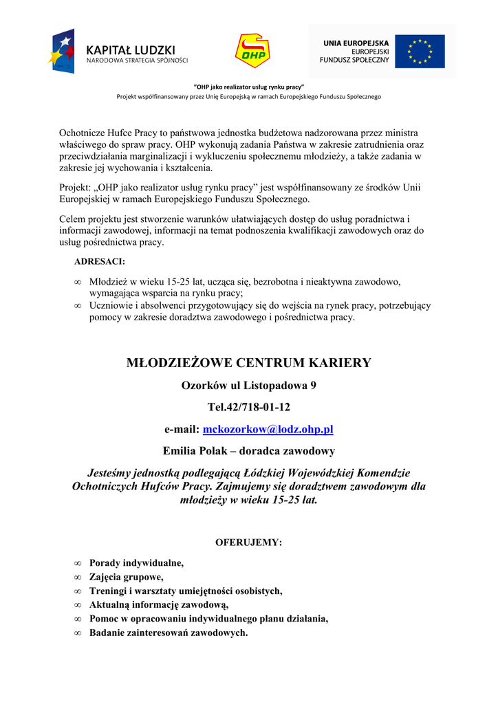 ”OHP jako realizator usług rynku pracy” Projekt współfinansowany przez Unię Europejską w ramach Europejskiego Funduszu Społecznego Ochotnicze Hufce Pracy to państwowa jednostka budŜetowa nadzorowana przez ministra właściwego do spraw pracy. OHP wykonują zadania Państwa w zakresie zatrudnienia oraz przeciwdziałania marginalizacji i wykluczeniu społecznemu młodzieŜy, a takŜe zadania w zakresie jej wychowania i kształcenia. Projekt: „OHP jako realizator usług rynku pracy” jest współfinansowany ze środków Unii Europejskiej w ramach Europejskiego Funduszu Społecznego. Celem projektu jest stworzenie warunków ułatwiających dostęp do usług poradnictwa i informacji zawodowej, informacji na temat podnoszenia kwalifikacji zawodowych oraz do usług pośrednictwa pracy. ADRESACI: • • MłodzieŜ w wieku 15-25 lat, ucząca się, bezrobotna i nieaktywna zawodowo, wymagająca wsparcia na rynku pracy; Uczniowie i absolwenci przygotowujący się do wejścia na rynek pracy, potrzebujący pomocy w zakresie doradztwa zawodowego i pośrednictwa pracy. MŁODZIEśOWE CENTRUM KARIERY Ozorków ul Listopadowa 9 Tel.42/718-01-12 e-mail: [email protected] Emilia Polak – doradca zawodowy Jesteśmy jednostką podlegającą Łódzkiej Wojewódzkiej Komendzie Ochotniczych Hufców Pracy. Zajmujemy się doradztwem zawodowym dla młodzieŜy w wieku 15-25 lat. OFERUJEMY: • • • • • • Porady indywidualne, Zajęcia grupowe, Treningi i warsztaty umiejętności osobistych, Aktualną informację zawodową, Pomoc w opracowaniu indywidualnego planu działania, Badanie zainteresowań zawodowych. PUNKT POŚREDNICTWA PRACY Ozorków ul. Listopadowa 9a pok. 109 Tel.: (42) 716-06-16 e-mail: [email protected] Monika Pietruszewska – pośrednik pracy Jesteśmy jednostką podlegającą Łódzkiej Wojewódzkiej Komendzie Ochotniczych Hufców Pracy. Zajmujemy się pośrednictwem pracy dla młodzieŜy w wieku 15-25 lat. OFERUJEMY: • • • Oferty pracy krótkoterminowej i stałej dla osób uczących się, Pośrednictwo pracy dla osób bezrobotnych, Udzielanie pomocy w wyborze właściwej oferty. Podczas rejestracji potrzebne będą: Legitymacja szkolna Dowód osobisty (w przypadku osób pełnoletnich)