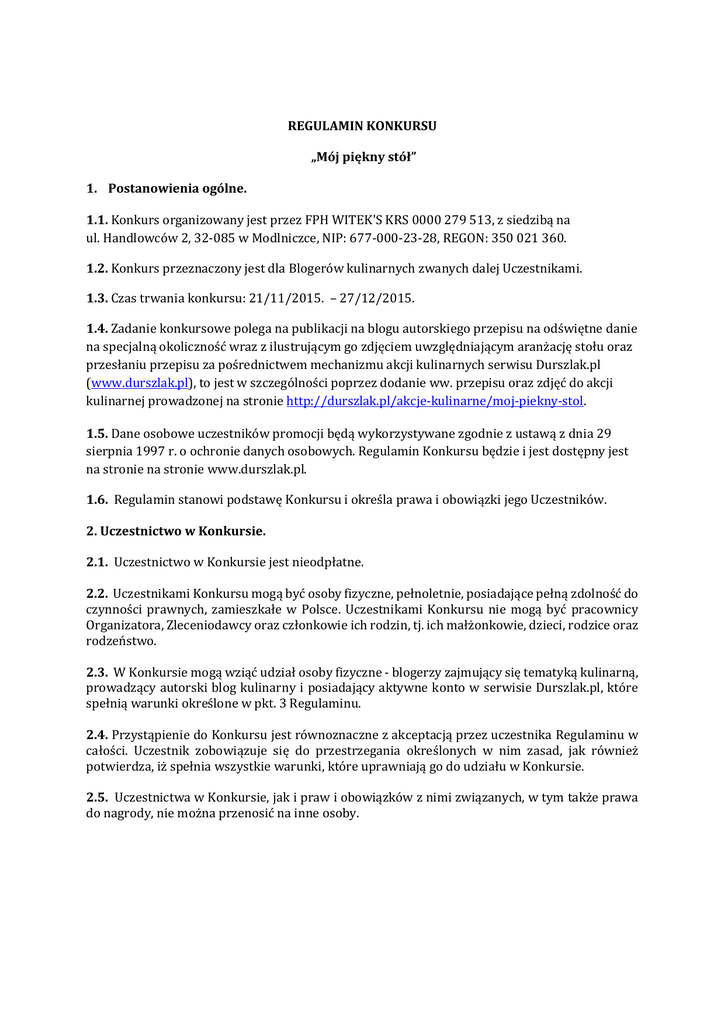 REGULAMIN KONKURSU „Mój piękny stół” 1. Postanowienia ogólne. 1.1. Konkurs organizowany jest przez FPH WITEK'S KRS 0000 279 513, z siedzibą na ul. Handlowców 2, 32-085 w Modlniczce, NIP: 677-000-23-28, REGON: 350 021 360. 1.2. Konkurs przeznaczony jest dla Blogerów kulinarnych zwanych dalej Uczestnikami. 1.3. Czas trwania konkursu: 21/11/2015. – 27/12/2015. 1.4. Zadanie konkursowe polega na publikacji na blogu autorskiego przepisu na odświętne danie na specjalną okoliczność wraz z ilustrującym go zdjęciem uwzględniającym aranżację stołu oraz przesłaniu przepisu za pośrednictwem mechanizmu akcji kulinarnych serwisu Durszlak.pl (www.durszlak.pl), to jest w szczególności poprzez dodanie ww. przepisu oraz zdjęć do akcji kulinarnej prowadzonej na stronie http://durszlak.pl/akcje-kulinarne/moj-piekny-stol. 1.5. Dane osobowe uczestników promocji będą wykorzystywane zgodnie z ustawą z dnia 29 sierpnia 1997 r. o ochronie danych osobowych. Regulamin Konkursu będzie i jest dostępny jest na stronie na stronie www.durszlak.pl. 1.6. Regulamin stanowi podstawę Konkursu i określa prawa i obowiązki jego Uczestników. 2. Uczestnictwo w Konkursie. 2.1. Uczestnictwo w Konkursie jest nieodpłatne. 2.2. Uczestnikami Konkursu mogą być osoby fizyczne, pełnoletnie, posiadające pełną zdolność do czynności prawnych, zamieszkałe w Polsce. Uczestnikami Konkursu nie mogą być pracownicy Organizatora, Zleceniodawcy oraz członkowie ich rodzin, tj. ich małżonkowie, dzieci, rodzice oraz rodzeństwo. 2.3. W Konkursie mogą wziąć udział osoby fizyczne - blogerzy zajmujący się tematyką kulinarną, prowadzący autorski blog kulinarny i posiadający aktywne konto w serwisie Durszlak.pl, które spełnią warunki określone w pkt. 3 Regulaminu. 2.4. Przystąpienie do Konkursu jest równoznaczne z akceptacją przez uczestnika Regulaminu w całości. Uczestnik zobowiązuje się do przestrzegania określonych w nim zasad, jak również potwierdza, iż spełnia wszystkie warunki, które uprawniają go do udziału w Konkursie. 2.5. Uczestnictwa w Konkursie, jak i praw i obowiązków z nimi związanych, w tym także prawa do nagrody, nie można przenosić na inne osoby. 3. Przebieg i warunki udziału w Konkursie. 3.1. Konkurs polega na przygotowaniu i przesłaniu autorskiego przepisu (określonego w pkt. 1.4 Regulaminu) na odświętne danie na specjalną okoliczność wraz z ilustrującym go zdjęciem uwzględniającym aranżację stołu według zasad zamieszczonych na stronie http://durszlak.pl/akcje-kulinarne/moj-piekny-stol. 3.2. Aby zgłosić przepis należy: 3.2.1. przygotować przepis na odświętne danie na specjalną okoliczność, 3.2.2. zrobić zdjęcie dania oraz aranżacji stołu, 3.2.3. opublikować przepis wraz ze zdjęciem w formie wpisu na prowadzonym przez Uczestnika blogu, 3.2.4. pod wpisem wstawić aktywny link do sklepu: www.mojpieknystol.pl, 3.2.5. zgłosić wpis z daniem, deserem lub ciastem konkursowym oraz wraz ze stosownym zdjęciem do Konkursu za pośrednictwem strony: http://durszlak.pl/akcjekulinarne/moj-piekny-stol. Jeden Uczestnik może zgłosić maksymalnie 4 przepisy do akcji konkursowej. 3.2.6. W przepisie oraz na zdjęciach zgłoszonych do konkursu nie mogą być lokowane produkty żadnych innych marek. 3.3. Poprzez zgłoszenie przepisu do Konkursu w sposób wyżej określony, Uczestnik Konkursu oświadcza, że treść i forma każdej z zamieszczonych wypowiedzi konkursowych nie narusza przepisów prawa, ani prawem chronionych dóbr osób trzecich, a uczestnik Konkursu jest w pełni uprawniony do zgłoszenia każdej z wypowiedzi konkursowych. 3.4. Z tytułu złożonego powyżej oświadczenia Uczestnik przyjmuje na siebie pełną odpowiedzialność prawną. W przypadku jakichkolwiek roszczeń ze strony osób trzecich Uczestnik, po zawiadomieniu go przez Organizatora, nie uchyli się od niezwłocznego przystąpienia do wyjaśnienia sprawy oraz wystąpi przeciwko takim roszczeniom na własny koszt i ryzyko, a nadto zaspokoi wszelkie uzasadnione roszczenia, a w razie ich zasądzenia od Organizatora, regresowo zwróci całość pokrytych roszczeń oraz wszelkie związane z tym wydatki i opłaty, włączając w to koszty procesu i obsługi prawnej, a także naprawi wszelkie inne szkody wynikające z wyżej opisanych roszczeń osób trzecich. 3.5. Uczestnicy konkursu wyrażają zgodę na korzystanie przez Organizatora konkursu i Zleceniodawcę z autorskich praw majątkowych do zgłoszonego przepisu a także wszelkich Utworów będących składnikami Zgłoszenia (w szczególności takich jak zdjęcia), w sytuacji gdy ich przepisy zostaną nagrodzone lub wyróżnione, bez ograniczeń terytorialnych i czasowych na następujących polach eksploatacji: 3.5.1. wprowadzanie do pamięci komputera, publiczne wykonanie albo publiczne odtwarzanie, publikacja w Internecie na następujących stronach: www.mojpieknystol.pl, www.witeks.pl, a także na stronie www.durszlak.pl. 3.5.2. publikowanie, publiczne odtwarzanie i przedrukowywanie na materiałach promocyjno-informacyjnych FPH WITEK'S, wykorzystywanych w ramach komunikacji wewnętrznej i zewnętrznej. 3.6. Powyższa zgoda określona w pkt. 3.5. jest równoznaczna z przekazaniem praw autorskich w zakresie jak wyżej przez Uczestnika, w zamian za otrzymaną nagrodę w konkursie. Dodatkowo, Uczestnicy wyrażają zgodę na użycie ich wizerunków w zakresie wskazanym powyżej w wypadku przyznania im nagród określonych w pkt. 4.3.1. , 4.3.2. i 4.3.3. 4. Zasady wyłaniania zwycięzców w konkursie, skład Jury oraz Nagrody. 4.1. Finalistów Konkursu ze wskazaniem nagrodzonych przepisów wybiera Jury Konkursowe. 4.2. Ocenie w konkursie podlegać będą: kreatywne podejście do przygotowania dania, atrakcyjność jego podania oraz aranżacja stołu na zamieszczonym przez Uczestnika zdjęciu. 4.3. Zwycięzca będzie wyłoniony na podstawie niezależnej, kolegialnej decyzji Jury, wydanej nie później niż 14 dni p