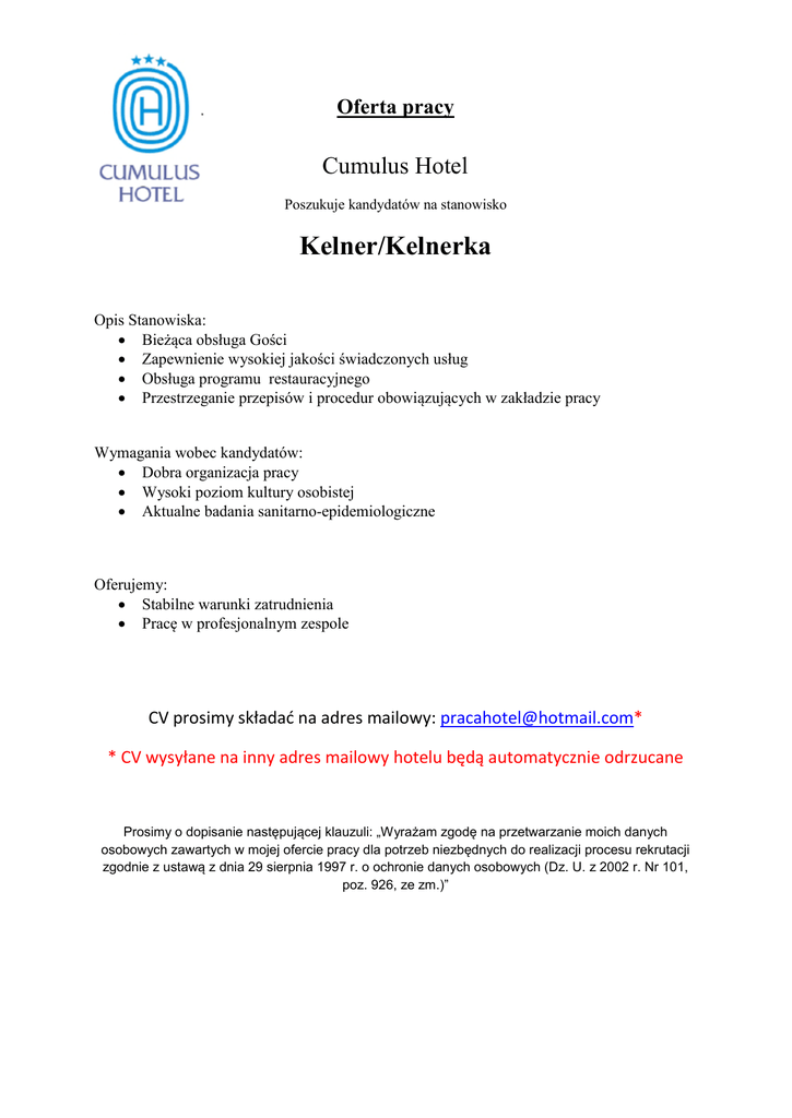 Oferta pracy Cumulus Hotel Poszukuje kandydatów na stanowisko Kelner/Kelnerka Opis Stanowiska: Bieżąca obsługa Gości Zapewnienie wysokiej jakości świadczonych usług Obsługa programu restauracyjnego Przestrzeganie przepisów i procedur obowiązujących w zakładzie pracy Wymagania wobec kandydatów: Dobra organizacja pracy Wysoki poziom kultury osobistej Aktualne badania sanitarno-epidemiologiczne Oferujemy: Stabilne warunki zatrudnienia Pracę w profesjonalnym zespole CV prosimy składać na adres mailowy: [email protected]* * CV wysyłane na inny adres mailowy hotelu będą automatycznie odrzucane Prosimy o dopisanie następującej klauzuli: „Wyrażam zgodę na przetwarzanie moich danych osobowych zawartych w mojej ofercie pracy dla potrzeb niezbędnych do realizacji procesu rekrutacji zgodnie z ustawą z dnia 29 sierpnia 1997 r. o ochronie danych osobowych (Dz. U. z 2002 r. Nr 101, poz. 926, ze zm.)”