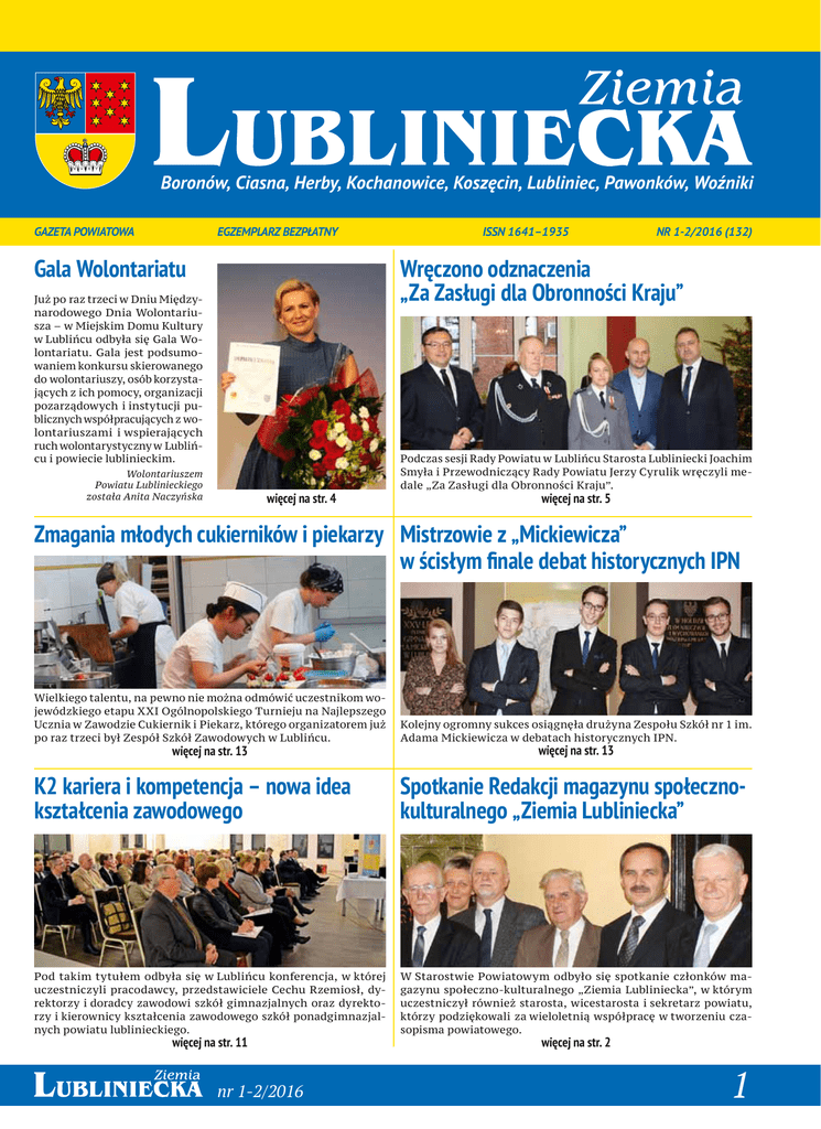 Boronów, Ciasna, Herby, Kochanowice, Koszęcin, Lubliniec, Pawonków, Woźniki GAZETA POWIATOWA EGZEMPLARZ BEZPŁATNY Gala Wolontariatu ISSN 1641–1935 NR 1-2/2016 (132) Wręczono odznaczenia „Za Zasługi dla Obronności Kraju” Już po raz trzeci w Dniu Międzynarodowego Dnia Wolontariusza – w Miejskim Domu Kultury w Lublińcu odbyła się Gala Wolontariatu. Gala jest podsumowaniem konkursu skierowanego do wolontariuszy, osób korzystających z ich pomocy, organizacji pozarządowych i instytucji publicznych współpracujących z wolontariuszami i wspierających ruch wolontarystyczny w Lublińcu i powiecie lublinieckim. Wolontariuszem Powiatu Lublinieckiego została Anita Naczyńska więcej na str. 4 Podczas sesji Rady Powiatu w Lublińcu Starosta Lubliniecki Joachim Smyła i Przewodniczący Rady Powiatu Jerzy Cyrulik wręczyli medale „Za Zasługi dla Obronności Kraju”. więcej na str. 5 Zmagania młodych cukierników i piekarzy Mistrzowie z „Mickiewicza” w ścisłym finale debat historycznych IPN Wielkiego talentu, na pewno nie można odmówić uczestnikom wojewódzkiego etapu XXI Ogólnopolskiego Turnieju na Najlepszego Ucznia w Zawodzie Cukiernik i Piekarz, którego organizatorem już po raz trzeci był Zespół Szkół Zawodowych w Lublińcu. Kolejny ogromny sukces osiągnęła drużyna Zespołu Szkół nr 1 im. Adama Mickiewicza w debatach historycznych IPN. K2 kariera i kompetencja – nowa idea kształcenia zawodowego Spotkanie Redakcji magazynu społecznokulturalnego „Ziemia Lubliniecka” Pod takim tytułem odbyła się w Lublińcu konferencja, w której uczestniczyli pracodawcy, przedstawiciele Cechu Rzemiosł, dyrektorzy i doradcy zawodowi szkół gimnazjalnych oraz dyrektorzy i kierownicy kształcenia zawodowego szkół ponadgimnazjalnych powiatu lublinieckiego. W Starostwie Powiatowym odbyło się spotkanie członków magazynu społeczno-kulturalnego „Ziemia Lubliniecka”, w którym uczestniczył również starosta, wicestarosta i sekretarz powiatu, którzy podziękowali za wieloletnią współpracę w tworzeniu czasopisma powiatowego. więcej na str. 13 więcej na str. 11 nr 1-2/2016 więcej na str. 13 więcej na str. 2 1 „Ziemia Lubliniecka” – 15 lat minęło Drodzy Czytelnicy! W 2000 r. ukazał się pierwszy numer naszej gazety samorządowej. Do końca 2006 r. ukazały się 42 wydania gazety powiatowej. W 2007 r. zmianie uległa formuła wydawania gazety i „Ziemia Lubliniecka” zaczęła ukazywać się jako kwartalnik społeczno-kulturalny, a od 2009 r. stał się magazynem społeczno-kulturalnym. Ogółem w latach 2007 – 2015 ukazało się 27 wydań magazynu społeczno-kulturalnego „Ziemia Lubliniecka”, w których na 572 stronach w ydrukowano 445 artykułów. Jednocześnie od 2008 r. ukazuje się gazeta powiatowa jako informator o bieżących wydarzeniach i działaniach w naszym powiecie. W latach 2008 -2015 w ok. 70 wydaniach na ponad 1120 stronach, ukazało się kilka tysięcy artykułów, felietonów oraz relacji, sprawozdań, informacji, ogłoszeń, a także setki zdjęć i ilustracji. Skład Redakcji w tym okresie zmieniał się kilkukrotnie. Od 2004 r. powołano Kolegium Redakcyjne, a funkcję redaktora naczelnego pełnił Jan Myrcik. Od 2014 r. redaktorem naczelnym jest Bogusław Hrycyk. Od początku w skład Redakcji wchodzili: Kazimierz Bromer, Gerard Burek i Maria Doleżych oraz sekretarze Redakcji: Aneta Konieczny i Justyna Pasiak. Aktualny skład Redakcji tworzą: Arkadiusz Baron, Krzysztof Kanclerz, Marzena Koza, Andrzej Musioł, Wojciech Poznański, Edward Przebieracz, Sebastian Ziółek i Mariusz Żymierski. Autorami artykułów oprócz członków Redakcji, radnych i pracowników samorządowych byli przedstawiciele instytucji i stowarzyszeń, nauczyciele, uczniowie oraz mieszkańcy powiatu. Wielu z nich wykazało się wielką aktywnością społeczną, talentem, pasją i wiedzą. Na szczególne wyróżnienie zasłużyli: Krystyna Bartocha, Le- sław Bidziński, Piotr Chmiel, Damian Gołąbek, Edward Goszyk, Michał Janusz, Andrzej Rojek i Czesław Tyrol. Ponadto autorami artykułów byli: J. Bednarz, M. Berbesz, J. Bula, H. Czaj, E. Czerny, Z. Chromik, M. Chrząstek, M. Doleżych-Szymiczek, M. Dziuk, M. Filipiak, G. Giwers, H. Grzechac, J. Jaźwińska, J. Kaczmarczyk, J. Kisów-Dziembala, T. Kołodziej, S. Kowalczyk, A. Koza, M. Krupska, J. Kucharski, H. Lasota, Ks. P. Mańka, J. Mielczarek, S. Moryson-Stoksik, H. Nowak, P. Parys, P. Pasiak, P. Pietrzkiewicz, D. Piosek, M. Pisarek, M. Pisarkiewicz-Sieradz, E. Pokaczajło, K. Polaczek, G. Pyka, B. Szczech, S. Szczepanik, S. Wieczorek, H. Witczak, Ks. A. Zając, S. Zoń. Wszystkim należą się serdeczne podziękowania, gratulacje i wdzięczność za to, że wzbogacają wiedzę o historii i kulturze naszej „Małej Ojczyzny” przyczyniając się do integracji i edukacji mieszkańców naszego powiatu. Osobne podziękowania należą się kolejnym Starostom i Radnym Rady Powiatu, którzy wykazują zrozumienie dla potrzeb społeczeństwa. Na zakończenie pragnę także podziękować gorąco wszystkim członkom Redakcji, którzy pracując honorowo i realizując swoje pasje w największym stopniu tworzą naszą „Ziemię Lubliniecką”. Z poważaniem Bogusław Hrycyk Redaktor Naczelny Spotkanie Redakcji magazynu społecznokulturalnego „Ziemia Lubliniecka” W Starostwie Powiatowym odbyło się spotkanie członków magazynu społeczno-kulturalnego „Ziemia Lubliniecka”, w którym uczestniczył również starosta, wicestarosta i sekretarz powiatu, którzy podziękowali za wieloletnią współpracę w tworzeniu czasopisma powiatowego. Podczas spotkania starosta wraz z redaktorem naczelnym Bogusławem Hrycykiem pożegnali odchodzących z Redakcji: Jana Myrcika i Kazimierza Bromera. – Pragniemy serdecznie podziękować Panom za pracę w Kolegium Redakcyjnym magazynu społeczno-kulturalnego „Ziemia Lubliniecka. Minęło już 15 lat od kiedy ukazuje się czasopismo i trafi