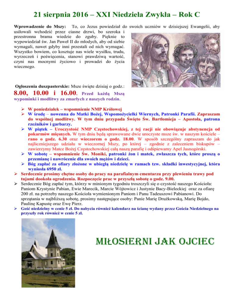 21 sierpnia 2016 – XXI Niedziela Zwykła – Rok C Wprowadzenie do Mszy: To, co Jezus powiedział do swoich uczniów w dzisiejszej Ewangelii, aby usiłowali wchodzić przez ciasne drzwi, bo szeroka i przestronna brama wiedzie do zguby. Pięknie to wypowiedział św. Jan Paweł II do młodych, aby od siebie wymagali, nawet gdyby inni przestali od nich wymagać. Wszystko bowiem, co kosztuje nas wiele wysiłku, trudu, wyrzeczeń i poświęcenia, stanowi prawdziwą wartość, czyni nas mocnymi życiowo i prowadzi do życia wiecznego. Ogłoszenia duszpasterskie: Msze święte dzisiaj o godz.: 8.00, 10.00 i 16.00. Przed każdą Mszą wypominki i modlitwy za zmarłych z naszych rodzin.  W poniedziałek – wspomnienie NMP Królowej  W środę – nowenna do Matki Bożej, Wspomożycielki Wiernych, Patronki Parafii. Zapraszam do wspólnej modlitwy. W tym dniu przypada Święto Św. Bartłomieja – Apostoła, patrona rzeźników i garbarzy.  W piątek – Uroczystość NMP Częstochowskiej, z tej racji nie obowiązuje abstynencja od pokarmów mięsnych. W tym dniu będą sprawowane dwie uroczyste msze św. w naszym kościele – rano o godz. 6.30 oraz wieczorem o godz. 18.00. W sposób szczególny zapraszam do jak najliczniejszego udziału w wieczornej Mszy, po której – zgodnie z zaleceniem biskupów – zawierzymy Matce Bożej Częstochowskiej całą naszą parafię i odśpiewamy Apel Jasnogórski.  W sobotę – wspomnienie Św. Moniki, patronki żon i matek, zwłaszcza tych, które proszą o przemianę i nawrócenie dla swoich mężów i dzieci.  Bóg zapłać za ofiary złożone w ubiegłą niedzielę w ramach tzw. składki inwestycyjnej, która wyniosła 6950 zł.  Serdecznie prosimy chętne osoby do pracy na parafialnym cmentarzu przy plewieniu trawy pod tujami dookoła ogrodzenia. Rozpoczęcie prac w przyszłą sobotę o godz. 9.00.  Serdecznie Bóg zapłać tym, którzy w minionym tygodniu troszczyli się o czystość naszego Kościoła: Paniom Krystynie Pabian, Ewie Marecik, Marcie Wójtowicz i Justynie Bacy-Bieleckiej oraz za ofiarę 200 zł. na potrzeby naszego Kościoła wymienionym Paniom i Panu Tadeuszowi Pabianowi. Do sprzątania w najbliższą sobotę, prosimy następujące osoby: Panie Marię Drużkowską, Marię Bojdo, Paulinę Kapustę oraz Ewę Pierz.  Gość niedzielny w cenie 5 zł. Do nabycia również kalendarz na ścianę wydany przez Gościa Niedzielnego na przyszły rok również w cenie 5 zł. MIŁOSIERNI JAK OJCIEC