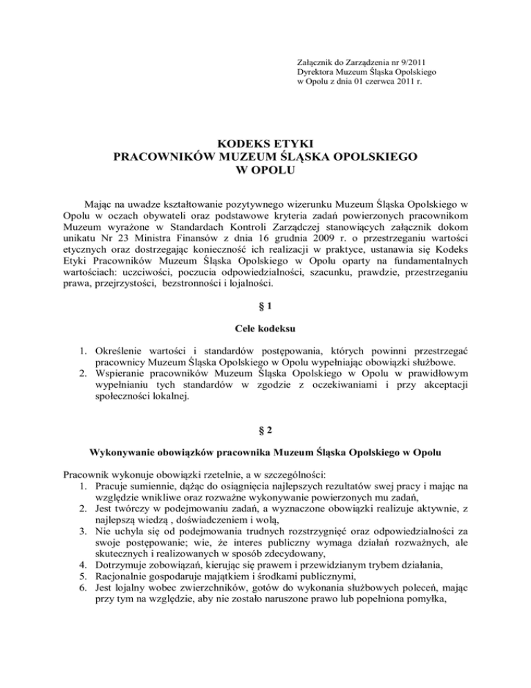 Załącznik do Zarządzenia nr 9/2011 Dyrektora Muzeum Śląska Opolskiego w Opolu z dnia 01 czerwca 2011 r. KODEKS ETYKI PRACOWNIKÓW MUZEUM ŚLĄSKA OPOLSKIEGO W OPOLU Mając na uwadze kształtowanie pozytywnego wizerunku Muzeum Śląska Opolskiego w Opolu w oczach obywateli oraz podstawowe kryteria zadań powierzonych pracownikom Muzeum wyrażone w Standardach Kontroli Zarządczej stanowiących załącznik dokom unikatu Nr 23 Ministra Finansów z dnia 16 grudnia 2009 r. o przestrzeganiu wartości etycznych oraz dostrzegając konieczność ich realizacji w praktyce, ustanawia się Kodeks Etyki Pracowników Muzeum Śląska Opolskiego w Opolu oparty na fundamentalnych wartościach: uczciwości, poczucia odpowiedzialności, szacunku, prawdzie, przestrzeganiu prawa, przejrzystości, bezstronności i lojalności. §1 Cele kodeksu 1. Określenie wartości i standardów postępowania, których powinni przestrzegać pracownicy Muzeum Śląska Opolskiego w Opolu wypełniając obowiązki służbowe. 2. Wspieranie pracowników Muzeum Śląska Opolskiego w Opolu w prawidłowym wypełnianiu tych standardów w zgodzie z oczekiwaniami i przy akceptacji społeczności lokalnej. §2 Wykonywanie obowiązków pracownika Muzeum Śląska Opolskiego w Opolu Pracownik wykonuje obowiązki rzetelnie, a w szczególności: 1. Pracuje sumiennie, dążąc do osiągnięcia najlepszych rezultatów swej pracy i mając na względzie wnikliwe oraz rozważne wykonywanie powierzonych mu zadań, 2. Jest twórczy w podejmowaniu zadań, a wyznaczone obowiązki realizuje aktywnie, z najlepszą wiedzą , doświadczeniem i wolą, 3. Nie uchyla się od podejmowania trudnych rozstrzygnięć oraz odpowiedzialności za swoje postępowanie; wie, że interes publiczny wymaga działań rozważnych, ale skutecznych i realizowanych w sposób zdecydowany, 4. Dotrzymuje zobowiązań, kierując się prawem i przewidzianym trybem działania, 5. Racjonalnie gospodaruje majątkiem i środkami publicznymi, 6. Jest lojalny wobec zwierzchników, gotów do wykonania służbowych poleceń, mając przy tym na względzie, aby nie zostało naruszone prawo lub popełniona pomyłka, 7. Pracownik ma prawo odmowy wykonania polecenia służbowego niezgodnego z przepisami prawa. W takiej sytuacji ma obowiązek pisemnego uzasadnienie swojego stanowiska, 8. Zarówno w pracy jak i poza nią swym postępowaniem buduje zaufanie społeczności dla Muzeum Śląska Opolskiego, 9. Wykazuje powściągliwość w wypowiadaniu negatywnych poglądów na temat swojego miejsca pracy, jego kierownictwa oraz innych pracowników, 10. Powstrzymuje się od wszelkich zachowań mogących wywrzeć negatywny wpływ na jakość wykonywanej przez niego pracy. §3 Stosunek do petentów Muzeum Śląska Opolskiego w Opolu Pracownik traktuje petentów w sposób uczciwy, fachowy i uprzejmy, zgodnie z zasadami określonymi w Kodeksie Postępowania Administracyjnego, a w szczególności: 1. Załatwia sprawy niezwłocznie; w możliwie najszybszym terminie, szanując czas swego petenta, 2. Prowadząc rozmowę z petentem ma na względzie jego wiek, zdolność rozumienia często skomplikowanych przepisów, ewentualną niepełnosprawność, 3. W rozpatrywaniu spraw nie kieruje się emocjami, jest gotów do przyjęcia krytyki, uznania swoich błędów i do naprawienie ich konsekwencji, 4. W stosunku do petenta jest życzliwy, nie przyjmując automatycznie wrogiej postawy, gdy istnieje obawa zaistnienia sporu, 5. Traktuje wszystkich petentów z szacunkiem, bezstronnie, zgodnie z zasadą równości szans, niezależnie od ich sytuacji materialnej. §4 Rozwój pracownika Muzeum Śląska Opolskiego Pracownik dba o rozwój własnych kompetencji, a w szczególności: 1. Pogłębia wiedzę zawodową, potrzebną do jak najlepszego wykonywania swojej pracy, 2. Dąży do pełnej znajomości aktów prawnych oraz wszystkich faktycznych i prawnych okoliczności spraw, 3. Jest gotów do wykorzystania wiedzy zwierzchników, kolegów i podwładnych, a w przypadku braku wiedzy specjalistycznej – do korzystania z pomocy ekspertów, 4. Zawsze jest przygotowany do jasnego, merytorycznego i prawnego – uzasadnienia własnych decyzji i sposobu postępowania, 5. W wykonaniu wspólnych zadań dba o ich jakość merytoryczną i o dobre stosunki międzyludzkie. §5 Bezstronność pracownika Muzeum Śląska Opolskiego Pracownik jest bezstronny w wykonywaniu zadań i obowiązków, a w szczególności: 1. Nie dopuszcza do podejrzeń i nie wchodzi w związek między interesem publicznym i prywatnym, 2. Nie podejmuje żadnych prac ani zajęć, które kolidują z obowiązkami służbowymi, 3. W prowadzonych działaniach równo traktuje wszystkich uczestników, nie ulegając żadnym naciskom i nie przyjmując żadnych zobowiązań wynikających z pokrewieństwa, znajomości, pracy lub przynależności, 4. Od osób zaangażowanych w prowadzenie działania nie przyjmuje żadnych korzyści materialnych ani osobistych, 5. Nie demonstruje zażyłości z osobami publicznie znanymi ze swej działalności politycznej, gospodarczej, społecznej lub religijnej, wystrzega się okazji do promowania jakichkolwiek grup interesu, 6. Nie przyjmuje jakichkolwiek prezentów od petentów zarówno przed, jak i po załatwieniu sprawy, 7. Przy rozstrzyganiu spraw publicznych kieruje się dobrem społeczności lokalnej, 8. Reaguje na wszelkie przejawy korupcji, łamania prawa, nadużycia stanowiska i inne nieprawidłowości w funkcjonowaniu Muzeum Śląska Opolskiego, poprzez w pierwszym rzędzie rozmowę i zwrócenie uwagi innemu innemu pracownikowi, 9. Wobec braku reakcji należy zgłosić sprawę Dyrekcji. §6 Neutralność polityczna pracownika Muzeum Śląska Opolskiego w Opolu Pracownik w wykonaniu zadań i obowiązków jest bezstronny politycznie, a w szczególności: 1. Nie manifestuje w miejscu pracy poglądów i sympatii politycznych, religijnych, rasowych, kulturowych i społecznych, związanych z orientacjami seksualnymi, 2. W trakcie 