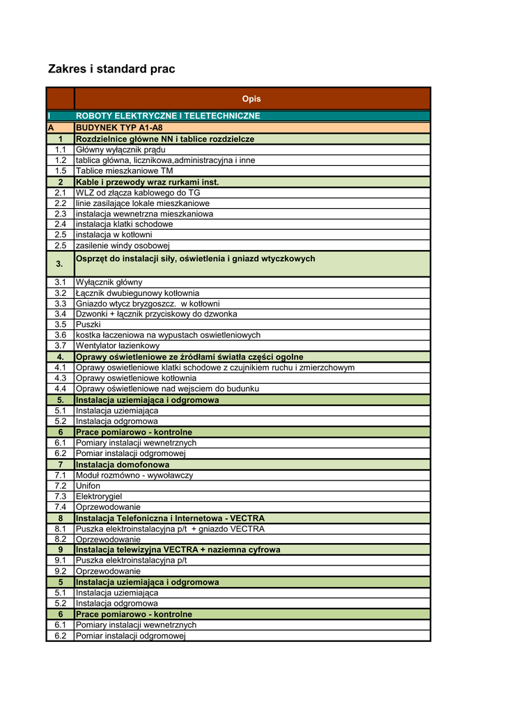Zakres i standard prac Opis I A 1 1.1 1.2 1.5 2 2.1 2.2 2.3 2.4 2.5 2.5 3. 3.1 3.2 3.3 3.4 3.5 3.6 3.7 4. 4.1 4.3 4.4 5. 5.1 5.2 6 6.1 6.2 7 7.1 7.2 7.3 7.4 8 8.1 8.2 9 9.1 9.2 5 5.1 5.2 6 6.1 6.2 ROBOTY ELEKTRYCZNE I TELETECHNICZNE BUDYNEK TYP A1-A8 Rozdzielnice główne NN i tablice rozdzielcze Główny wyłącznik prądu tablica główna, licznikowa,administracyjna i inne Tablice mieszkaniowe TM Kable i przewody wraz rurkami inst. WLZ od złącza kablowego do TG linie zasilające lokale mieszkaniowe instalacja wewnetrzna mieszkaniowa instalacja klatki schodowe instalacja w kotłowni zasilenie windy osobowej Osprzęt do instalacji siły, oświetlenia i gniazd wtyczkowych Wyłącznik główny Łącznik dwubiegunowy kotłownia Gniazdo wtycz bryzgoszcz. w kotłowni Dzwonki + łącznik przyciskowy do dzwonka Puszki kostka łaczeniowa na wypustach oswietleniowych Wentylator łazienkowy Oprawy oświetleniowe ze źródłami światła części ogolne Oprawy oswietleniowe klatki schodowe z czujnikiem ruchu i zmierzchowym Oprawy oswietleniowe kotłownia Oprawy oświetleniowe nad wejsciem do budunku Instalacja uziemiająca i odgromowa Instalacja uziemiająca Instalacja odgromowa Prace pomiarowo - kontrolne Pomiary instalacji wewnetrznych Pomiar instalacji odgromowej Instalacja domofonowa Moduł rozmówno - wywoławczy Unifon Elektrorygiel Oprzewodowanie Instalacja Telefoniczna i Internetowa - VECTRA Puszka elektroinstalacyjna p/t + gniazdo VECTRA Oprzewodowanie Instalacja telewizyjna VECTRA + naziemna cyfrowa Puszka elektroinstalacyjna p/t Oprzewodowanie Instalacja uziemiająca i odgromowa Instalacja uziemiająca Instalacja odgromowa Prace pomiarowo - kontrolne Pomiary instalacji wewnetrznych Pomiar instalacji odgromowej B 1 1.1 1.2 1.3 1.4 2 2.1 2.2 4 2.1 2.2 2.3 Roboty elektryczne zewnętrzne Oświetlenie terenu Kable i przewody Słup oświetleniowy z oprawami i zódłem światła Podświetlenie miejść parkingowych Pomiary Kanalizacja teletechniczna VECTRA Rury kablowe Studnia kablowa Monitoring terenu kabel kamery obrotowe + stacjonarne rejestrator