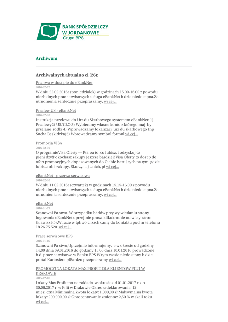 Archiwum Archiwalnych aktualno ci (26): Przerwa w dost pie do eBankNet 2016-02-22 W dniu 22.02.2016r (poniedziałek) w godzinach 15.00-16.00 z powodu niezb dnych prac serwisowych usługa eBankNet b dzie niedost pna.Za utrudnienia serdecznie przepraszamy. wi cej... Przelew US - eBankNet 2016-02-18 Instrukcja przelewu do Urz du Skarbowego systemem eBankNet: 1) Przelewy2) US/CŁO 3) Wybieramy własne konto z którego maj by przelane rodki 4) Wprowadzamy lokalizacj urz du skarbowego (np Sucha Beskidzka)5) Wprowadzamy symbol formul wi cej... Promocja VISA 2016-02-10 O programieVisa Oferty — Pła za to, co lubisz, i odzyskuj cz pieni dzy!Pokochasz zakupy jeszcze bardziej! Visa Oferty to dost p do ofert promocyjnych dopasowanych do Ciebie bazuj cych na tym, gdzie lubisz robi zakupy. Skorzystaj z nich, pł wi cej... eBankNet - przerwa serwisowa 2016-02-10 W dniu 11.02.2016r (czwartek) w godzinach 15.15-16.00 z powodu niezb dnych prac serwisowych usługa eBankNet b dzie niedost pna.Za utrudnienia serdecznie przepraszamy. wi cej... eBankNet 2016-01-29 Szanowni Pa stwo. W przypadku bł dów przy wy wietlaniu strony logowania eBankNet uprzejmie prosz kilkukrotnie od wie y stron (klawisz F5).W razie w tpliwo ci zach camy do kontaktu pod nr telefonu 18 26 75 520. wi cej... Prace serwisowe BPS 2016-01-05 Szanowni Pa stwo,Uprzejmie informujemy, e w okresie od godziny 14:00 dnia 09.01.2016 do godziny 15:00 dnia 10.01.2016 prowadzone b d prace serwisowe w Banku BPS.W tym czasie niedost pny b dzie portal Kartosfera.plBardzo przepraszamy wi cej... PROMOCYJNA LOKATA MAX PROFIT DLA KLIENTÓW FILII W KRAKOWIE 2015-12-01 Lokaty Max Profit mo na zakłada w okresie od 01.01.2017 r. do 30.06.2017 r. w Filii w Krakowie.Okres zadeklarowania: 12 miesi czna.Minimalna kwota lokaty: 1.000,00 zł.Maksymalna kwota lokaty: 200.000,00 zł.Oprocentowanie zmienne: 2,50 % w skali roku wi cej... Po egnanie wybitnego spółdzielcy 2015-11-27 Z gł bokim alem powiadamiamy, e w dniu 26 listopada po ci kiej chorobie odszedł od nas emerytowany, długoletni i zasłu ony Prezes Zarz du Banku Spółdzielczego w Jordanowie .P. Stanisław Job, miał 73 lata. .P. Stanisław Job prac bankow rozpocz ł wi cej... Wygodny Kredyt Gotówkowy 2015-11-23 Bank Spółdzielczy w Jordanowie prezentuje Wygodny Kredyt Gotówkowymax. kwota: do 100 000 zł.okres spłaty: do 60 miesi cy.oprocentowanie zmienne: 5,9% w skali rokuopłata za rozpatrzenie wniosku: 70 zł.prowizja:wi cej... Przelewy ekspresowe BlueCash 2015-11-23 Bank Spółdzielczy w Jordanowie uprzejmie informuje, e od dnia 16.09.2015 r. mo na w systemie eBankNet wykonywa ekspresowe przelewy "BlueCash" (czas realizacji około 15 sekund), opłata za 1 przelew max. do kwoty 10.000,00 zł wynosi 5,00 zł zgodnie z wi cej... Bezpiecze stwo bankowo ci 2015-11-23 Informujemy, e w ostatnim czasie zwi kszyły si przypadki ataków hakerskich na rachunki klientów banków korzystaj cych z systemów bankowo ci internetowej. Polegaj one na:wyłudzeniu danych potrzebnych do przeprowadzania transakcji w systemie bankowo wi cej... Obowi zek informacyjny 2015-11-23 Bank Spółdzielczy w Jordanowie informuje, e dane ilo ciowe i jako ciowe oraz nieobj te badaniem niezale nego biegłego rewidenta na temat wyników ekonomiczno - finansowych Banku, adekwatno ci kapitałowej w odniesieniu do poziomu ryzyka podejmowanego wi cej... MÓJ BIZNES 2015-06-03 Posiadasz u nas konto ?PRZYJD Jeszcze go nie masz ? otwórz i skorzystaj z KREDYTU DLA FIRM MÓJ BIZNESTO SI OPŁACAWARUNKI KREDYTOWANIAMax. kwota kredytu: 100.000,00 zł.Okres kredytowania: do 5 latOprocentowanie zmienne: 7,23% oparte o stawk re wi cej... LOKATA 10 MIESI CZNA PLUS 2015-06-03 Szanowni Klienci.Zapraszamy i zach camy do zało enia nowej promocyjnej lokaty 10 miesi cznej PLUS z atrakcyjnym oprocentowaniem 1,70%.Po wi cej informacji zapraszamy do najbli szej placówki Banku. wi cej... KREDYT MIESZKANIOWY "MÓJ DOM" 2015-06-03 Bank Spółdzielczy w Jordanowie prezentuje Kredyt mieszkaniowy "Mój Dom"WARUNKI KREDYTOWANIA Okres kredytowania: do 25 latKwota kredytu: do 80 % warto ci kosztorysowej całej inwestycji,Minimalny udział własny: 20% warto ci,Oprocentowanie zmi wi cej... BANK SPÓŁDZIELCZY TO NIE SKOK 2015-06-03 Szanowni Klieci!Serdecznie zach camy do zapoznania si z informacj Krajowego Zwi zku Banków Spółdzielczych dost pn po klikni ciu na link: Bank Spółdzielczy to nie SKOK wi cej... ECORPONET - LOGOWANIE 2015-06-03 Szanowni Klienci.Je li maj Pa stwo problem z logowaniem si do eCorpoNet prosz wykona nast puj ce czynno ci:Panel sterowania->Java-->(zakładka)Security-->(przycisk)Edit Site List...-->Add. Wprowadzamy w edytowalne pole adres do serwis wi cej... KOMUNIKAT DOTYCZ CY KART 2015-06-03 Szanowny Kliencie!Bank Spółdzielczy w Jordanowie informuje, e w celu podniesienia poziomu bezpiecze stwa,od 1 lutego 2015 r. zmianie ulegnie tryb dokonywania płatno ci kartami kredytowymi i debetowymi za zakupy i transakcje przez internet.W celu pot wi cej... ZASADY ŁADU KORPORACYJNEGO 2015-06-03 Bank Spółdzielczy w Jordanowie przyj ł Zasady Ładu Korporacyjnego w zakersie okre lonym w Polityce zarz dzania ładem korporacyjnym która jest dost pna w zakładce "O Banku". wi cej... PAKIETY ROR 2015-06-03 Bank Spółdzielczy w Jordanowie oferuje Pakiet Standardowy ROR oraz Pakiet Młodzie owy ROR.Pakiet Standardowy ROR - 6,00 złPakiet Młodzie owy ROR - 2,00 złOpłata miesi czna obejmuje:prowadzenie rachunku,posiadanie karty bankomatowej,dost p do bankowo wi cej... Poprzednia 1/2 Nast pna Copyright © Grupa BPS | 2017