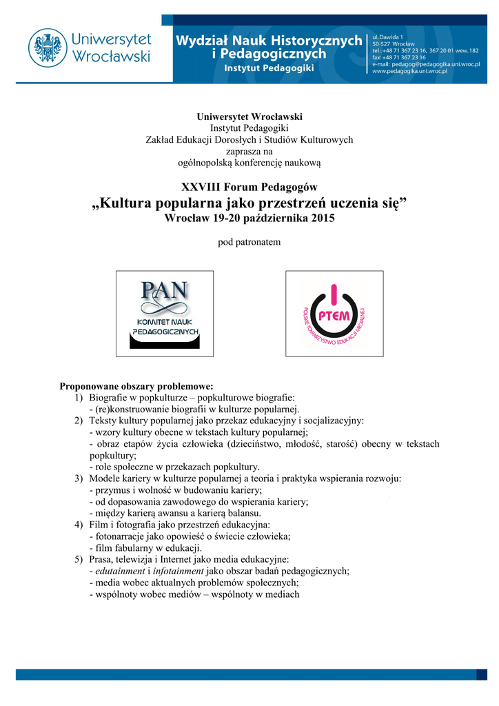 Uniwersytet Wrocławski Instytut Pedagogiki Zakład Edukacji Dorosłych i Studiów Kulturowych zaprasza na ogólnopolską konferencję naukową XXVIII Forum Pedagogów „Kultura popularna jako przestrzeń uczenia się” Wrocław 19-20 października 2015 pod patronatem Proponowane obszary problemowe: 1) Biografie w popkulturze – popkulturowe biografie: - (re)konstruowanie biografii w kulturze popularnej. 2) Teksty kultury popularnej jako przekaz edukacyjny i socjalizacyjny: - wzory kultury obecne w tekstach kultury popularnej; - obraz etapów życia człowieka (dzieciństwo, młodość, starość) obecny w tekstach popkultury; - role społeczne w przekazach popkultury. 3) Modele kariery w kulturze popularnej a teoria i praktyka wspierania rozwoju: - przymus i wolność w budowaniu kariery; - od dopasowania zawodowego do wspierania kariery; - między karierą awansu a karierą balansu. 4) Film i fotografia jako przestrzeń edukacyjna: - fotonarracje jako opowieść o świecie człowieka; - film fabularny w edukacji. 5) Prasa, telewizja i Internet jako media edukacyjne: - edutainment i infotainment jako obszar badań pedagogicznych; - media wobec aktualnych problemów społecznych; - wspólnoty wobec mediów – wspólnoty w mediach Komitet naukowy konferencji: Prof. zw. dr hab. Zbyszko Melosik UAM Prof. zw. dr hab. Magdalena Piorunek UAM Prof. zw. dr hab. Tomasz Szkudlarek UG Prof. dr hab. Agnieszka Cybal-Michalska UAM Prof. dr hab. Dariusz Kubinowski UMCS Prof. dr hab. Agnieszka Ogonowska Uniwersytet Pedagogiczny w Krakowie Prof. dr hab. Witold Jakubowski UWr Komitet organizacyjny: prof. dr hab. Witold Jakubowski dr Maria Jabłońska dr Aleksander Kobylarek dr Małgorzata Malec-Rawinski dr Martyna Pryszmont-Ciesielska dr Marek Podgórny mgr Joanna Anioł – sekretarz konferencji mgr Alicja Mironiuk-Netreba mgr Kamila Osip Teksty prezentowane podczas konferencji, po przejściu procedury recenzyjnej, będą publikowane w specjalnie przygotowanej monografii wieloautorskiej lub w recenzowanym piśmie naukowym. Ważne terminy: • tytuł wystąpienia prosimy przesłać do 31 marca; • abstrakt (max. 1000 znaków ze spacjami) i opłatę konferencyjną prosimy przesłać do 30 czerwca 2015; • tekst wraz ze streszczeniem w języku angielskim (max. 1000 znaków ze spacjami) prosimy przesłać do 15 września 2015 r. na adres: [email protected] Opłata konferencyjna: 420 PLN (studenci i doktoranci 320 PLN) konto: 97 1090 2503 0000 0001 1093 9538 z dopiskiem: 48N FORUM PEDAGOGÓW Informacja o wybranych miejscach noclegowych. Organizatorzy nie pośredniczą w rezerwacji. http://royalhostel.pl/pl/ http://www.premiereclasse.com/pl/hotels/premiere-classe-wroclawcentrum?sem=yes&gclid=COqdvqeph7oCFc7C3god-2QAHQ http://campanile-wroclaw-centrum.pl/pl http://piastwroclaw.pl „Na studencką kieszeń” http://www.absynthostel.pl/ http://babelhostel.com.pl/ http://www.deja-vu.com.pl/