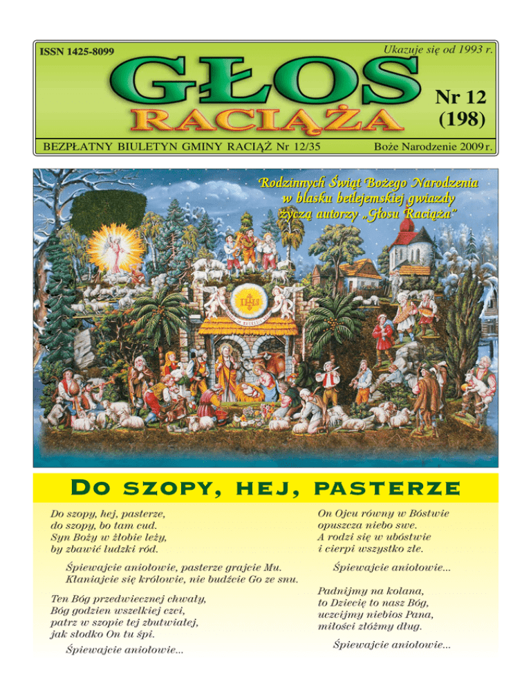 Ukazuje si´ od 1993 r. ISSN 1425-8099 Nr 12 (198) BEZP¸ATNY BIULETYN GMINY RACIÑ˚ Nr 12/35 Bo˝e Narodzenie 2009 r. Rodzinnych Âwiàt Bo˝ego Narodzenia w blasku betlejemskiej gwiazdy ˝yczà autorzy „G∏osu Racià˝a” Do szopy, hej, pasterze Do szopy, hej, pasterze, do szopy, bo tam cud. Syn Bo˝y w ˝∏obie le˝y, by zbawiç ludzki ród. Âpiewajcie anio∏owie, pasterze grajcie Mu. K∏aniajcie si´ królowie, nie budêcie Go ze snu. Ten Bóg przedwiecznej chwa∏y, Bóg godzien wszelkiej czci, patrz w szopie tej zbutwia∏ej, jak s∏odko On tu Êpi. Âpiewajcie anio∏owie... On Ojcu równy w Bóstwie opuszcza niebo swe. A rodzi si´ w ubóstwie i cierpi wszystko z∏e. Âpiewajcie anio∏owie... Padnijmy na kolana, to Dzieci´ to nasz Bóg, uczcijmy niebios Pana, mi∏oÊci z∏ó˝my d∏ug. Âpiewajcie anio∏owie... WYDARZENIA 2 Tradycyjnie przed Êwi´tami Bo˝ego Narodzeniem w Racià˝u spotkali si´ ludowcy z miasta, gminy i powiatu, aby podsumowaç mijajàcy rok. Powiedzieç o ty, co uda∏o si´ w tym czasie zrobiç, a czego nie i ˝yczyç sobie pomyÊlnoÊci na nowy rok. WÊród uczestników spotkania obecni byli m.in. pose∏ Aleksander Sopliƒski, starosta p∏oƒski Jan Màczewski, samorzàdowcy z powiatu p∏oƒskiego, a wÊród nich wójt gminy Racià˝ Ryszard Giszczak. Nim zebrani podzielili si´ op∏atkiem, mówili na temat sytuacji w kraju i w Stronnictwie. Punktem wyjÊcia do dyskusji by∏o wystàpienie gospodarza spotkania, prezesa Zarzàdu Miejsko-Gminnego Polskiego Stronnictwa Ludowego w Racià˝u Kazimierza Miklewskiego. Poni˝ej obszerne fragmenty jego wypowiedzi. Koƒczy si´ rok 2009 i zarazem mijajà dwa lata od powstania koalicyjnego rzàdu z udzia∏em Polskiego Stronnictwa Ludowego. MyÊl´, ˝e ogólnie, jako Stronnictwo odnotowaliÊmy du˝y sukces: jesteÊmy w koalicji rzàdowej, mamy udzia∏ w sprawowaniu w∏adzy wykonawczej, dzi´ki czemu w skali kraju mo˝emy dziÊ lepiej s∏u˝yç ludziom w rozwiàzywaniu problemów spo∏ecznych i gospodarczych. Ale spoczywa na nas bardzo du˝a z tego tytu∏u odpowiedzialnoÊç wobec naszych cz∏onków i ca∏ego spo∏eczeƒstwa. W rzàdzie kierujemy trzema resortami pracy i polityki spo∏ecznej, rolnictwa oraz gospodarki. W obszarze spraw spo∏ecznych szczególnego podkreÊlenia wymaga: • reforma emerytur pomostowych oraz obni˝enie op∏at do Otwartych Funduszy Emerytalnych, • poprawienie funkcjonowania urz´dów pracy, • wprowadzenie promocji zatrudnienia osób po 50 roku ˝ycia, • przed∏u˝enie urlopów macierzyƒskich, • wprowadzenie rozwiàzaƒ prawnych zapewniajàcych pomoc osobom uprawnionym do alimentów, • zapewnienie pomocy paƒstwa w sp∏acie niektórych kredytów osobom, które utraci∏y prac´, • wyd∏u˝enie czasu otrzymywania Êwiadczenia chorobowego przez kobiety w cià˝y, W rolnictwie: • znacznie wzros∏y dop∏aty bezpoÊrednie, • przyspieszono i usprawniono przekazywanie p∏atnoÊci dla rolników z ARiMR, • uzyskano zgod´ na wyd∏u˝enie mo˝liwoÊci kredytowania zakupu ziemi na warunkach preferencyjnych, • podj´to zdecydowane dzia∏ania na rzecz zmniejszenia ró˝nic pomi´dzy cenami producenta a cenami konsumenta, • zwi´kszono w bud˝ecie Êrodki na dop∏aty do sk∏adek ubezpieczenia upraw rolnych i zwierzàt gospodarskich, • przygotowano ustaw´ o gospodarowaniu nieruchomoÊciami rolnymi Skarbu Paƒstwa, której celem jest m.in. doprowadzenie „G∏os Racià˝a” nr 12/2009 u∏atwienia w zak∏adaniu i prowadzeniu firm poprzez skrócenie terminu zwrotu VAT; • przyje∏o program wspierania kluczowych inwestycji. Po raz pierwszy od 30 lat doprowadzono do wyrównania szans. Teraz równie˝ inwestor krajowy, polski kapita∏, jeÊli b´dzie inwestowa∏ w wiodàce, bardzo perspektywiczne, rozwojowe obszary przemys∏u, wytwórczoÊci czy us∏ug, mo˝e liczyç na wsparcie tej inwestycji ze strony polskiego paƒstwa, tak jak inwestorzy zagraniczni. W programie PSL mamy zapisane kultywowanie takich tradycyjnych, nieprzemijajàcych wartoÊci jak: ojczyzna, rodzina, ziemia, mowa ojców, ale te˝ wdra˝anie nowych, zwiàzanych z demokracjà i spo∏eczeƒstwem obywatelskim, takich jak: obrona podmiotowoÊci ka˝dego cz∏owieka, poszanowanie jego godnoÊci i ustanowienie sprawiedliwego ∏adu spo∏ecznego. A te wartoÊci to podstawa sprawiedliwej polityki spo∏ecznej. Nasza miejsko-gminna organizacja Polskiego Stronnictwa Ludowego, liczàca ponad 300 cz∏onków zrzeszonych w 23 ko∏ach, stanowi znaczàcà grup´ i si∏´ politycznà. Widaç nas nie tylko dzisiaj na tej sali, ale widaç nas przede wszystkim w codziennym dzia∏aniu: na wsi i w mieÊcie, w gminie i w powiecie, w banku i w szkolnictwie. Aktywnie uczestniczymy w ˝yciu spo∏ecznym i gospodarczym naszego terenu. O ˝ywotnoÊci organizacji Êwiadczy fakt, ˝e nasze szeregi zasilajà coraz to nowi cz∏onkowie. Od ostatniego spotkania liczba cz∏onków zwi´kszy∏a si´ o 9 osób. Z okazji Êwiat Bo˝ego Narodzenia – w imieniu zarzàdu oraz wszystkich cz∏onków PSL w Racià˝u pragn´ z ca∏ego serca ˝yczyç dobrego zdrowia, które pozwala przetrwaç najgorsze; pracy, która pozwala ˝yç spokojnie; ciep∏a, które ogrzewa; mi∏oÊci, która wa˝niejsza jest od wszystkich dóbr; OpatrznoÊci Bo˝ej, która jest swoistym boskim urz´dem nadzoru, a ponadto ˝ycz´ wiele osobistego szcz´Êcia na ka˝dy dzieƒ nowego – 2010 roku. „Zielony” op∏atek do sprzeda˝y polskim rolnikom ziemi pozostajàcej w zasobie Agencji NieruchomoÊci Rolnych na powi´kszenie gospodarstw rodzinnych, • pomimo kryzysowej sytuacji w gospodarce unijnej i Êwiatowej, wyniki handlu zagranicznego naszymi produktami rolnymi sà w dalszym ciàgu niewystarczajàce. Ministerstwo Gospodarki kierowane przez Waldemara Pawlaka: • wynegocjowa∏o korzystny dla polskiej energetyki i przedsi´biorstw pakiet klimatyczny, zak∏adajàcy m.in. okres przejÊciowy dla naszych elektrowni na za