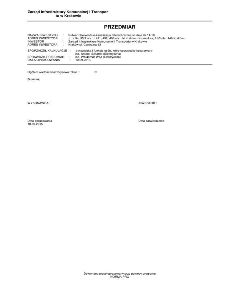 Zarząd Infrastruktury Komunalnej i Transportu w Krakowie PRZEDMIAR NAZWA INWESTYCJI ADRES INWESTYCJI INWESTOR ADRES INWESTORA : : : : Bulwar Czerwieński-kanalizacja teletechniczna studnie sk 14-19 z. nr 94, 95/1 obr. 1 491, 492, 493 obr. 14 Kraków - Krowodrza; 81/5 obr. 146 Kraków Zarząd Infrastruktury Komunalnej i Transportu w Krakowie Kraków ul. Centralna 53 SPORZĄDZIŁ KALKULACJE : SPRAWDZIŁ PRZEDMIAR DATA OPRACOWANIA : : <<nazwiska i funkcje osób, które sporządziły kosztorys>> inż. Antoni Szkarłat (Elektryczna) inż. Waldemar Wąs (Elektryczna) 10.09.2015 Ogółem wartość kosztorysowa robót : zł Słownie: WYKONAWCA : INWESTOR : Data opracowania 10.09.2015 Data zatwierdzenia Dokument został opracowany przy pomocy programu NORMA PRO Czerwieński-kanalizacja zmiany-przedm Lp. Podstawa 1 1 KNP 18 d.1 0407-01.07 OBMIAR Opis i wyliczenia KANALIZACJA KABLOWA TELETECHNICZNA 2- OTWOROWA Kopanie rowów kablowych o głębokości 0.8 m i szerokości 0.6 m w gruncie kat.I-II koparką typu "BOBCAT"o pojemności łyżki 0.04 m3 95 j.m. m Wykopy oraz przekopy wykonywane koparkami przedsiębiernymi 0.60 m3 na odkład w gruncie kat.I-II- wykop pod studnią kablową SKR-2 12 m3 3 KNR 5-01 d.1 0401-01 Budowa studni kablowych prefabrykowanych rozdzielczych SK-2 dwuelementowych w gruncie kat.I-II- montaż studni kablowych SKR-2 1 stud. 4 KNR 5-01 d.1 0401-01 Budowa studni kablowych prefabrykowanych rozdzielczych SK-2 dwuelementowych w gruncie kat.I-II- montaż studni kablowych SKR-1 3 stud. 5 KNR 5-10 d.1 0303-02 Układanie rur ochronnych z PCW o śr. do 110 mm w wykopie- układanie rur DVK 110mm (2x 1200m) 190 m 6 KNR 2-01 d.1 0705-01 Mechaniczne zasypywanie rowów dla kabli o głębok.do 1.0 m i szer.dna do 0.4 m m w gruncie kat. I-II- zasypanie kanalizacji kablowej 2- otworowej 95 m 7 KNR 4-01 d.1 0108-05 Wywóz ziemi samochodami samowyładowczymi na odległość do 1 km grunt.kat. I-II 2 8 KNR 2-21 d.1 0401-01 Wykonanie trawników dywanowych siewem na gruncie kat. I-II bez nawożenia m2 Norma PRO Wersja 4.34 Nr seryjny: 26437 Użytkownik: POWER m3 stud. stud. m 95.000 RAZEM 95.000 12.000 RAZEM 12.000 1.000 RAZEM 1.000 3.000 RAZEM 3.000 190.000 RAZEM 190.000 95.000 RAZEM 95.000 2.000 RAZEM 2.000 95.000 RAZEM 95.000 m3 m3 m2 -2- Razem m 2 KNR 2-01 d.1 0216-01 95 Poszcz Czerwieński-kanalizacja zmiany-przedm KOSZTORYS INWESTORSKI Lp. Podstawa 1 1 KNP 18 0407d.1 01.07 Opis Jedn.obm. KANALIZACJA KABLOWA TELETECHNICZNA 2- OTWOROWA Kopanie rowów kablowych o głębokości 0.8 m i szerom kości 0.6 m w gruncie kat.I-II koparką typu "BOBCAT"o pojemności łyżki 0.04 m3 2 KNR 2-01 0216- Wykopy oraz przekopy wykonywane koparkami przed- m3 d.1 01 siębiernymi 0.60 m3 na odkład w gruncie kat.I-II- wykop pod studnią kablową SKR-2 3 KNR 5-01 0401- Budowa studni kablowych prefabrykowanych rozdzielstud. d.1 01 czych SK-2 dwuelementowych w gruncie kat.I-II- montaż studni kablowych SKR-2 4 KNR 5-01 0401- Budowa studni kablowych prefabrykowanych rozdzielstud. d.1 01 czych SK-2 dwuelementowych w gruncie kat.I-II- montaż studni kablowych SKR-1 5 KNR 5-10 0303- Układanie rur ochronnych z PCW o śr. do 110 mm w m d.1 02 wykopie- układanie rur DVK 110mm (2x 1200m) 6 KNR 2-01 0705- Mechaniczne zasypywanie rowów dla kabli o głębok.do m d.1 01 1.0 m i szer.dna do 0.4 m w gruncie kat. I-II- zasypanie kanalizacji kablowej 2- otworowej 7 KNR 4-01 0108- Wywóz ziemi samochodami samowyładowczymi na od- m3 d.1 05 ległość do 1 km grunt.kat. I-II 8 KNR 2-21 0401- Wykonanie trawników dywanowych siewem na gruncie m2 d.1 01 kat. I-II bez nawożenia Razem dział: KANALIZACJA KABLOWA TELETECHNICZNA 2- OTWOROWA Wartość kosztorysowa robót bez podatku VAT Podatek VAT Ogółem wartość kosztorysowa robót Słownie: -3- Norma PRO Wersja 4.34 Nr seryjny: 26437 Użytkownik: POWER Ilość 95 12 1 3 190 95 2 95 Cena jedn. Wartość Czerwieński-kanalizacja zmiany-przedm Lp. Podstawa 1 1 KNP 18 0407d.1 01.07 999 2 KNR 2-01 d.1 0216-01 999 11163 3 KNR 5-01 d.1 0401-01 SZCZEGÓŁOWY KOSZTORYS INWESTORSKI Opis jm Nakład jedn. Cena jedn. Koszt jedn. KANALIZACJA KABLOWA TELETECHNICZNA 2- OTWOROWA Kopanie rowów kablowych o głębom kości 0.8 m i szerokości 0.6 m w gruncie kat.I-II koparką typu "BOBCAT"o pojemności łyżki 0.04 m3 -- Robocizna -- r-g Razem pozycja 1 Wykopy oraz przekopy wykonywane m3 koparkami przedsiębiernymi 0.60 m3 na odkład w gruncie kat.I-II- wykop pod studnią kablową SKR-2 -- Robocizna -- 95.000 12 r-g 0.0794 -- Sprzęt -koparka gąsienicowa 0.60 m3 m-g Razem pozycja 2 Budowa studni kablowych prefabryko- stud. wanych rozdzielczych SK-2 dwuelementowych w gruncie kat.I-II- montaż studni kablowych SKR-2 0.0241 12.000 1 -- Robocizna -25*0.955= r-g 23.8750 2370604 1700300 1512299 1601899 8161100 8161100 8311202 8161300 5002100 8161400 1132099 8161302 3930000 -- Materiały -beton zwykły B 17 cement 25 lakier asfaltowy piasek pokrywa ciężka RCZ klasa A pokrywa lekka RL klasa A poprzeczka stalowa rama ciężka RCZ klasa A rura stalowa śr. 33.7x2.9 mm studnia SKR- 2 śruba M 20x60 mm z nakretka wietrznik do studni woda m3 t kg m3 szt szt szt szt m szt szt szt m3 0.0300 0.0030 0.3500 0.0100 0.6700 0.3400 1.0000 1.0000 1.2600 1.0000 4.0000 1.0000 0.0080 m-g m-g m-g 1.2000 3.0500 1.4400 4 KNR 5-01 d.1 0401-01 -- Sprzęt -samochód skrzyniowy do 5 t samochód samowyładowczy 5 t żuraw samochodowy 4 t Razem pozycja 3 Budowa studni kablowych prefabrykowanych rozdzielczych SK-2 dwuelementowych w gruncie kat.I-II- montaż studni kablowych SKR-1 1.000 3 stud. 999 -- Robocizna -25*0.955= r-g 23.8750 2370604 1700300 1512299 1601899 8161100 8311202 8161300 8161100 5002100 8161400 1132099 8161302 3930000 -- Materiały -beton zwykły B 17 cement 25 lakier asfaltowy piasek pokrywa ciężka RCZ klasa A poprzeczka stalowa rama ciężka RCZ klasa A pokrywa lekka RL klasa A' rura stalowa śr. 33.7x2.9 mm studnia SKR-1 śruba M 20x60 mm z nakretka wietrznik do studni woda m3 t kg m3 szt szt szt szt m szt szt 