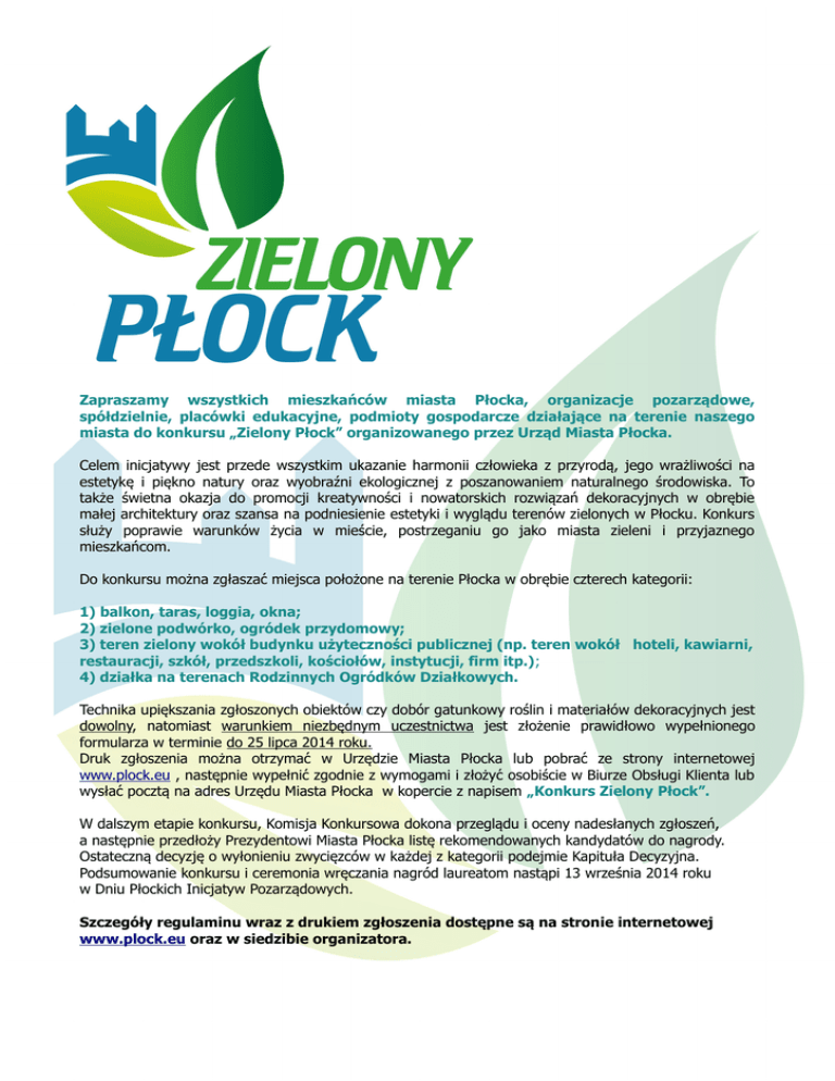 Zapraszamy wszystkich mieszkańców miasta Płocka, organizacje pozarządowe, spółdzielnie, placówki edukacyjne, podmioty gospodarcze działające na terenie naszego miasta do konkursu „Zielony Płock” organizowanego przez Urząd Miasta Płocka. Celem inicjatywy jest przede wszystkim ukazanie harmonii człowieka z przyrodą, jego wrażliwości na estetykę i piękno natury oraz wyobraźni ekologicznej z poszanowaniem naturalnego środowiska. To także świetna okazja do promocji kreatywności i nowatorskich rozwiązań dekoracyjnych w obrębie małej architektury oraz szansa na podniesienie estetyki i wyglądu terenów zielonych w Płocku. Konkurs służy poprawie warunków życia w mieście, postrzeganiu go jako miasta zieleni i przyjaznego mieszkańcom. Do konkursu można zgłaszać miejsca położone na terenie Płocka w obrębie czterech kategorii: 1) balkon, taras, loggia, okna; 2) zielone podwórko, ogródek przydomowy; 3) teren zielony wokół budynku użyteczności publicznej (np. teren wokół hoteli, kawiarni, restauracji, szkół, przedszkoli, kościołów, instytucji, firm itp.); 4) działka na terenach Rodzinnych Ogródków Działkowych. Technika upiększania zgłoszonych obiektów czy dobór gatunkowy roślin i materiałów dekoracyjnych jest dowolny, natomiast warunkiem niezbędnym uczestnictwa jest złożenie prawidłowo wypełnionego formularza w terminie do 25 lipca 2014 roku. Druk zgłoszenia można otrzymać w Urzędzie Miasta Płocka lub pobrać ze strony internetowej www.plock.eu , następnie wypełnić zgodnie z wymogami i złożyć osobiście w Biurze Obsługi Klienta lub wysłać pocztą na adres Urzędu Miasta Płocka w kopercie z napisem „Konkurs Zielony Płock”. W dalszym etapie konkursu, Komisja Konkursowa dokona przeglądu i oceny nadesłanych zgłoszeń, a następnie przedłoży Prezydentowi Miasta Płocka listę rekomendowanych kandydatów do nagrody. Ostateczną decyzję o wyłonieniu zwycięzców w każdej z kategorii podejmie Kapituła Decyzyjna. Podsumowanie konkursu i ceremonia wręczania nagród laureatom nastąpi 13 września 2014 roku w Dniu Płockich Inicjatyw Pozarządowych. Szczegóły regulaminu wraz z drukiem zgłoszenia dostępne są na stronie internetowej www.plock.eu oraz w siedzibie organizatora. Załącznik nr 1 do Regulaminu Konkursu „Zielony Płock” ZGŁOSZENIE DO UDZIAŁU W KONKURSIE „ZIELONY PŁOCK” I. Imię i nazwisko uczestnika konkursu (nazwa uczestnika konkursu): ………………………………………………………………………………………………………………… II. Adres, telefon uczestnika konkursu: …………………………………………………………………………………………….………………….. III. Położenie obiektu (adres): …………………………………………………………………………………………….………………….. IV. Kategoria obiektu: (należy wpisać znak X przy danej kategorii) 1. balkon, taras, loggia, okna 2. zielone podwórko, ogródek przydomowy 3. teren zielony wokół budynku użyteczności 4. działka na terenach Rodzinnych Ogródków Działkowych V. Krótki opis obiektu zawierający najcenniejszych gatunków roślin: datę jego założenia oraz nazwy …………………………………………………………………………………………….………………….. …………………………………………………………………………………………….………..………… …..…………………………………………………………………………………………….……………… …………………………………………………………………………………………….………………….. …………………………………………………………………………………………….………..………… …..…………………………………………………………………………………………….……………… …..…………………………………………………………………………………………….……………… …………………………………………………………………………………………….………………….. …………………………………………………………………………………………….………..………… …..…………………………………………………………………………………………….……………… ………..…..………………………………… Data i podpis uczestnika konkursu