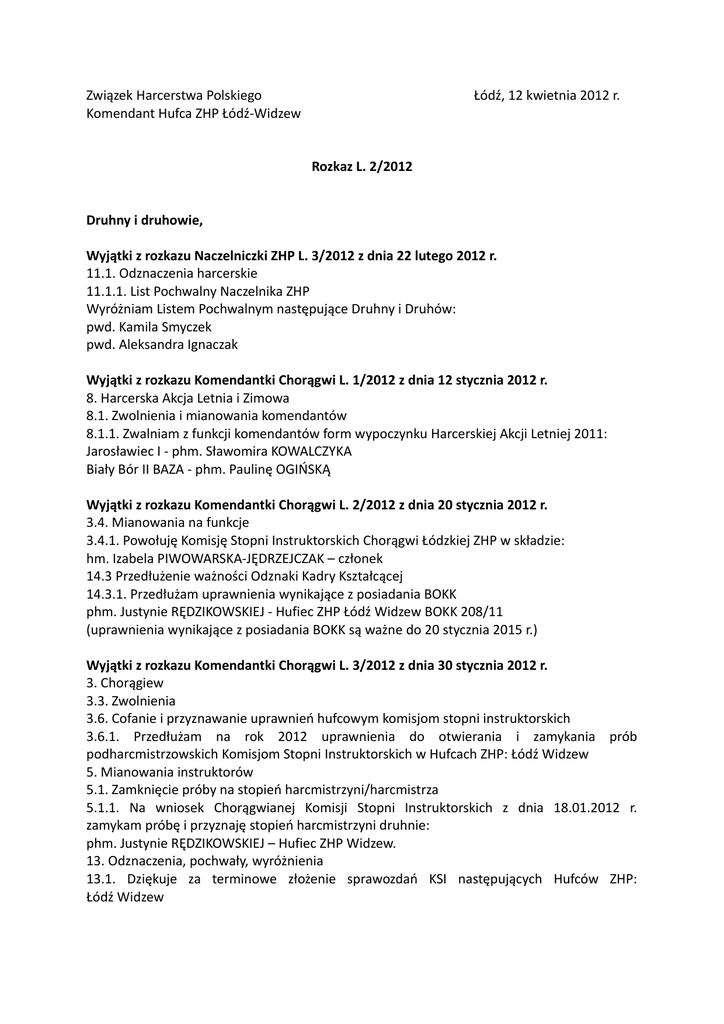 Związek Harcerstwa Polskiego Komendant Hufca ZHP Łódź-Widzew Łódź, 12 kwietnia 2012 r. Rozkaz L. 2/2012 Druhny i druhowie, Wyjątki z rozkazu Naczelniczki ZHP L. 3/2012 z dnia 22 lutego 2012 r. 11.1. Odznaczenia harcerskie 11.1.1. List Pochwalny Naczelnika ZHP Wyróżniam Listem Pochwalnym następujące Druhny i Druhów: pwd. Kamila Smyczek pwd. Aleksandra Ignaczak Wyjątki z rozkazu Komendantki Chorągwi L. 1/2012 z dnia 12 stycznia 2012 r. 8. Harcerska Akcja Letnia i Zimowa 8.1. Zwolnienia i mianowania komendantów 8.1.1. Zwalniam z funkcji komendantów form wypoczynku Harcerskiej Akcji Letniej 2011: Jarosławiec I - phm. Sławomira KOWALCZYKA Biały Bór II BAZA - phm. Paulinę OGIŃSKĄ Wyjątki z rozkazu Komendantki Chorągwi L. 2/2012 z dnia 20 stycznia 2012 r. 3.4. Mianowania na funkcje 3.4.1. Powołuję Komisję Stopni Instruktorskich Chorągwi Łódzkiej ZHP w składzie: hm. Izabela PIWOWARSKA-JĘDRZEJCZAK – członek 14.3 Przedłużenie ważności Odznaki Kadry Kształcącej 14.3.1. Przedłużam uprawnienia wynikające z posiadania BOKK phm. Justynie RĘDZIKOWSKIEJ - Hufiec ZHP Łódź Widzew BOKK 208/11 (uprawnienia wynikające z posiadania BOKK są ważne do 20 stycznia 2015 r.) Wyjątki z rozkazu Komendantki Chorągwi L. 3/2012 z dnia 30 stycznia 2012 r. 3. Chorągiew 3.3. Zwolnienia 3.6. Cofanie i przyznawanie uprawnień hufcowym komisjom stopni instruktorskich 3.6.1. Przedłużam na rok 2012 uprawnienia do otwierania i zamykania prób podharcmistrzowskich Komisjom Stopni Instruktorskich w Hufcach ZHP: Łódź Widzew 5. Mianowania instruktorów 5.1. Zamknięcie próby na stopień harcmistrzyni/harcmistrza 5.1.1. Na wniosek Chorągwianej Komisji Stopni Instruktorskich z dnia 18.01.2012 r. zamykam próbę i przyznaję stopień harcmistrzyni druhnie: phm. Justynie RĘDZIKOWSKIEJ – Hufiec ZHP Widzew. 13. Odznaczenia, pochwały, wyróżnienia 13.1. Dziękuje za terminowe złożenie sprawozdań KSI następujących Hufców ZHP: Łódź Widzew Wyjątki z rozkazu Komendantki Chorągwi L. 4/2012 z dnia 3 lutego 2012 r. 8. Harcerska Akcja Letnia i Zimowa 8.1. Zwolnienia i mianowania komendantów 8.1.1. Zwalniam z funkcji komendantów form wypoczynku Harcerskiej Akcji Letniej 2011: Biały Bór I - hm. Justynę RĘDZIKOWSKĄ Zarzęcin I - phm. Adama DACZA Zarzęcin III - phm. Martę KORIAT 8.1.2. Mianuję komendantów form wypoczynku Harcerskiej Akcji Zimowej 2012: Półkolonie - pwd. Aleksandrę KALISIAK Kurs zastępowych – phm. Magdalenę PILARSKĄ Kurs przybocznych - pwd. Annę SUPEŁ Wyjątki z rozkazu Komendantki Chorągwi L. 5/2012 z dnia 27 lutego 2012 r. 8. Harcerska Akcja Letnia i Zimowa 8.1. Zwolnienia i mianowania komendantów 8.1.1. Zwalniam z funkcji komendantów form wypoczynku Harcerskiej Akcji Letniej 2011: Chycina - pwd. Magdalenę PILARSKĄ Wyjątki z rozkazu Komendantki Chorągwi L. 7/2012 z dnia 12 marca 2012 r. 3. Chorągiew 3.4. Mianowania na funkcje 3.4.8. Mianuję na funkcję członka Referatu Starszoharcerskiego Chorągwi Łódzkiej ZHP phm. Magdalenę PILARSKĄ - Hufiec ZHP Łódź Widzew 3.4.12. Mianuje na funkcję członka Referatu Wędrowniczego pwd. Magdalenę BARTOSIAK – Hufiec ZHP Łódź Widzew. 3.4.13. Mianuję na funkcję członka Komisji Historycznej Chorągwi Łódzkiej ZHP hm. Danutę HARTENBERG - Hufiec ZHP Łódź Widzew. Wyjątki z rozkazu Komendantki Chorągwi L. 8/2012 z dnia 26 marca 2012 r. 8. Harcerska Akcja Letnia i Zimowa 8.1. Zwolnienia i mianowania komendantów 8.1.2. Zwalniam z funkcji komendantów form wypoczynku Harcerskiej Akcji Zimowej 2012: Zajęcia otwarte - pwd. Aleksandrę KALISIAK Kurs zastępowych - phm. Magdalenę PILARSKĄ Kurs przybocznych - pwd. Annę SUPEŁ 2. Hufiec 2.1. Zwolnienia w komendzie hufca 2.1.1. Zwalniam phm. Katarzynę Subko z funkcji instruktorki ds. pracy z kadrą. 2.1.2. Zwalniam z funkcji członków Hufcowego Zespołu Kadry Kształcącej: – hm. Justynę Rędzikowską – phm. Katarzynę Subko – phm. Michała Adamiaka – phm. Marcina Johna – pwd. Magdalenę Bartosiak – pwd. Magdalenę Kalisiak – pwd. Annę Krzyczmonik – pwd. Gabrielę Matuszko – pwd. Joannę Stompel – pwd. Aleksandrę Wietechę – Krzysztofa Jędrzejczaka Wszystkim druhnom i druhom dziękuję za wysiłek włożony w wieloletnią pracę kształceniową. 2.1.3. Zwalniam druha Krzysztofa Jędrzejczaka z funkcji członka zespołu organizacyjnego. Dziękuję za wzorowe pełnienie funkcji. 2.2. Mianowania w komendzie hufca 2.2.1. Mianuję szefową Hufcowego Zespołu Kadry Kształcącej hm. Annę Książek. 3. Drużyny 3.2. Zmiany organizacyjne 3.2.1. Otwieram okres próbny gromadzie zuchowej działającej w Kalonce. 3.2.2. Otwieram okres próbny drużynie starszoharcerskiej działającej przy Gimnazjum nr 31 w Łodzi. 3.2.3. Zamykam okres próbny z wynikiem negatywnym drużynie starszoharcerskiej działającej w Widzewskim Szczepie Harcerskim „FLO”. 3.3. Zwolnienia i mianowania drużynowych 3.3.1. Zwalniam z funkcji drużynowej 21 Gromady Zuchowej „Plemię rączej strzały” druhnę Annę Błaszczyk. Dziękuję za pełnioną funkcję, życzę dalszych sukcesów w służbie instruktorskiej. 3.3.2. Zwalniam z funkcji drużynowej 25 Gromady Zuchowej „Czaromadzy” pwd. Aleksandrę Jakubiec. Dziękuję za pełnioną funkcję, życzę dalszych sukcesów w służbie instruktorskiej. 3.3.3. Zwalniam z funkcji drużynowego 30 Łódzkiej Wodnej Drużyny Harcerskiej „Dryf” druha Edwarda Ziemińskiego. Dziękuję za pełnioną funkcję, życzę dalszych sukcesów w służbie instruktorskiej. 3.3.4. Zwalniam z funkcji drużynowego Próbnej Drużyny Starszoharcerskiej działającej w Widzewskim Szczepie Harcerskim „FLO” druha Jakuba Wolskiego. 3.3.5. Mianuję pwd. Karolinę Cholewę drużynową 21 Gromady Zuchowej „Plemię rączej strzały”. 3.3.6. Mianuję druhnę Martynę Woźniak drużynową 25 Gromady Zuchowej „Czaromadzy”. 3.3.7. Mianuję pwd. Gabrielę Matuszko drużynową 30 Łódzkiej Wodnej Dr