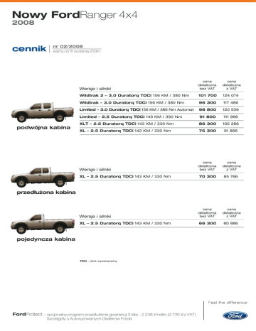 Nowy FordRanger 4x4 2008 cennik nr 02/2008 wa˝ny od 15 wrzeÊnia 2008 r. podwójna kabina Wersje i silniki cena detaliczna bez VAT cena detaliczna z VAT Wildtrak 2 – 3.0 Duratorq TDCi 156 KM / 380 Nm 101 700 124 074 Wildtrak – 3.0 Duratorq TDCi 156 KM / 380 Nm 96 300 117 486 Limited – 3.0 Duratorq TDCi 156 KM / 380 Nm Automat 98 800 120 536 Limited – 2.5 Duratorq TDCi 143 KM / 330 Nm 91 800 111 996 XLT – 2.5 Duratorq TDCi 143 KM / 330 Nm 86 300 105 286 XL – 2.5 Duratorq TDCi 143 KM / 330 Nm 75 300 91 866 Wersje i silniki cena detaliczna bez VAT cena detaliczna z VAT XL – 2.5 Duratorq TDCi 143 KM / 330 Nm 70 300 85 766 Wersje i silniki cena detaliczna bez VAT cena detaliczna z VAT XL – 2.5 Duratorq TDCi 143 KM / 330 Nm 66 300 80 886 przed∏u˝ona kabina pojedyncza kabina TDCi - silnik wysokopr´˝ny FordProtect – opcjonalny program przed∏u˝enia gwarancji 3 lata – 2 238 z∏ netto (2 730 z∏ z VAT) Szczegó∏y u Autoryzowanych Dealerów Forda Nowy FordRanger 4x4 2008 wybrane elementy wyposa˝enia i opcje charakterystyka techniczna Wspomaganie kierownicy Zawieszenie przednie niezale˝ne, z podwójnymi wahaczami, drà˝kiem skr´tnym, teleskopowymi amortyzatorami o dwukierunkowym dzia∏aniu i stabilizatorem poprzecznym Zawieszenie tylne typu „Berlin Eye” – resory piórowe z teleskopowymi amortyzatoram i o dwukierunkowym dzia∏aniu System zdalnego od∏àczania blokady piast przednich kó∏ (RFW) Tylny most z mechanizmem ró˝nicowym z ograniczonym poÊlizgiem Zbiornik paliwa 70 litrów Wentylowane hamulce tarczowe z przodu, b´bnowe z ty∏u ited ildtrak Lim W XL XLT S S S S S S S S S S S S S S S S S S S S S S S S S S S S S – S S S S S S S S S S S S S S S S S S S S S/S S S S S S S S S S S/S S S S S S S S bezpieczeƒstwo Poduszki czo∏owe kierowcy i pasa˝era Poduszki boczne kierowcy i pasa˝era Uk∏ad ABS Przednie fotele o profilu zapobiegajàcym wysuni´ciu si´ spod pasów Immobiliser PATS komfort Klimatyzacja Centralny zamek ze zdalnym sterowaniem Elektrycznie regulowane szyby przednie/tylne (tylne tylko w wersji z podwójnà kabinà) Elektrycznie regulowane lusterka zewn´trzne Kolumna kierownicy o regulowanej wysokoÊci Skórzane ko∏o kierownicy Skórzana ga∏ka dêwigni zmiany biegów Zestaw wskaêników terenowych (kompas, przechy∏y) Nakladki progów chromowane OÊwietlenie wn´k na nogi 4000/4880 S S S S/S S/S S S S S – S – S – – – S – – system audio 2 g∏oÊniki w drzwiach przednich (pojedyncza i przed∏u˝ana kabina) 4 g∏oÊniki w drzwiach przednich/tylnych (podwójna kabina) Radio CD/MP3 2–DIN Radio 6–CD/MP3 2–DIN + 2 g∏oÊniki wysokotonowe S S S – – S – S – S – S – S – S – – – S – – – S – – – S tapicerka Welurowa tapicerka foteli Tapicerka skórzana – czarna Tapicerka skórzana – perforowana Alcantara i skóra s – wyposa˝enie standardowe – – niedost´pne Nowy FordRanger 4x4 2008 wybrane elementy wyposa˝enia i opcje elementy zewn´trzne XL Chomowana krata wlotu powietrza – Krata wlotu powietrza w kolorze nadwozia S Przednie lampy przeciwmgielne – Zewnetrzne klamki drzwi i tylnej burty w kolorze nadwozia – Chromowane zewnetrzne klamki drzwi i tylnej burty – Obudowy lusterek zewnetrznych w kolorze nadwozia – Chromowane obudowy lusterek zewnetrznych – Chromowane obudowy lusterek zewnetrznych ze zintegrowanymi kierunkowskazami – Nak∏adki nadkoli lakierowane – Boczne stopnie rurowe z polerowanej stali nierdzewnej – Tylny zderzak rurowy chromowany – Czujniki cofania – Nakladka na zderzak przedni – Sportowe orurowanie skrzyni – rury z polerowanej stali nierdzewnej za kabinà – Sportowa nak∏adka skrzyni – aerodynamiczna, z tworzywa w kolorze nadwozia, za kabinà – Lakier metalizowany 1700/2074 Dolny pas nadwozia i nak∏adki nadkoli w kolorze Titanium Grey – Reling dachowy w kolorze aluminum – XLT ited ildtrak Lim W S – S S – S – – S S S – – S – S S – S – S – S – S – S S S S S S – S – – S – S – S – – S S S S S S – S S S – S – – S – S – S – S – S – S S S – – – S – – – S – – S skrzynia ∏adunkowa Wewn´trzne zaczepy do mocowania ∏adunku Zewn´trzne relingi do mocowania ∏adunku Wyk∏adzina skrzyni ∏adunkowej Zamykana sztywna roleta skrzyni ∏adunkowej (tylko Wildtrak 2) ko∏a i ogumienie Stalowe obr´cze kó∏ z oponami 235/75R15 16” alufelgi z oponami 245/70R16 16” alufelgi 6–ramienne z oponami 245/70R16 w∏aÊciwoÊci terenowe PrzeÊwit (bez obcià˝enia) Kàt natarcia (bez obcià˝enia) Kàt zejÊcia (bez obcià˝enia) Kàt rampowy (bez obcià˝enia) G∏ebokoÊç brodzenia (bez obcià˝enia) Ârednica zawracania pomi´dzy kraw´˝nikami s – wyposa˝enie standardowe – – niedost´pne 205 mm 34° 33° 28° 750 mm 12,6 m Nowy FordRanger 4x4 2008 Skorzystaj z oferty finansowej FCE Bank Polska: FordKredyt to wyjàtkowo prosty i wygodny kredyt na zakup Twojego nowego Forda – nawet do 100% wartoÊci samochodu. Wszechstronna oferta standardowa oraz atrakcyjne warunki ofert promocyjnych pozwolà na wybranie najodpowiedniejszego wariantu kredytu dla ka˝dego. FCEBank FordLeasing – Atrakcyjne formy leasingu, dzi´ki którym mo˝esz jeêdziç Fordem przy minimalnym zaanga˝owaniu gotówki. FordUbezpieczenia to kompleksowy pakiet ubezpieczeƒ z wyjàtkowo konkurencyjnymi stawkami i du˝à iloÊcià dodatkowych Êwiadczeƒ. O szczegó∏y pytaj Dealera Forda. FordProtect – program przed∏u˝enia gwarancji firmy Ford. FordProtect Za niewielkà cen´ zapewniamy ochron´ przed poniesieniem kosztów niespodziewanych napraw pojazdu nawet do 4 roku i do przebiegu maksymalnie 150 tys. kilometrów. W ramach FordProtect zapewniamy te˝ pe∏nà ochron´ EuroService w takim samym zakresie jak podczas gwarancji podstawowej. O szczegó∏y programu i dost´pne warianty FordProtect pytaj Dealera Forda. Pieczàtka Dealera Cennik zawiera rekomendowane ceny detalic