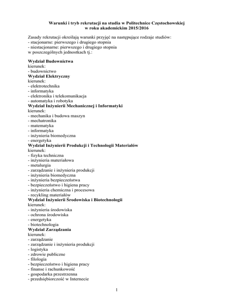 Warunki i tryb rekrutacji na studia w Politechnice Częstochowskiej w roku akademickim 2015/2016 Zasady rekrutacji określają warunki przyjęć na następujące rodzaje studiów: - stacjonarne: pierwszego i drugiego stopnia - niestacjonarne: pierwszego i drugiego stopnia w poszczególnych jednostkach tj.: Wydział Budownictwa kierunek: - budownictwo Wydział Elektryczny kierunek: - elektrotechnika - informatyka - elektronika i telekomunikacja - automatyka i robotyka Wydział Inżynierii Mechanicznej i Informatyki kierunek: - mechanika i budowa maszyn - mechatronika - matematyka - informatyka - inżynieria biomedyczna - energetyka Wydział Inżynierii Produkcji i Technologii Materiałów kierunek: - fizyka techniczna - inżynieria materiałowa - metalurgia - zarządzanie i inżynieria produkcji - inżynieria biomedyczna - inżynieria bezpieczeństwa - bezpieczeństwo i higiena pracy - inżynieria chemiczna i procesowa - recykling materiałów Wydział Inżynierii Środowiska i Biotechnologii kierunek: - inżynieria środowiska - ochrona środowiska - energetyka - biotechnologia Wydział Zarządzania kierunek: - zarządzanie - zarządzanie i inżynieria produkcji - logistyka - zdrowie publiczne - filologia - bezpieczeństwo i higiena pracy - finanse i rachunkowość - gospodarka przestrzenna - przedsiębiorczość w Internecie 1 1. Warunki formalne 1.1 Kandydaci na studia stacjonarne i niestacjonarne zobowiązani są do złożenia w wyznaczonym terminie na poszczególne wydziały następujących dokumentów: - podanie o przyjęcie na studia (na specjalnym formularzu, wydrukowanym z systemu Internetowej Rejestracji Kandydatów IRK), - poświadczoną przez Politechnikę Częstochowską kopię świadectwa dojrzałości; - kandydaci na studia drugiego stopnia dodatkowo poświadczoną przez Politechnikę Częstochowską kopię dyplomu ukończenia studiów, - potwierdzenie wniesienia opłaty za postępowanie kwalifikacyjne, - poświadczoną przez Politechnikę Częstochowską kopię dowodu osobistego, - oświadczenie o spełnianiu warunków do podjęcia i kontynuowania studiów stacjonarnych bez wnoszenia opłat, - aktualne 3 zdjęcia legitymacyjne kandydata, zgodne z wymaganiami stosowanymi przy wydawaniu dowodów osobistych. W związku z prowadzoną rekrutacją internetową, złożenie ww. dokumentów będzie poprzedzone rejestracją kandydatów w systemie IRK. 1.2 Złożenie przez kandydata ww. dokumentów jest równoznaczne z wyrażeniem zgody na umieszczenie jego nazwiska na listach przyjętych i listach rezerwowych oraz zgody na przetwarzanie danych w ramach procedur rekrutacyjnych. 1.3 Kandydaci na studia I stopnia – obywatele polscy oraz osoby nie będący obywatelami polskimi, którzy ubiegają się o przyjęcie na studia na zasadach obowiązujących obywateli polskich, jeżeli ukończyli szkołę średnią za granicą, składają zalegalizowane lub opatrzone apostille zagraniczne świadectwo lub inny dokument uzyskany za granicą, uprawniający do ubiegania się o przyjęcia na studia w uczelniach każdego typu w państwie, w którego systemie działa instytucja wydająca świadectwo.. 1.4 Do zagranicznego świadectwa, o którym mowa w punkcie 1.3, należy dołączyć tłumaczenie na język polski, sporządzone przez tłumacza przysięgłego oraz zaświadczenie o nostryfikacji chyba, że zostanie ono uznane za równoważne odpowiedniemu polskiemu świadectwu dojrzałości lub uprawniające do podjęcia studiów w Rzeczypospolitej Polskiej na podstawie umowy międzynarodowej. 1.5 Kandydaci na studia II stopnia – obywatele polscy oraz osoby nie będący obywatelami polskimi, którzy ubiegają się o przyjęcie na studia na zasadach obywateli polskich, jeżeli ukończyli uczelnię za granicą, składają zalegalizowany lub opatrzony apostille zagraniczny dyplom ukończenia studiów lub inny dokument ukończenia uczelni za granicą, uprawniający do podjęcia studiów drugiego stopnia w państwie, w którym został wydany. 1.6 Do zagranicznego dyplomu ukończenia studiów, o którym mowa w punkcie 1.5, należy dołączyć tłumaczenie na język polski, sporządzone przez tłumacza przysięgłego oraz zaświadczenie o nostryfikacji chyba, że zostanie on uznany za równorzędny z odpowiednim polskim dyplomem ukończenia studiów lub za uprawniający do podjęcia studiów II stopnia w Rzeczypospolitej Polskiej na podstawie umowy międzynarodowej lub na podstawie przepisów ustawy z dnia 27 lipca 2005 roku Prawo o szkolnictwie wyższym. 1.7 Jeżeli podczas rekrutacji nie zostanie złożone zaświadczenie o nostryfikacji, o którym mowa w punkcie 1.4 i 1.6 kandydat zobowiązany jest do jego dostarczenia w terminie nie dłuższym niż do końca pierwszego semestru studiów, a w uzasadnionych przypadkach niezależnych od cudzoziemca, również w terminie późniejszym ustalonym przez Rektora Politechniki Częstochowskiej. 1.8 Przyjęcie na studia osób niebędących obywatelami polskimi (cudzoziemców) następuje w trybie przewidzianym w art. 43 i 44 ustawy z dnia 27 lipca 2005 roku Prawo o szkolnictwie wyższym (Dz. U. nr 164, poz. 1365 z późn. zm.) oraz Rozporządzeniu Ministra Nauki i Szkolnictwa Wyższego z dnia 12 października 2006 r. w sprawie 2 podejmowania i odbywania przez cudzoziemców studiów i szkoleń oraz ich uczestniczenia w badaniach naukowych oraz pracach rozwojowych (Dz. U. Nr 190, poz. 1406 z późn. zm.). 2. Kryteria kwalifikacji na studia 2.1 Rekrutację na studia przeprowadza i decyzję o przyjęciu podejmuje Wydziałowa Komisja Rekrutacyjna. 2.2 Podstawą decyzji o przyjęciu na studia I stopnia, jest wskaźnik rekrutacyjny uzyskany na podstawie wyników z egzaminu maturalnego z następujących przedmiotów: 2.2.1 matematyka – poziom podstawowy (M) lub rozszerzony (MR), przy czym w przypadku: a) kandydatów, którzy zdawali egzamin z matematyki na poziomie rozszerzonym (MR) procent punktów uzyskanych z egzaminu maturalnego mnoży się x 2, b) kandydatów, któr