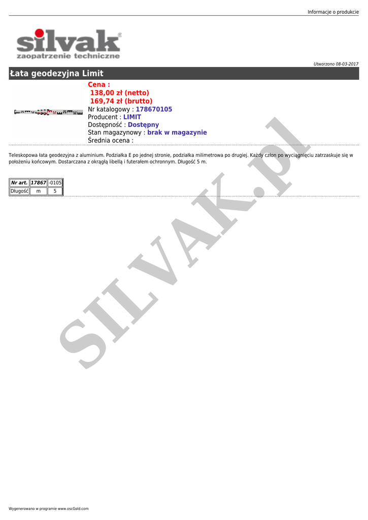 Informacje o produkcie Utworzono 08-03-2017 Łata geodezyjna Limit Cena : 138,00 zł (netto) 169,74 zł (brutto) l Nr katalogowy : 178670105 Producent : LIMIT Dostępność : Dostępny Stan magazynowy : brak w magazynie Średnia ocena : AK .p Teleskopowa łata geodezyjna z aluminium. Podziałka E po jednej stronie, podziałka milimetrowa po drugiej. Każdy człon po wyciągnięciu zatrzaskuje się w położeniu końcowym. Dostarczana z okrągłą libellą i futerałem ochronnym. Długość 5 m. Nr art. 17867 -0105 m 5 SI LV Długość Wygenerowano w programie www.oscGold.com