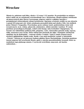 Wrocław Miasto to, położone nad Odrą, słynie z 12 wysp i 112 mostów. Po przyjeździe na miejsce dzieci udały się na zwiedzanie wrocławskiego zoo z Afrykarium. Rozpoczęliśmy zwiedzanie od piaszczystych plaż Morza Czerwonego, poprzez zejście w głębiny morskie z przepięknymi różnorodnymi rafami koralowymi. Ogromne wrażenie zrobiły na nas akwaria z ponad 20 tysiącami ryb. Szlak zwiedzania prowadził dalej nad okolice Nilu i do wielkich jezior Malawi i Tanganika. Przechodząc przez szklany tunel, podziwialiśmy świat wód oceanicznych, m.in. rekiny, płaszczki, ośmiornice, żółwie morskie i meduzy. W części pawilonu przywołującej dżunglę, wokół rzeki Kongo, były krokodyle i hipopotamy. Na terenie zoo widzieliśmy pelikany,foki, pingwiny, rysie, różnorodne gatunki małp, tygrysy, wilki, nosorożce oraz żyrafy, które wdzięcznie pozowały do zdjęć. Następnie autokarem udaliśmy się do Hydropolis - centrum wiedzy o wodzie. Tutaj w ośmiu tematycznych strefach zgłębialiśmy tajniki wody. Każdy z nas miał możliwość zasiąść w batyskafie ,,Trieste”, którym po raz pierwszy badano głębiny Rowu Mariańskiego. Ostatnim punktem naszej wyprawy był wrocławski Rynek, gdzie o zmroku poszukiwaliśmy krasnali, które są symbolem tego pięknego miasta. Z wycieczki wróciliśmy zmęczeni, ale bardzo zadowoleni...