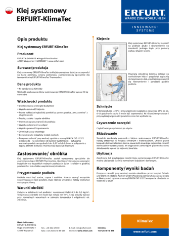 PL Klej systemowy ERFURT-KlimaTec Opis produktu Klejenie Klej systemowy ERFURT-KlimaTec nanosić na podłoże grubo i równomiernie na szerokość jednego brytu przy pomocy wałka z długim runem. Klej systemowy ERFURT-KlimaTec Producent ERFURT & SOHN KG • Hugo-Erfurt-Straße 1 42399 Wuppertal • GERMANY • www.erfurt.com Surowce/produkcja Klej systemowy ERFURT-KlimaTec to klej dyspersyjny o dużej przyczepności na bazie polimeru, octanu poliwinylu, zaprojektowany specjalnie dla termowłókniny ERFURT-KlimaTec Thermovlies. Przyciętą okładzinę ścienną położyć na naniesionym kleju i przycisnąć szpachlą do tapetowania tak, aby klej rozprowadził się równomiernie i powstało gładkie podłoże. Dane produktu •Nr zamówienia 1001202 Wielkość opakowania kleju systemowego ERFURT-KlimaTec wynosi 10 kg na wiadro Właściwości produktu Schnięcie •Do stosowania wewnątrz budynków •Wysoka zdolność klejenia •Proste nakładanie gładkiej powłoki za pomocą wałka „owcza wełna” z długim runem •Prosta, szybka i czysta obróbka •Optymalna przyczepność do podłoża W temperaturze + 20°C i przy wilgotności względnej powietrza 65% po ok. 6-12 godzinach sucha i może być tapetowana. W niższej temperaturze i przy wyższej wilgotności powietrza czas ten wydłuża się. Czyszczenie narzędzi •Wysoka odporność na wilgoć •Wysoka pewność tapetowania Czyścić wodą natychmiast po użyciu. •20 minut czasu otwartego Składowanie •Bez domieszki związków metali ciężkich •Przepuszczalność pary wodnej zgodnie z normą DIN EN ISO 12 572 odpowiada – w zależności od budowy systemowej – dyfuzyjnej warstwie powietrza o grubości ok. 0,07 m lub 0,04 m w połączeniu z tapetą ERFURT-KlimaTec Thermovlies Basic lub Premium Szczelnie zamknięty pojemnik z klejem systemowym ERFURT-KlimaTec należy składować w miejscu chłodnym i niekorozyjnym. Chronić przed bezpośrednim działaniem słońca; zawartość otwartego pojemnika chronić ewentualnie warstwą wody. W oryginalnie zamkniętym pojemniku okres składowania wynosi co najmniej dwa lata. Zastosowanie/ obróbka Utylizacja Klej systemowy ERFURT-KlimaTec został opracowany specjalnie do asortymentu tapet ERFURT-Thermovlies. Możliwość stosowania wewnątrz budynków na wszystkich nośnych podłożach ścian i sufitów o gładkiej powierzchni lub o lekko uwydatnionej strukturze. Przygotowanie podłoża Podłoże musi być suche, czyste i stabilne. Należy usunąć wszystkie nieprzylegające stare powłoki. Duże różnice wysokości należy wyrównać masą szpachlową. Zaschnięte lub przylegające resztki kleju systemowego ERFURT-KlimaTec można utylizować razem z normalnymi odpadami domowymi. Komponenty/wyniki badań Przepuszczalność pary wodnej została określona przez instytut Schallund Wärmemeßstelle Aachen GmbH [Placówkę pomiaru hałasu oraz ciepła w Akwizgranie] zgodnie z normą DIN EN ISO 12 572 w raporcie z badania nr 1030509-D-WDD. Warunki obróbki Zużycie w zależności od podłoża i nanoszonej ilości 0,3 do 0,5 kg/m2. Temperatura obróbki nie może być niższa niż 10°C. Czas otwarty wynosi przy normalnych warunkach w zakresie temperatur i wilgotności ok. 20 minut. KlimaTec Made in Germany ERFURT & SOHN KG Hugo-Erfurt-Straße 1 42399 Wuppertal Tel.: +49 202 6110 0 faks: +49 202 6110 89 451 E-mail: [email protected] Internet: www.erfurt.com Infolinia: +49 202 6110 375 www.erfurt.com