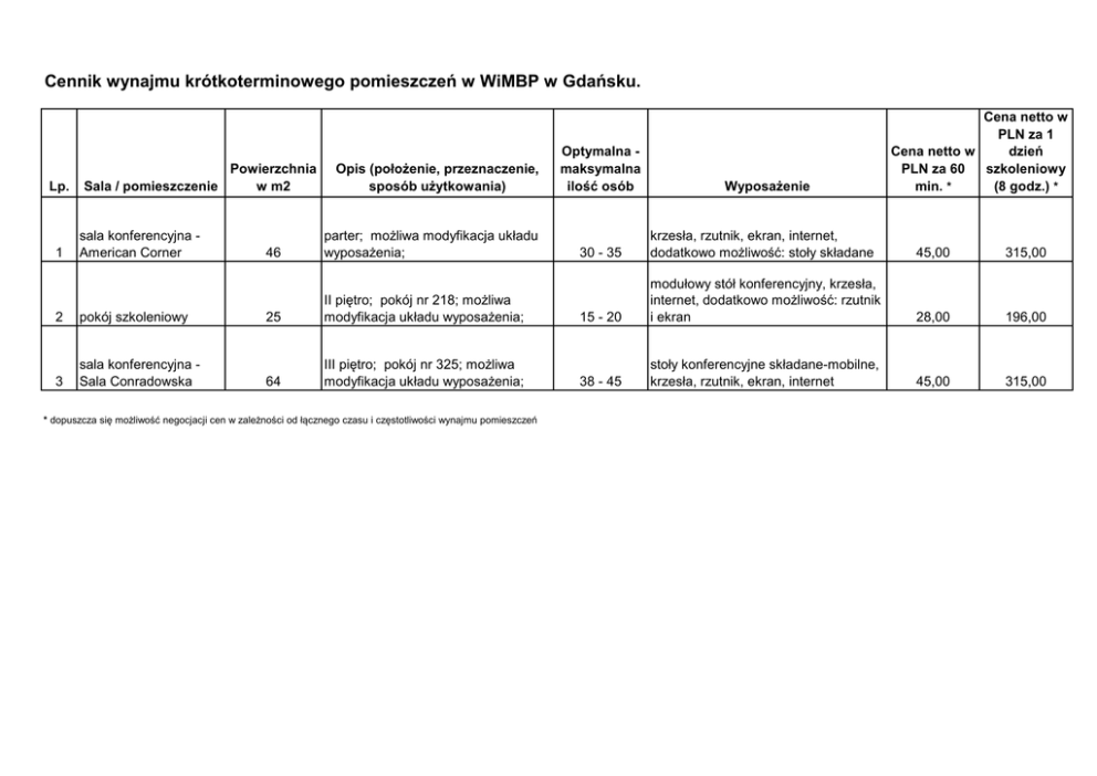 Cennik wynajmu krótkoterminowego pomieszczeń w WiMBP w Gdańsku. Lp. 1 Sala / pomieszczenie sala konferencyjna American Corner 2 pokój szkoleniowy 3 sala konferencyjna Sala Conradowska Powierzchnia w m2 Opis (położenie, przeznaczenie, sposób użytkowania) 46 parter; możliwa modyfikacja układu wyposażenia; 25 II piętro; pokój nr 218; możliwa modyfikacja układu wyposażenia; 64 III piętro; pokój nr 325; możliwa modyfikacja układu wyposażenia; * dopuszcza się możliwość negocjacji cen w zależności od łącznego czasu i częstotliwości wynajmu pomieszczeń Optymalna maksymalna ilość osób Wyposażenie Cena netto w PLN za 1 Cena netto w dzień PLN za 60 szkoleniowy min. * (8 godz.) * 30 - 35 krzesła, rzutnik, ekran, internet, dodatkowo możliwość: stoły składane 45,00 315,00 15 - 20 modułowy stół konferencyjny, krzesła, internet, dodatkowo możliwość: rzutnik i ekran 28,00 196,00 38 - 45 stoły konferencyjne składane-mobilne, krzesła, rzutnik, ekran, internet 45,00 315,00
