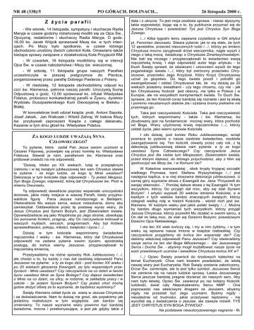 NR 48 (338)/5 PO GÓRACH, DOLINACH... Z Ŝycia parafii - We wtorek, 14 listopada, sympatycy i słuchacze Radia Maryja w czasie godziny róŜańcowej modlili się za Ojca Św., Ojczyznę, redaktorów i słuchaczy Radia Maryja. O godz. 18.00 ks. Jacek Wójcik sprawował Mszę św. w tych intencjach. Po Mszy było spotkanie, w czasie którego obchodzono urodziny dwóch członkiń Koła. Omawiano takŜe bieŜące sprawy związane z działalnością Koła Przyjaciół RM - W czwartek, 16 listopada modliliśmy się w intencji Ojca Św. w czasie naboŜeństwa i Mszy św. wieczornej. - W sobotę, 11 listopada grupa naszych Parafian uczestniczyła w pieszej pielgrzymce do Pierśca, zorganizowanej przez parafię Dobrego Pasterza z Polany. - W niedzielę, 12 listopada obchodziliśmy odpust ku czci św. Klemensa, patrona naszej parafii. Uroczystą Sumę Odpustową o godz. 12.00 sprawował ks. infułat Władysław Fidelus, proboszcz konkatedralnej parafii w śywcu, dyrektor Wydziału Duszpasterskiego Kurii Diecezjalnej w Bielsku Białej. 26 listopada 2000 r. dala i z ukrycia. To jest moja osobista sprawa - nieraz słyszymy takie wypowiedzi, bojąc się o to, by publicznie przyznać się do Jezusa Chrystusa i powiedzieć Tyś jest Chrystus Syn Boga śywego. /.../ Kilka tygodni temu zapewne czytaliście w GN artykuł pt. Fenomen dwunastu. Stawia pytanie: jak to się stało, Ŝe tych 12 apostołów, przecieŜ nieuczonych ludzi /.../, którzy po śmierci Chrystusa mocno zaryglowali drzwi wieczernika, nagle wyszli z niego z taką mocą świadcząc o Chrystusie Zmartwychwstałym. Nie bali się niczego i przypieczętowali to świadectwo swoją męczeńską krwią. I daje odpowiedź autor tego artykułu - to Duch Święty sprawił, Ŝe oświeceni i umocnieni wyszli do tego pogańskiego świata /.../, który był zwrócony przeciwko Chrystusowi, przeciwko Jego KrzyŜowi. Który KrzyŜ Chrystusowy uznał za głupstwo. Do tego świata poszli i potrafili go ewangelizować i oddać Chrystusowi tak, Ŝe my dzisiaj po 20 wiekach jesteśmy świadkami - czy tego chcemy, czy nie - jak ten Chrystusowy Kościół jest obecny, nie tylko w Polsce i w Europie, ale na wszystkich kontynentach świata. To Duch Św. sprawia, Ŝe ten Kościół coraz bardziej się rozrasta i jest tą skałą i pomimo nieustannych ataków zła i szatana bramy piekielne nie przemogą go. W koncelebrze brali udział księŜa: prob. Antoni Sapota, Józef Jaksik, Jan Waliczek i Witold Zahraj. W trakcie Mszy św. przybywali zaproszeni KsięŜa z całego dekanatu. Kazanie w tym dniu głosił ks. Władysław Fidelus. Taka jest rzeczywistość Kościoła. Taka jest rzeczywistość tych, których wspominamy - takŜe i św. Klemensa, bo zbudowany jest na fundamencie mocnej wiary, która pochodzi od Boga. Wiary uŜyźnionej krwią męczenników /.../, którzy oddali Ŝycie, jako wierni synowie Kościoła. ZA KOGO LUDZIE UWAśAJĄ SYNA CZŁOWIECZEGO? I oto dzisiaj, pod koniec Roku Jubileuszowego, wciąŜ powraca to pytanie o nasze osobiste świadectwo, osobiste zaangaŜowanie się. Ten kościół, otwarty przez cały rok, z tą dekoracją jubileuszową stawia nam pytanie: a ty za kogo uwaŜasz Syna Człowieczego? Czy rzeczywiście Jezus Chrystus jest dla ciebie tym Mesjaszem, Zbawicielem świata, przed którym klękasz, do którego przychodzisz, aby z Nim się zjednoczyć we Mszy św. i w Komunii św? To pytanie, które zadał Pan Jezus swoim uczniom w Cezarei Filipowej, przewijało się przez homilię ks. Władysława Fidelusa. Stawiał je nam, parafianom św. Klemensa oraz próbował znaleźć na nie odpowiedź. “Dzisiaj, blisko po XX wiekach, tutaj w przepięknym Ustroniu i w tej świątyni jubileuszowej ten sam Chrystus stawia to pytanie - za kogo ludzie, za kogo ty Mnie uwaŜasz? Dekoracja w tym kościele daje odpowiedź - Ty jesteś Mesjasz, Syn Boga śywego; odpwiedź, którą dał Chrystusowi św. Piotr w imieniu Dwunastu. Tę odpowiedź dawaliście poprzez wspaniałe uroczystości domowe, jakie miały miejsce w waszej Parafii, kiedy przyjmowaliście figurę Pana Jezusa narodzonego w Betlejem. Otwieraliście Mu wasze serca, wasze mieszkania, domy aby zamieszkał. Oddawaliście przez tę postawę wyraz wiary, Ŝe Jezus Chrystus jest Synem BoŜym, jest Zbawicielem świata. Opowiedzieliście się jako Wspólnota po Jego stronie, obwołując Go ponownie Królem, pragnąc, aby On rzeczywiście królował w waszych myślach, sercach, pragnieniach. Aby był Królem sprawiedliwości, pokoju, miłości, świętości i Ŝycia /.../. Dzisiaj w tym kościele wspominamy świadectwo męczennika I wieku - św. Klemensa, który dał Chrystusowi odpowiedź na zadane pytanie swoim Ŝyciem, apostolską posługą, do końca wierny Jezusowi, przypieczętował to męczeńską śmiercią. PrzeŜywaliśmy na róŜne sposoby Rok Jubileuszowy /.../, ale chodzi o to, by kaŜdy z nas dał osobistą odpowiedź Panu Jezusowi na pytanie: a ty za kogo dziś - pod koniec XX wieku i po 20 wiekach głoszenia Ewangelii, po tylu wspaniałych przeŜyciach - Mnie uwaŜasz? Czy rzeczywiście na co dzień w twoim Ŝyciu uwaŜasz Mnie za Syna BoŜego? Czy dajesz świadectwo o Mnie na co dzień, na ulicy, w rodzinie, w zakładzie pracy i w szkole - Ŝe jestem Synem BoŜym? Czy jesteś choć trochę gotów złoŜyć ofiarę za to wyznanie, Ŝe będziesz wyśmiany? Święty Klemens oddał Ŝycie za wiarę w Jezusa Chrystusa i za doświadczenie. Nam to dzisiaj nie grozi, ale popatrzmy jak jesteśmy małoduszni w tym względzie. Jak bardzo się zmieniamy. To nasze wyznanie wiary powinno być bardziej świadome, mocne i przekonywujące, a jest jak gdyby takie z W Katedrze warszawskiej , obok krypty kryjącej szczątki wielkiego Prymasa, kard. Stefana Wyszyńskiego /.../ jest następna kaplica, a w niej stosowna dekoracja jubileuszowa. U samej góry wypisane słowa z Ewangelii św. Jana “Przyszedł do swojej własności...”. PoniŜej dalsze słowa z tej Ewangelii “A tym wszystkim, którzy 