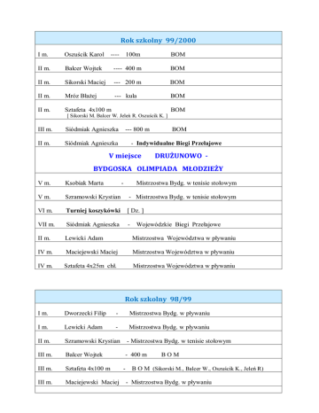 Rok szkolny 99/2000 I m. Oszuścik Karol II m. ---- 100m BOM Balcer Wojtek ---- 400 m BOM II m. Sikorski Maciej --- 200 m BOM II m. Mróz Błażej --- kula BOM II m. Sztafeta 4x100 m BOM [ Sikorski M. Balcer W. Jeleń R. Oszuścik K. ] III m. Siódmiak Agnieszka II m. Siódmiak Agnieszka --- 800 m BOM - Indywidualne Biegi Przełajowe V miejsce DRUŻUNOWO - BYDGOSKA OLIMPIADA MŁODZIEŻY Mistrzostwa Bydg. w tenisie stołowym V m. Ksobiak Marta - V m. Szramowski Krystian - Mistrzostwa Bydg. w tenisie stołowym VI m. Turniej koszykówki [ Dz. ] VII m. Siódmiak Agnieszka - II m. Lewicki Adam Mistrzostwa Województwa w pływaniu IV m. Maciejewski Maciej Mistrzostwa Województwa w pływaniu IV m. Sztafeta 4x25m chł. Mistrzostwa Województwa w pływaniu Wojewódzkie Biegi Przełajowe Rok szkolny 98/99 I m. Dworzecki Filip - Mistrzostwa Bydg. w pływaniu I m. Lewicki Adam - Mistrzostwa Bydg. w pływaniu II m. Szramowski Krystian - Mistrzostwa Bydg. w tenisie stołowym III m. Balcer Wojtek - 400 m III m. Sztafeta 4x100 m III m. Maciejewski Maciej - BOM B O M (Sikorski M., Balcer W., Oszuścik K., Jeleń R) - Mistrzostwa Bydg. w pływaniu Mistrzostwa Bydg. w tenisie stołowym III m. Lutomska Justyna - IV m. Balcer Wojtek - IV m. Sztafeta 4x25 - Mistrzostwa Województwa Kuj. - Pom. w pływaniu V m. Oszuścik Karol - 100 m BOM V m. Mróz Błażej - kula BOM Indywidualne Biegi Przełajowe VI m. DRUŻYNOWO - BYDGOSKA OLIMPIADA MŁODZIEŻY Rok szkolny 97/98 II m. Mistrzostwa Bydgoszczy w piłce ręcznej [ Dz. ] II m. Ksobiak Marta II m. Sztefeta 4x100m Bydgoska Olimpiada Młodzieży [ Sikorski M., Oszuścik K. ,Ściesiński K., Centała T. ] II m. Sztafeta 400x300x200x100 BOM [ Balcer W.,Orkiszewski J., Bornus M., Centała T. ] III m. Sztafetowe Biegi Przełajowe III m. Dworzecki Filip - Mistrzostwa Bydg. w pływaniu V m. Balcer Wojtek - 800 m V m. Placek Robert - oszczep VI m. Turniej koszykówki VII m. VIII m. Oszuścik Karol Drużynowo Mistrzostwa Bydg. w tenisie stołowym - [ Dz. ] BOM BOM [ Dz. ] - 100 m B O M - Bydgoska Olimpiada Młodzieży Rok szkolny 96/97 III m. Sztafetowe Biegi Przełajowe [ Dz. ] III m. Sztafetowe Biegi Przełajowe [ Chł. ] III m. Balcer Wojtek III m. Kropiński Tomasz - Mistrzostwa Bydg. w pływaniu III m. Kęsik Lucyna Mistrzostwa Bydg. w pływaniu III m. Sztafeta 8x25m CHŁ. Indywidualne Biegi Przełajowe - - Mistrzostwa Bydg. w pływaniu IV m. Makowski Marek IV m. Turniej Piłki Nożnej V m. VIII m. Drużynowo Koszykówka [ Chł. ] Mistrzostwa Bydg. w tenisie stołowym - [ Chł. ] - Mistrzostwa Bydg. w pływaniu Mistrzostwa Bydgoszczy Rok szkolny 95/96 II m. III m. Mistrzostwa Bydgoszczy w piłce siatkowej [ Dz. ] Kropiński Tomasz - Mistrzostwa Bydgoszczy w pływaniu III m. Kanclerz Tomasz - Mistrzostwa Bydg. w pływaniu VI m. Sztafetowe Biegi Przełajowe VI m. Turniej Koszykówki [Chł. ] VII m. Drużynowo - [Chł. ] Mistrzostwa Bydg. w pływaniu Rok szkolny 94/95 VII m. - Turniej koszykówki [ Chł. ]