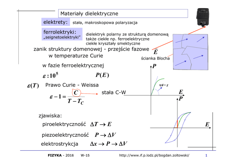 Materiały dielektryczne elektrety: stała, makroskopowa polaryzacja ferrolektryki: dielektryk polarny ze strukturą domenową także ciekłe np. ferroelektryczne ciekłe kryształy smektyczne „seignetoelektryki” zanik struktury domenowej - przejście fazowe E w temperaturze Curie ścianka Blocha w fazie ferroelektrycznej : 10 5 (T ) P P (E ) Prawo Curie - Weissa C 1 T TC tg stała C-W E P zjawiska: piroelektryczność T E piezoelektryczność P V x P V elektrostrykcja FIZYKA - 2016 2016 W -1 5 E http://www.if.p.lodz.pl/bogdan.zoltowski/ 1 Model przewodnictwa elektrycznego w metalach model przewodnictwa : 1900 - Paul Karl Ludwig Drude elektrony swobodne; el. przewodnictwa gaz elektronowy ruchy termiczne v 10 6 m / s średnia droga swobodna średni czas dq E 0 0 dt wyp (1863-1906) E dq E 0 0 dt wyp FIZYKA - 2016 2016 W -1 5 http://www.if.p.lodz.pl/bogdan.zoltowski/ 2 Natężenie prądu F qE m m v d a a AB vd v d const A E B qE m vd i dq E 0 i dt i A C s 100W E v d 10 4 m / s prędkość dryfu E Q I t 220V i 0,5 A i vd umowny kierunek prądu FIZYKA - 2016 2016 W -1 5 http://www.if.p.lodz.pl/bogdan.zoltowski/ 3 Prawo Ohma Gęstość prądu di j dA A j 2 m E dA dA cos dq i j dA cos j dA dt i n Prędkość dryfu vd vd e m qE E m Ruchliwość nośników xx yx zx xy xz yy yz zy zz Ośrodek anizotropowy W -1 5 vd j n vd e m2 vd E Vs j E 1m 1 FIZYKA - 2016 2016 j dN Koncentracja nośników prąd dV j dq , dt , A j n vd e n e E ne Przewodnictwo właściwe dA Prawo Ohma Georg Simon Ohm 1787-1854 http://www.if.p.lodz.pl/bogdan.zoltowski/ 4 Prawo Ohma (postać techniczna) j E dla i=const j i A E const A i E A i U i U d A 1 V 1 i U prawo Ohma R A d R R rezystancja E U d (oporność elektryczna) Natężenie prądu w odcinku przewodnika jest proporcjonalne do różnicy potencjałów między końcami Natężenie prądu w odcinku przewodnika nie zależy od polaryzacji napięcia i i i tg 1 R U U przewodnik metaliczny ‘omowy element’ U i termistor złącze p-n U elektrolit FIZYKA - 2016 2016 W -1 5 http://www.if.p.lodz.pl/bogdan.zoltowski/ 5 1 Oporność właściwa m miedź: Oporność właściwa 1.7 10 8 m węgiel: german: 3.5 10 5 m szkło: 4.6 10 1 m 1 1010 m Temperaturowa zależność przewodnictwa T 1 A amplituda drgań sieci e m ne FIZYKA - 2016 2016 W -1 5 http://www.if.p.lodz.pl/bogdan.zoltowski/ 6 Temperaturowa zależność oporności T 0 T K 1 temperaturowy współczynnik oporności właściwej (T ) 0 0 T nikiel: (T ) 0 (1 T ) 6 10 3 K 1 5 10 4 K 1 węgiel: (T ) 0 (1 1T 2 T 2 .. 3 T 3 ) tg 0 T T półprzewodnik metal FIZYKA - 2016 2016 W -1 5 http://www.if.p.lodz.pl/bogdan.zoltowski/ 7 Nadprzewodnictwo- rozwój badań Hg w T=4.2 oK Heike Kamerlingh Ones (1911) przewodnik Kwantowa teoria „BSC” – pary Cooper’a T TC nadprzewodnik John Bardeen Leon Cooper John Schrieffer (1957) makroskopowy efekt kwantowy Nadprzewodniki „wysokotemperaturowe” TC=30K In- Tc=3,4 K Pb -Tc=7,2 K Nb3Ge - Tc=20,3 K Y1Ba2Cu3F2Oy - Tc=155 K Alex Muller, Georg Bednorz (1986) Organiczne nadprzewodniki – min. o strukturze nano rurek węglowych FIZYKA - 2016 2016 W -1 5 http://www.if.p.lodz.pl/bogdan.zoltowski/ 8 Nadprzewodnictwo - zastosowania Bezstratne magazynowanie energii elektrycznej Efekt Meissnera - Ochnsenfelda „lewitacja magnetyczna” Efekt tunelowy Josephsona złącze Josephsona Walter Meissner (1933) Superconducting Magnetic Energy Storage System (D-SMES) 2000r. 3 MW x 25 SQUID Brian Josephson (1962) Superkomputery Yamanashi MLX01 MagLev 2003 – 581 km/h petaflop =1015op/sec Hypres Superconducting Microchip, 6000 złączy Josephsona http://superconductors.org/ FIZYKA - 2016 2016 W -1 5 http://www.if.p.lodz.pl/bogdan.zoltowski/ 9 Spadek potencjału wzdłuż przewodnika V U iR i A B wzdłuż przewodnika potencjał spada w kierunku przepływu prądu R i B A D A V D U C C R B A D i B V1 V2 R1 R2 V 0 zachowawczy charakter pola Vźr E dl 0 E dl V1 V2 Vźr 0 w zamkniętej części obwodu suma spadków napięć jest = 0 FIZYKA - 2016 2016 W -1 5 II prawo Kirchoffa http://www.if.p.lodz.pl/bogdan.zoltowski/ 10 Siła elektromotoryczna (SEM) R i B Utrzymanie przepływu prądu w obwodzie wymaga przeniesienia ładunku + z punktu D do A tj. przez źródło. SEM - praca sił zewnętrznych przeniesienia jednostkowego ładunku dodatniego wzdłuż obwodu. C D A SEM źródła– jest równa różnicy potencjałów pomiędzy biegunami źródła otwartego Zasada zachowania energii: Praca związana z przepływem prądu wzdłuż obwodu równa jest energii dostarczonej przez źródło. iRi SEM k i k II prawo Kirchoffa układ zastępczy źródła iRi irw n SEM k i n i C R D k rw U zewn SEM irw FIZYKA - 2016 2016 W -1 5 B E A SEM http://www.if.p.lodz.pl/bogdan.zoltowski/ 11 Praca i moc prądu stałego dq i dt U U iR R i dW dqU idtU i 2 Rdt moc wydzielona na oporniku dW P i2R dt U2 P R P Ui P Wat VA praca prądu wykonana w ciągu czasu t t W Pdt Uit i 2 Rt W VAs [kWh] 0 W i 2 Rt ciepło Joule’a i i U FIZYKA - 2016 2016 T R i U nieliniowość rezystorów W -1 5 http://www.if.p.lodz.pl/bogdan.zoltowski/ 12