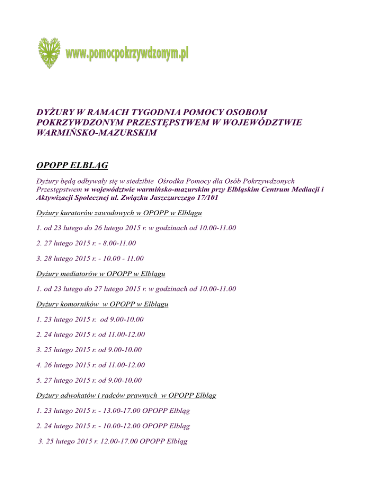 DYŻURY W RAMACH TYGODNIA POMOCY OSOBOM POKRZYWDZONYM PRZESTĘPSTWEM W WOJEWÓDZTWIE WARMIŃSKO-MAZURSKIM OPOPP ELBLĄG Dyżury będą odbywały się w siedzibie Ośrodka Pomocy dla Osób Pokrzywdzonych Przestępstwem w województwie warmińsko-mazurskim przy Elbląskim Centrum Mediacji i Aktywizacji Społecznej ul. Związku Jaszczurczego 17/101 Dyżury kuratorów zawodowych w OPOPP w Elblągu 1. od 23 lutego do 26 lutego 2015 r. w godzinach od 10.00-11.00 2. 27 lutego 2015 r. - 8.00-11.00 3. 28 lutego 2015 r. - 10.00 - 11.00 Dyżury mediatorów w OPOPP w Elblągu 1. od 23 lutego do 27 lutego 2015 r. w godzinach od 10.00-11.00 Dyżury komorników w OPOPP w Elblągu 1. 23 lutego 2015 r. od 9.00-10.00 2. 24 lutego 2015 r. od 11.00-12.00 3. 25 lutego 2015 r. od 9.00-10.00 4. 26 lutego 2015 r. od 11.00-12.00 5. 27 lutego 2015 r. od 9.00-10.00 Dyżury adwokatów i radców prawnych w OPOPP Elbląg 1. 23 lutego 2015 r. - 13.00-17.00 OPOPP Elbląg 2. 24 lutego 2015 r. - 10.00-12.00 OPOPP Elbląg 3. 25 lutego 2015 r. 12.00-17.00 OPOPP Elbląg Dyżury prokuratorów Prokuratury Rejonowej w Elblągu ul. Płk. Dąbka 8-12 1. od 23 lutego do 27 lutego 2015 r. w godzinach od 8.00-15.00 Dyżury prokuratorów Prokuratury Okręgowej w Elblągu ul. Bulwar Zygmunta Augusta 13 1. 23 lutego 2015 r. - od 8.00-18.00 2. 24 lutego 2015 r. - od 8.00-15.30 3. 25 lutego 2015 r. - od 8.00-15.30 4. 26 lutego 2015 r. - od 8.00-15.30 5. 27 lutego 2015 r. - od 8.00-15.30 OPOPP OLSZTYN Dyżury będą odbywały się w siedzibie Ośrodka Pomocy dla Osób Pokrzywdzonych Przestępstwem w województwie warmińsko-mazurskim przy Elbląskim Centrum Mediacji i Aktywizacji Społecznej Filia OPdOPP w Olsztynie – ul. Dąbrowszczaków 39, VII piętro (naprzeciwko windy). Dyżury kuratorów zawodowych w Olsztynie : 1. dnia 23 lutego 2015 r. w godz. 14.00- 16.00- kurator Piotr Wesołowski 2. dnia 24 lutego 2015 r. kurator zawodowy Grażyna Kuraszkieiwcz 3. dnia 26 lutego 2015 r. w godz. 13.00- 17.00- kurator Małgorzata Janasz 4. dnia 27 lutego 2015 r. w godz. 12.00- 15.00 - kurator Emilia Keller Dyżury kuratorów zawodowych w Nidzicy: 1. środa 25 lutego 2015 r. - w godzinach 17.00-20.00 A. 17.00-18.30 : Mirosław Antkiewicz, Małgorzata Drzewiecka,Ewa Krasnowska, B. 18.30-20.00: Grzegorz Baranowski,Marzena Bruzda. Dyżury będą odbywały się w siedzibie Ośrodka Pomocy dla Osób Pokrzywdzonych Przestępstwem w województwie warmińsko-mazurskim przy Elbląskim Centrum Mediacji i Aktywizacji Społecznej Punkt Poradniczy w Nidzicy – „BERGO” sp.z o.o. ul. Kościuszki 30; 12-100 Nidzica. Dyżury adwokatów i radców prawnych w OPOPP Olsztyn 1. 23 lutego 2015 r. - 12.00-13.00 2. 24 lutego 2015 r. - 12.00-13.00 3. 25 lutego 2015 r. - 15.00-18.00 4. 26 lutego 2015 r. - 12.00-15.00 OPOPP Olsztyn 5. 27 lutego 2015 r. - 12.00-13.00 3. 28 lutego 2015 r. 12.30-14.30 OPOPP Olsztyn Filia OPdOPP w Olsztynie – ul. Dąbrowszczaków 39, VII piętro (naprzeciwko windy). Dyżury adwokata w OPOPP Kętrzyn 1. 23 lutego 2015r. - 14.00 – 18.00 OPOPP Kętrzyn ul. Pocztowa 11, pok 211 Starostwo Powiatowe Dyżury pracowników socjalnych w Komendzie Powiatowej Policji Kętrzyn ul. Wojska Polskiego (świetlica) 1. 23.02.2015r godz. 10.00 - 12.00 – pracownik socjalny 2. 25.02.2015r godz. 10.00 – 12.00 pracownik socjalny 3. 26.02.2015r godz. 10 .00 – 12.00 pracownik socjalny ds. przemocy 4. 27.02.2015r godz. 10.00 – 12.00 pracownik socjalny ds. profilaktyki uzależnień Dyżury adwokata w OPOPP Mrągowo 1. 25 lutego 2015 r. - 15.00-20.00 OPOPP Mrągowo – ul. Wojska Polskiego 22/2; Stowarzyszenie na Rzecz Pomocy Rodzinie „Synapsa” Dyżury adwokata w OPOPP Szczytno 1. 24 lutego 2015 r. 17.00-20.00 OPOPP Szczytno – ul. Kościuszki 1 „PRODOMUS” Dyżury adwokata w OPOPP Nidzica 1. 25 lutego 2015 r. 17.00-20.00 OPOPP Nidzica – ul. Kościuszki 30 „BERGO” Dyżury prokuratorów Prokuratury Rejonowej w Iławie ul. Andersa pok. 2 1. 23 - 28 lutego 2015 r. 9.00 – 15.00 Dyżury prokuratorów Prokuratury Rejonowej w Nowym Mieście Lubawskim ul. Grunwaldzka 28 23 - 27 lutego 2015 r. 8.00 – 15.30 Dyżury prokuratorów Prokuratury Rejonowej w Szczytnie ul. Marii Konopnickiej 61 23-27 lutego 2015r. 7.30 – 15.30 Dyżury prokuratorów Prokuratury Rejonowej Olsztyn – Północ w Olsztynie ul. Emilii Plater 12 23-27 lutego 2015r. 7.30 – 15.30 oraz dyżur mediatora 23 lutego 10.00- 12.00, 24 lutego 10.00-12.00
