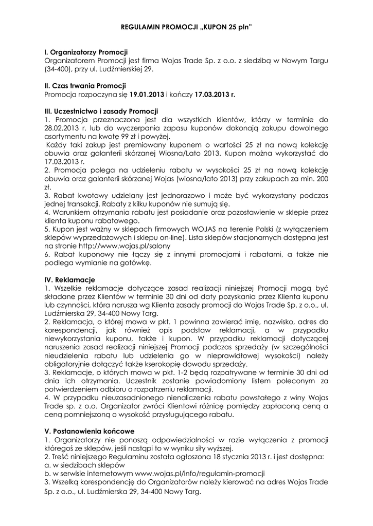 REGULAMIN PROMOCJI „KUPON 25 pln” I. Organizatorzy Promocji Organizatorem Promocji jest firma Wojas Trade Sp. z o.o. z siedzibą w Nowym Targu (34-400), przy ul. Ludźmierskiej 29. II. Czas trwania Promocji Promocja rozpoczyna się 19.01.2013 i kończy 17.03.2013 r. III. Uczestnictwo i zasady Promocji 1. Promocja przeznaczona jest dla wszystkich klientów, którzy w terminie do 28.02.2013 r. lub do wyczerpania zapasu kuponów dokonają zakupu dowolnego asortymentu na kwotę 99 zł i powyżej. Każdy taki zakup jest premiowany kuponem o wartości 25 zł na nową kolekcję obuwia oraz galanterii skórzanej Wiosna/Lato 2013. Kupon można wykorzystać do 17.03.2013 r. 2. Promocja polega na udzieleniu rabatu w wysokości 25 zł na nową kolekcję obuwia oraz galanterii skórzanej Wojas (wiosna/lato 2013) przy zakupach za min. 200 zł. 3. Rabat kwotowy udzielany jest jednorazowo i może być wykorzystany podczas jednej transakcji. Rabaty z kilku kuponów nie sumują się. 4. Warunkiem otrzymania rabatu jest posiadanie oraz pozostawienie w sklepie przez klienta kuponu rabatowego. 5. Kupon jest ważny w sklepach firmowych WOJAS na terenie Polski (z wyłączeniem sklepów wyprzedażowych i sklepu on-line). Lista sklepów stacjonarnych dostępna jest na stronie http://www.wojas.pl/salony 6. Rabat kuponowy nie łączy się z innymi promocjami i rabatami, a także nie podlega wymianie na gotówkę. IV. Reklamacje 1. Wszelkie reklamacje dotyczące zasad realizacji niniejszej Promocji mogą być składane przez Klientów w terminie 30 dni od daty pozyskania przez Klienta kuponu lub czynności, która narusza wg Klienta zasady promocji do Wojas Trade Sp. z o.o., ul. Ludźmierska 29, 34-400 Nowy Targ. 2. Reklamacja, o której mowa w pkt. 1 powinna zawierać imię, nazwisko, adres do korespondencji, jak również opis podstaw reklamacji, a w przypadku niewykorzystania kuponu, także i kupon. W przypadku reklamacji dotyczącej naruszenia zasad realizacji niniejszej Promocji podczas sprzedaży (w szczególności nieudzielenia rabatu lub udzielenia go w nieprawidłowej wysokości) należy obligatoryjnie dołączyć także kserokopię dowodu sprzedaży. 3. Reklamacje, o których mowa w pkt. 1-2 będą rozpatrywane w terminie 30 dni od dnia ich otrzymania. Uczestnik zostanie powiadomiony listem poleconym za potwierdzeniem odbioru o rozpatrzeniu reklamacji. 4. W przypadku nieuzasadnionego nienaliczenia rabatu powstałego z winy Wojas Trade sp. z o.o. Organizator zwróci Klientowi różnicę pomiędzy zapłaconą ceną a ceną pomniejszoną o wysokość przysługującego rabatu. V. Postanowienia końcowe 1. Organizatorzy nie ponoszą odpowiedzialności w razie wyłączenia z promocji któregoś ze sklepów, jeśli nastąpi to w wyniku siły wyższej. 2. Treść niniejszego Regulaminu została ogłoszona 18 stycznia 2013 r. i jest dostępna: a. w siedzibach sklepów b. w serwisie internetowym www.wojas.pl/info/regulamin-promocji 3. Wszelką korespondencję do Organizatorów należy kierować na adres Wojas Trade Sp. z o.o., ul. Ludźmierska 29, 34-400 Nowy Targ.