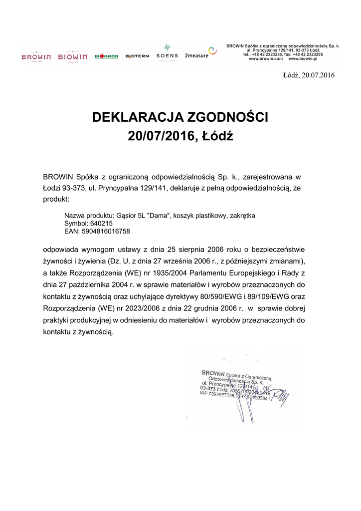 Łódź, 20.07.2016 DEKLARACJA ZGODNOŚCI 20/07/2016, Łódź BROWIN Spółka z ograniczoną odpowiedzialnością Sp. k., zarejestrowana w Łodzi 93-373, ul. Pryncypalna 129/141, deklaruje z pełną odpowiedzialnością, że produkt: Nazwa produktu: Gąsior 5L "Dama", koszyk plastikowy, zakrętka Symbol: 640215 EAN: 5904816016758 odpowiada wymogom ustawy z dnia 25 sierpnia 2006 roku o bezpieczeństwie żywności i żywienia (Dz. U. z dnia 27 września 2006 r., z późniejszymi zmianami), a także Rozporządzenia (WE) nr 1935/2004 Parlamentu Europejskiego i Rady z dnia 27 października 2004 r. w sprawie materiałów i wyrobów przeznaczonych do kontaktu z żywnością oraz uchylające dyrektywy 80/590/EWG i 89/109/EWG oraz Rozporządzenia (WE) nr 2023/2006 z dnia 22 grudnia 2006 r. w sprawie dobrej praktyki produkcyjnej w odniesieniu do materiałów i wyrobów przeznaczonych do kontaktu z żywnością. Łódź, 20.07.2016 Declaration of Compliance 20/07/2016, Łódź BROWIN company, placed in Łódź 93-373, 129/141 Pryncypalna Street, declares that following product: Product: Glass container 5 L Symbol: 640215 EAN: 5904816016758 is consistent with requirements included in Regulation (EC) No 1935/2004 of the European Parliament and of the Council of 27th October 2004 on materials and articles intended to come into contact with food and repealing Directives 80/590/EEC and 89/109 EEC, and Regulation (EC) No 2023/2006 of 22 December 2006 on good manufacturing practice for materials and articles intended to come into contact with food.