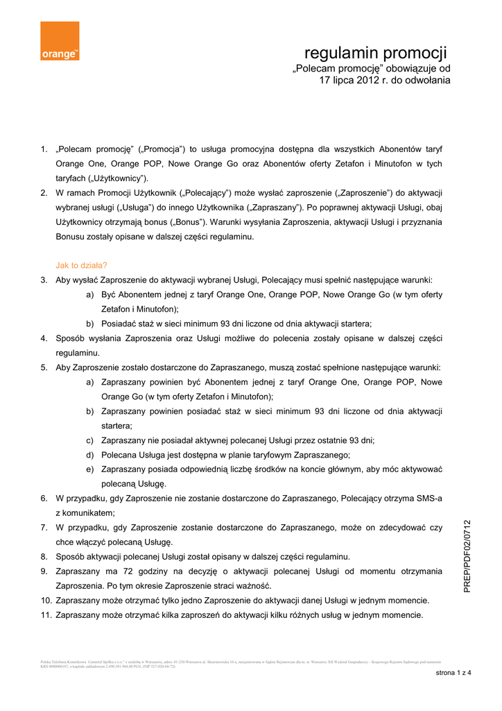regulamin promocji „Polecam promocję” obowiązuje od 17 lipca 2012 r. do odwołania 1. „Polecam promocję” („Promocja”) to usługa promocyjna dostępna dla wszystkich Abonentów taryf Orange One, Orange POP, Nowe Orange Go oraz Abonentów oferty Zetafon i Minutofon w tych taryfach („Użytkownicy”). 2. W ramach Promocji Użytkownik („Polecający”) może wysłać zaproszenie („Zaproszenie”) do aktywacji wybranej usługi („Usługa”) do innego Użytkownika („Zapraszany”). Po poprawnej aktywacji Usługi, obaj Użytkownicy otrzymają bonus („Bonus”). Warunki wysyłania Zaproszenia, aktywacji Usługi i przyznania Bonusu zostały opisane w dalszej części regulaminu. Jak to działa? 3. Aby wysłać Zaproszenie do aktywacji wybranej Usługi, Polecający musi spełnić następujące warunki: a) Być Abonentem jednej z taryf Orange One, Orange POP, Nowe Orange Go (w tym oferty Zetafon i Minutofon); b) Posiadać staż w sieci minimum 93 dni liczone od dnia aktywacji startera; 4. Sposób wysłania Zaproszenia oraz Usługi możliwe do polecenia zostały opisane w dalszej części regulaminu. 5. Aby Zaproszenie zostało dostarczone do Zapraszanego, muszą zostać spełnione następujące warunki: a) Zapraszany powinien być Abonentem jednej z taryf Orange One, Orange POP, Nowe Orange Go (w tym oferty Zetafon i Minutofon); b) Zapraszany powinien posiadać staż w sieci minimum 93 dni liczone od dnia aktywacji startera; c) Zapraszany nie posiadał aktywnej polecanej Usługi przez ostatnie 93 dni; d) Polecana Usługa jest dostępna w planie taryfowym Zapraszanego; e) Zapraszany posiada odpowiednią liczbę środków na koncie głównym, aby móc aktywować polecaną Usługę. 6. W przypadku, gdy Zaproszenie nie zostanie dostarczone do Zapraszanego, Polecający otrzyma SMS-a 7. W przypadku, gdy Zaproszenie zostanie dostarczone do Zapraszanego, może on zdecydować czy chce włączyć polecaną Usługę. 8. Sposób aktywacji polecanej Usługi został opisany w dalszej części regulaminu. 9. Zapraszany ma 72 godziny na decyzję o aktywacji polecanej Usługi od momentu otrzymania Zaproszenia. Po tym okresie Zaproszenie straci ważność. PREP/PDF02/0712 z komunikatem; 10. Zapraszany może otrzymać tylko jedno Zaproszenie do aktywacji danej Usługi w jednym momencie. 11. Zapraszany może otrzymać kilka zaproszeń do aktywacji kilku różnych usług w jednym momencie. Polska Telefonia Komórkowa Centertel Spółka z o.o.” z siedzibą w Warszawie, adres: 01-230 Warszawa ul. Skierniewicka 10 a, zarejestrowana w Sądzie Rejonowym dla m. st. Warszawy XII Wydział Gospodarczy – Krajowego Rejestru Sądowego pod numerem KRS 0000006107, o kapitale zakładowym 2.690.501.964,00 PLN, (NIP 527-020-68-72) strona 1 z 4 12. W przypadku, gdy w okresie pomiędzy otrzymaniem Zaproszenia, a próbą aktywacji polecanej Usługi Zapraszany dokona czynności w wyniku której przestanie spełniać warunki Promocji (np. migracja do innej taryfy, w której nie jest dostępna polecana Usługa lub aktywacja tej samej co polecana Usługa w inny sposób niż opisany w regulaminie Promocji), możliwość aktywacji Usługi z Zaproszenia zostanie zablokowana. Polecający i Zapraszający otrzymają w tej sytuacji SMS-y z komunikatem. 13. Polecający może wysłać dowolną liczbę Zaproszeń w dowolnym czasie. Jakie Usługi można polecić? 14. Polecający może polecić do aktywacji jedną z następujących Usług: Numer usługi Nazwa usługi Opis usługi Cena Ważność Taryfa, w jakiej usługa usługi usługi jest dostępna 1 „SMS-y za Grosze” (jednorazowy) 600 SMS do Orange 6 zł 30 dni Nowe Orange Go 2 „Grosz za SMS” 600 SMS do Orange 6 zł 30 dni Orange POP 3 „Pakiet SMS” 600 SMS do Orange 6 zł 30 dni Orange One 4 „1000 minut” 1000 minut do Orange 10 zł 14 dni Orange One 5 „1000 minut na zawołanie” 1000 minut do Orange 10 zł 14 dni Orange POP 6 „Pakiet Internetowy 30-dniowy” pakiet 100 MB 10 zł 30 dni wszystkie taryfy 7 „Pakiet Internetowy XXL” pakiet 500 MB 15 zł 30 dni wszystkie taryfy 8 „Pakiet Internetowy 1-dniowy” pakiet 100 MB 2 zł 1 dzień wszystkie taryfy 15. Regulaminy oraz szczegółowe opisy działania Usług wymienionych w punkcie 13 są dostępne na www.orange.pl. Jak wysłać Zaproszenie do aktywacji Usługi? 16. Aby wysłać Zaproszenie do aktywacji wybranej Usługi, Polecający może: a) Skontaktować się z Biurem Obsługi Klienta dzwoniąc pod numer *100 (koszt połączenia zgodnie z cennikiem Użytkownika), wskazać którą Usługę chciałby polecić i podać numer telefonu osoby Zapraszanej do aktywacji Usługi; b) Wysłać SMS o treści „XXXXXXXXX, &” pod numer 575 (koszta jak za SMS do Orange wg cennika Użytkownika), gdzie „XXXXXXXXX” oznacza numer telefonu Zapraszanego, a „&” oznacza numer polecanej Usługi zgodnie z listą możliwych do polecenia usług opisaną w telefonu 500123456, wyślij SMS o treści „500123456, 3” pod numer 575. Jak przyjąć Zaproszenie do aktywacji Usługi i jak aktywować Usługę? 17. Zaproszenie zostanie automatycznie dostarczone do Zapraszanego SMS-em pod warunkiem spełnienia założeń Promocji opisanych w regulaminie. 18. Po otrzymaniu Zaproszenia, Zapraszany ma 72 godziny od momentu otrzymania Zaproszenia na PREP/PDF02/0712 punkcie 13 regulaminu. Przykład: aby polecić „Pakiet SMS” znajomemu o numerze decyzję, czy chce włączyć poleconą Usługę. 19. Aby włączyć polecaną Usługę, należy w przeciągu 72 godzin odpowiedzieć pozytywnie na otrzymane Polska Telefonia Komórkowa Centertel Spółka z o.o.” z siedzibą w Warszawie, adres: 01-230 Warszawa ul. Skierniewicka 10 a, zarejestrowana w Sądzie Rejonowym dla m. st. Warszawy XII Wydział Gospodarczy – Krajowego Rejestru Sądowego pod numerem KRS 0000006107, o kapitale zakładowym 2.690.501.964,00 PLN, (NIP 527-020-68-72) strona 2 z 4 20. Zaproszenie zgodnie z instrukcją w nim zawartą. Aktywacja odbywa się poprz