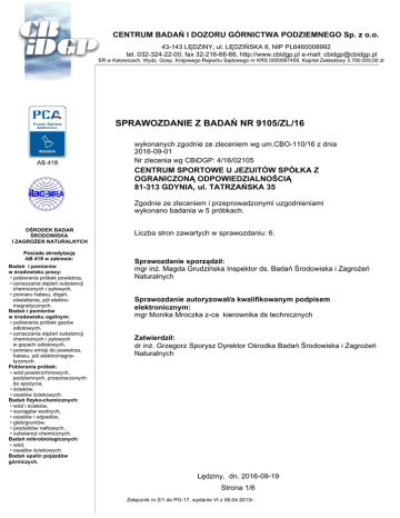 CENTRUM BADAŃ I DOZORU GÓRNICTWA PODZIEMNEGO Sp. z o.o. 43-143 LĘDZINY, ul. LĘDZIŃSKA 8, NIP PL6460008992 tel. 032-324-22-00, fax 32-216-66-66, http://www.cbidgp.pl e-mail: [email protected] SR w Katowicach, Wydz. Gosp. Krajowego Rejestru Sądowego nr KRS 0000067459, Kapitał Zakładowy 3.700.000,00 zł SPRAWOZDANIE Z BADAŃ NR 9105/ZL/16 wykonanych zgodnie ze zleceniem wg um.CBO-110/16 z dnia 2016-09-01 Nr zlecenia wg CBiDGP: 4/16/02105 CENTRUM SPORTOWE U JEZUITÓW SPÓŁKA Z OGRANICZONĄ ODPOWIEDZIALNOŚCIĄ 81-313 GDYNIA, ul. TATRZAŃSKA 35 Zgodnie ze zleceniem i przeprowadzonymi uzgodnieniami wykonano badania w 5 próbkach. OŚRODEK BADAŃ ŚRODOWISKA I ZAGROŻEŃ NATURALNYCH Posiada akredytację AB 418 w zakresie: Badań i pomiarów w środowisku pracy: • pobierania próbek powietrza, • oznaczania stężeń substancji chemicznych i pyłowych, • pomiaru hałasu, drgań, oświetlenia, pól elektromagnetycznych. Badań i pomiarów w środowisku ogólnym: • pobierania próbek gazów odlotowych, • oznaczania stężeń substancji chemicznych i pyłowych w gazach odlotowych, • pomiaru emisji do powietrza, hałasu, pól elektromagnetycznych. Pobierania próbek: • wód powierzchniowych, podziemnych, przeznaczonych do spożycia, • ścieków, • osadów ściekowych. Badań fizyko-chemicznych: • wód i ścieków, • wyciągów wodnych, • osadów i odpadów, • gleb/gruntów, • produktów naftowych, • substancji chemicznych. Badań mikrobiologicznych: • wód, • osadów ściekowych. Badań spalin pojazdów górniczych. Liczba stron zawartych w sprawozdaniu: 6. Sprawozdanie sporządził: mgr inż. Magda Grudzińska Inspektor ds. Badań Środowiska i Zagrożeń Naturalnych Sprawozdanie autoryzował/a kwalifikowanym podpisem elektronicznym: mgr Monika Mroczka z-ca kierownika ds technicznych Zatwierdził: dr inż. Grzegorz Sporysz Dyrektor Ośrodka Badań Środowiska i Zagrożeń Naturalnych Lędziny, dn. 2016-09-19 Strona 1/6 Załącznik nr 2/1 do PO-17, wydanie VI z 08.04.2013r. CBiDGP Sp. z o.o. Sprawozdanie z badań Nr 9105/ZL/16 Strona: 2 z dnia 2016-09-19 Stron: 6 Załącznik nr 2/1 do PO-17, wydanie VI z 08.04.2013r. Nazwa klienta: CENTRUM SPORTOWE U JEZUITÓW SPÓŁKA Z OGRANICZONĄ ODPOWIEDZIALNOŚCIĄ 81-313 GDYNIA, TATRZAŃSKA 35 Miejsce pobierania próbki: Tatrzańska 35, Gdynia Próbkę pobrał: Pracownik CBiDGP wg PN-ISO 5667-5:2003-metoda akredytowana, PN-EN ISO 19458:2007-metoda akredytowana Data dostarczenia próbki: 2016-09-07 Próbkę dostarczył: Pracownik CBiDGP Stan próbki bez zastrzeżeń Numer próbki 12191/ZL1/16 Data/godzina pobierania próbki 2016-09-07 Miejsce pobierania próbki / opis woda z niecki Rodzaj próbki Woda - w niecce S.j.* Parametr Metoda badawcza/ Metoda oznaczenia Jednostka Zakres wykonania oznaczenia Dopuszczalne wartości Wyniki badań / Niepewność A Liczba bakterii z rodzaju Legionella PN-EN ISO 11731-2:2008 Filtry membranowe [j.t.k./100ml] od 1 j.t.k./100 ml 0 nie wykryto CBiDGP Sp. z o.o. Sprawozdanie z badań Nr 9105/ZL/16 Strona: 3 z dnia 2016-09-19 Stron: 6 Załącznik nr 2/1 do PO-17, wydanie VI z 08.04.2013r. Nazwa klienta: CENTRUM SPORTOWE U JEZUITÓW SPÓŁKA Z OGRANICZONĄ ODPOWIEDZIALNOŚCIĄ 81-313 GDYNIA, TATRZAŃSKA 35 Miejsce pobierania próbki: Tatrzańska 35, Gdynia Próbkę pobrał: Pracownik CBiDGP wg PN-ISO 5667-5:2003-metoda akredytowana, PN-EN ISO 19458:2007-metoda akredytowana Data dostarczenia próbki: 2016-09-07 Próbkę dostarczył: Pracownik CBiDGP Stan próbki bez zastrzeżeń Numer próbki 12193/ZL1/16 Data/godzina pobierania próbki 2016-09-07 Miejsce pobierania próbki / opis zawór w SUW Rodzaj próbki Woda wodociągowa S.j.* Parametr Metoda badawcza/ Metoda oznaczenia Jednostka Zakres wykonania oznaczenia Dopuszczalne wartości Wyniki badań / Niepewność A Liczba bakterii z rodzaju Legionella PN-EN ISO 11731-2:2008 Filtry membranowe [j.t.k./100ml] od 1 j.t.k./100 ml 0 nie wykryto CBiDGP Sp. z o.o. Sprawozdanie z badań Nr 9105/ZL/16 Strona: 4 z dnia 2016-09-19 Stron: 6 Załącznik nr 2/1 do PO-17, wydanie VI z 08.04.2013r. Nazwa klienta: CENTRUM SPORTOWE U JEZUITÓW SPÓŁKA Z OGRANICZONĄ ODPOWIEDZIALNOŚCIĄ 81-313 GDYNIA, TATRZAŃSKA 35 Miejsce pobierania próbki: Tatrzańska 35, Gdynia Próbkę pobrał: Pracownik CBiDGP wg PN-ISO 5667-5:2003-metoda akredytowana, PN-EN ISO 19458:2007-metoda akredytowana Data dostarczenia próbki: 2016-09-07 Próbkę dostarczył: Pracownik CBiDGP Stan próbki bez zastrzeżeń Numer próbki 12259/ZL1/16 Data/godzina pobierania próbki 2016-09-07 Miejsce pobierania próbki / opis natrysk/szatnia męska/ Rodzaj próbki Woda - w natryskach S.j.* Parametr Metoda badawcza/ Metoda oznaczenia Jednostka Zakres wykonania oznaczenia Dopuszczalne wartości Wyniki badań / Niepewność A Liczba bakterii z rodzaju Legionella PN-EN ISO 11731-2:2008 Filtry membranowe [j.t.k./100ml] od 1 j.t.k./100 ml < 100 nie wykryto Legionella sp.-n ależy badać w instalacach wody ciepłej. Próbkę należy pobierać przynajmniej z 1 na 10 natrysków CBiDGP Sp. z o.o. Sprawozdanie z badań Nr 9105/ZL/16 Strona: 5 z dnia 2016-09-19 Stron: 6 Załącznik nr 2/1 do PO-17, wydanie VI z 08.04.2013r. Nazwa klienta: CENTRUM SPORTOWE U JEZUITÓW SPÓŁKA Z OGRANICZONĄ ODPOWIEDZIALNOŚCIĄ 81-313 GDYNIA, TATRZAŃSKA 35 Miejsce pobierania próbki: Tatrzańska 35, Gdynia Próbkę pobrał: Pracownik CBiDGP wg PN-ISO 5667-5:2003-metoda akredytowana, PN-EN ISO 19458:2007-metoda akredytowana Data dostarczenia próbki: 2016-09-07 Próbkę dostarczył: Pracownik CBiDGP Stan próbki bez zastrzeżeń Numer próbki 12260/ZL1/16 Data/godzina pobierania próbki 2016-09-07 Miejsce pobierania próbki / opis natrysk/szatnia dodatkowa/ Rodzaj próbki Woda - w natryskach S.j.* Parametr Metoda badawcza/ Metoda oznaczenia Jednostka Zakres wykonania oznaczenia Dopuszczalne wartości Wyniki badań / Niepewność A Liczba bakterii z rodzaju Legionella PN-EN ISO 11731-2:2008 Filtry membranowe [j.t.k./100ml] o
