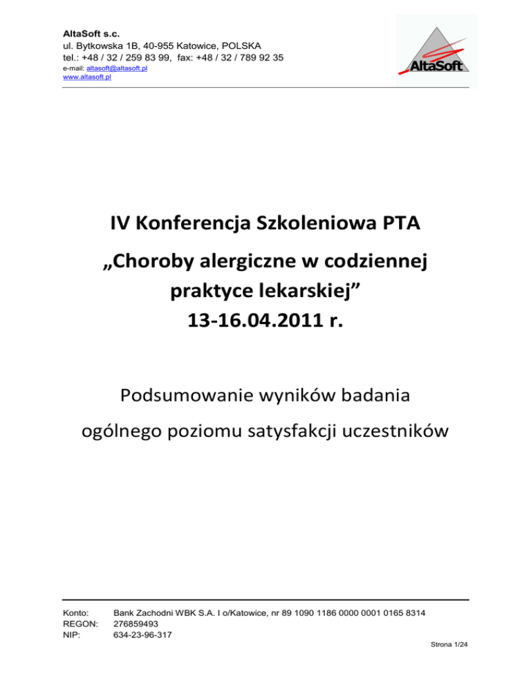 AltaSoft s.c. ul. Bytkowska 1B, 40-955 Katowice, POLSKA tel.: +48 / 32 / 259 83 99, fax: +48 / 32 / 789 92 35 e-mail: [email protected] www.altasoft.pl IV Konferencja Szkoleniowa PTA „Choroby alergiczne w codziennej praktyce lekarskiej” 13-16.04.2011 r. Podsumowanie wyników badania ogólnego poziomu satysfakcji uczestników Konto: REGON: NIP: Bank Zachodni WBK S.A. I o/Katowice, nr 89 1090 1186 0000 0001 0165 8314 276859493 634-23-96-317 Strona 1/24 AltaSoft s.c. Strona 2/24 AltaSoft s.c. Zawartość 1. Wstęp .............................................................................................................................................. 4 2. Statystyka personalna, liczba ankiet ............................................................................................... 5 3. Struktura ankiety, zasady oceny...................................................................................................... 5 4. Ogólna ocena konferencji................................................................................................................ 6 5. Ocena wykładów ............................................................................................................................. 7 5.1. Rozkład procentowy i liczbowy ocen....................................................................................... 8 5.1.1. 5.2. 6. Rozkład procentowy i liczbowy ocen............................................................................. 11 5.2.2. Podstawowe wartości statystyczne (średnie, mediany …) ............................................ 12 Ocena warsztatów ......................................................................................................................... 13 Ocena poszczególnych warsztatów ....................................................................................... 14 6.1.1. Rozkład procentowy i liczbowy ocen............................................................................. 14 6.1.2. Podstawowe wartości statystyczne (średnie, mediany …) ............................................ 17 6.2. 8. Ocena elementów wykładów (podsumowanie) .................................................................... 11 5.2.1. 6.1. 7. Podstawowe wartości statystyczne (średnie, mediany …) ............................................ 10 Ocena elementów warsztatów (podsumowanie) ................................................................. 18 6.2.1. Rozkład procentowy i liczbowy ocen............................................................................. 18 6.2.2. Podstawowe wartości statystyczne (średnie, mediany …) ............................................ 19 Ocena organizacji .......................................................................................................................... 20 7.1. Rozkład procentowy i liczbowy ocen..................................................................................... 20 7.2. Podstawowe wartości statystyczne (średnie, mediany …).................................................... 21 Analiza pytań otwartych ................................................................................................................ 23 Załącznik – wzorzec ankiety .................................................................................................................. 24 Strona 3/24 AltaSoft s.c. 1. Wstęp Dokument stanowi podsumowanie wyników badania ogólnego poziomu satysfakcji uczestników konferencji. Badanie to zostało przeprowadzone za pomocą ankiety (patrz załącznik). Większość pytań to pytania zamknięte, w których respondenci poddają ocenie w skali 0-10 poszczególne nazwane w ankiecie elementy szkolenia (kategorie). Ankieta zawiera także pytania otwarte, pozwalające respondentom na zawarcie dodatkowych uwag. Odpowiedzi na te pytania zostały skategoryzowane podczas procesu analizy ankiet. Ankiety można było pobrać na recepcji konferencji. Wypełnienie i oddanie ankiety było dobrowolne. Każdy respondent oddający ankietę otrzymywał drobny upominek (grę logiczną). Większość ankiet zostało złożonych w sobotę – czyli dzień oficjalnego zakończeniem Konferencji. Strona 4/24 AltaSoft s.c. 2. Statystyka personalna, liczba ankiet W konferencji brało udział ponad 1340 osób, w tym: Słuchaczy wykładów: 1049 Wykładowców: 62 Wystawców/przedstawicieli: około 220 390 osób oddało wypełnioną ankietę. Stanowi to 37,18% wszystkich słuchaczy. Analizę przeprowadzono wielostopniowo. Najpierw wszystkie zebrane ankiety zeskanowano i wykonano statystyki dla pytań zamkniętych. Następnie dokonano kategoryzacji odpowiedzi na pytania otwarte i wreszcie analizy poszczególnych grup odpowiedzi. Wszystkie statystyki liczbowe i deskrypcyjne oraz procentowe podawane są poniżej po analizie wszystkich 390 ankiet. 3. Struktura ankiety, zasady oceny Ankieta składała się z IV części: I. II. III. IV. Wykłady Warsztaty Organizacja Konferencji Państwa uwagi i sugestie W każdej z części I-III wyszczególniono kategorie – elementy szkolenia, które respondenci poddawali ocenie w skali 0-10. Część IV zawierała pytania otwarte, pozwalające na zawarcie dodatkowych uwag i recenzji. Na ocenę wykładów i warsztatów składa się ocena każdej sesji lub każdego warsztatu i ocena poszczególnych elementów wykładów lub warsztatów (np. warunki lokalowe, użyteczność przedstawianej wiedzy itp.) Dla każdej pojedynczej ankiety policzono dodatkowo oceny średnie w każdej grupie pytań (wiersz Ocena Średnia w poniższych tabelach). Na potrzeby statystyk ilościowych policzona ocena średnia zaokrąglana jest matematycznie do wartości całkowitej (czyli wartości mniejsze od 0,5 to ocena 0, wartości większe od 0,5 i mniejsze od 1,5 ocena 1 itd.). We wszystkich statystykach podano także liczebność grupy – N – w stosunku do której liczone były poszczególne wartości. Liczba ta odpowiada li