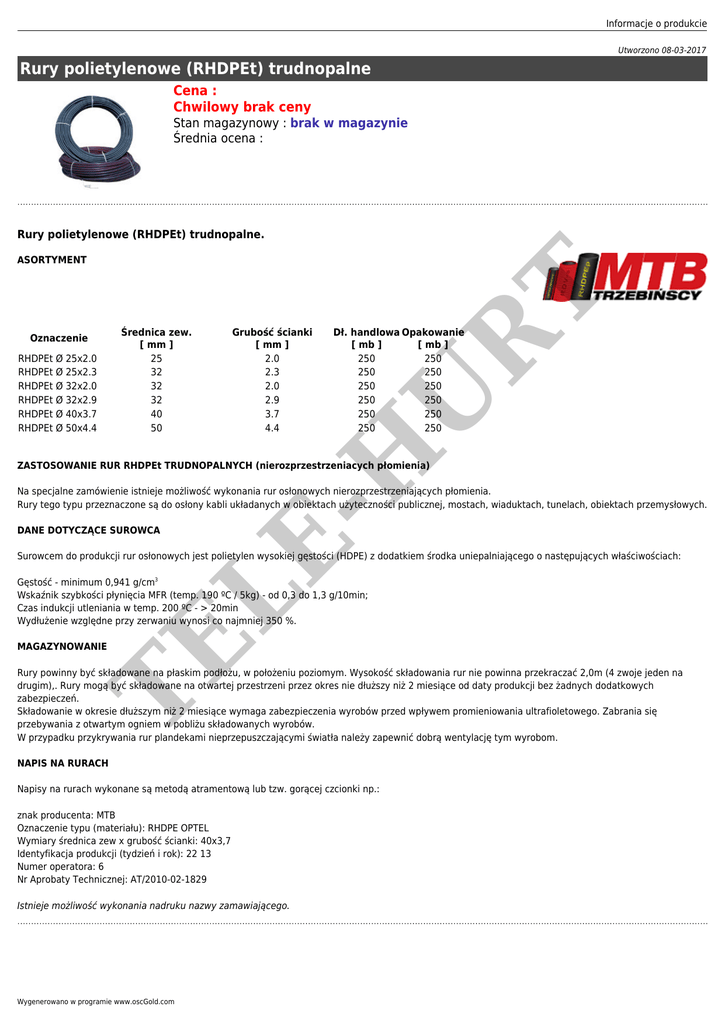 Informacje o produkcie Utworzono 08-03-2017 Rury polietylenowe (RHDPEt) trudnopalne Cena : Chwilowy brak ceny Stan magazynowy : brak w magazynie Średnia ocena : Rury polietylenowe (RHDPEt) trudnopalne. Dł. handlowa Opakowanie [ mb ] [ mb ] 250 250 250 250 250 250 250 250 250 250 250 250 R Grubość ścianki [ mm ] 2.0 2.3 2.0 2.9 3.7 4.4 TE LE -H RHDPEt Ø 25x2.0 RHDPEt Ø 25x2.3 RHDPEt Ø 32x2.0 RHDPEt Ø 32x2.9 RHDPEt Ø 40x3.7 RHDPEt Ø 50x4.4 Średnica zew. [ mm ] 25 32 32 32 40 50 U Oznaczenie T ASORTYMENT ZASTOSOWANIE RUR RHDPEt TRUDNOPALNYCH (nierozprzestrzeniacych płomienia) Na specjalne zamówienie istnieje możliwość wykonania rur osłonowych nierozprzestrzeniających płomienia. Rury tego typu przeznaczone są do osłony kabli układanych w obiektach użyteczności publicznej, mostach, wiaduktach, tunelach, obiektach przemysłowych. DANE DOTYCZĄCE SUROWCA Surowcem do produkcji rur osłonowych jest polietylen wysokiej gęstości (HDPE) z dodatkiem środka uniepalniającego o następujących właściwościach: Gęstość - minimum 0,941 g/cm3 Wskaźnik szybkości płynięcia MFR (temp. 190 ºC / 5kg) - od 0,3 do 1,3 g/10min; Czas indukcji utleniania w temp. 200 ºC - > 20min Wydłużenie względne przy zerwaniu wynosi co najmniej 350 %. MAGAZYNOWANIE Rury powinny być składowane na płaskim podłożu, w położeniu poziomym. Wysokość składowania rur nie powinna przekraczać 2,0m (4 zwoje jeden na drugim),. Rury mogą być składowane na otwartej przestrzeni przez okres nie dłuższy niż 2 miesiące od daty produkcji bez żadnych dodatkowych zabezpieczeń. Składowanie w okresie dłuższym niż 2 miesiące wymaga zabezpieczenia wyrobów przed wpływem promieniowania ultrafioletowego. Zabrania się przebywania z otwartym ogniem w pobliżu składowanych wyrobów. W przypadku przykrywania rur plandekami nieprzepuszczającymi światła należy zapewnić dobrą wentylację tym wyrobom. NAPIS NA RURACH Napisy na rurach wykonane są metodą atramentową lub tzw. gorącej czcionki np.: znak producenta: MTB Oznaczenie typu (materiału): RHDPE OPTEL Wymiary średnica zew x grubość ścianki: 40x3,7 Identyfikacja produkcji (tydzień i rok): 22 13 Numer operatora: 6 Nr Aprobaty Technicznej: AT/2010-02-1829 Istnieje możliwość wykonania nadruku nazwy zamawiającego. Wygenerowano w programie www.oscGold.com