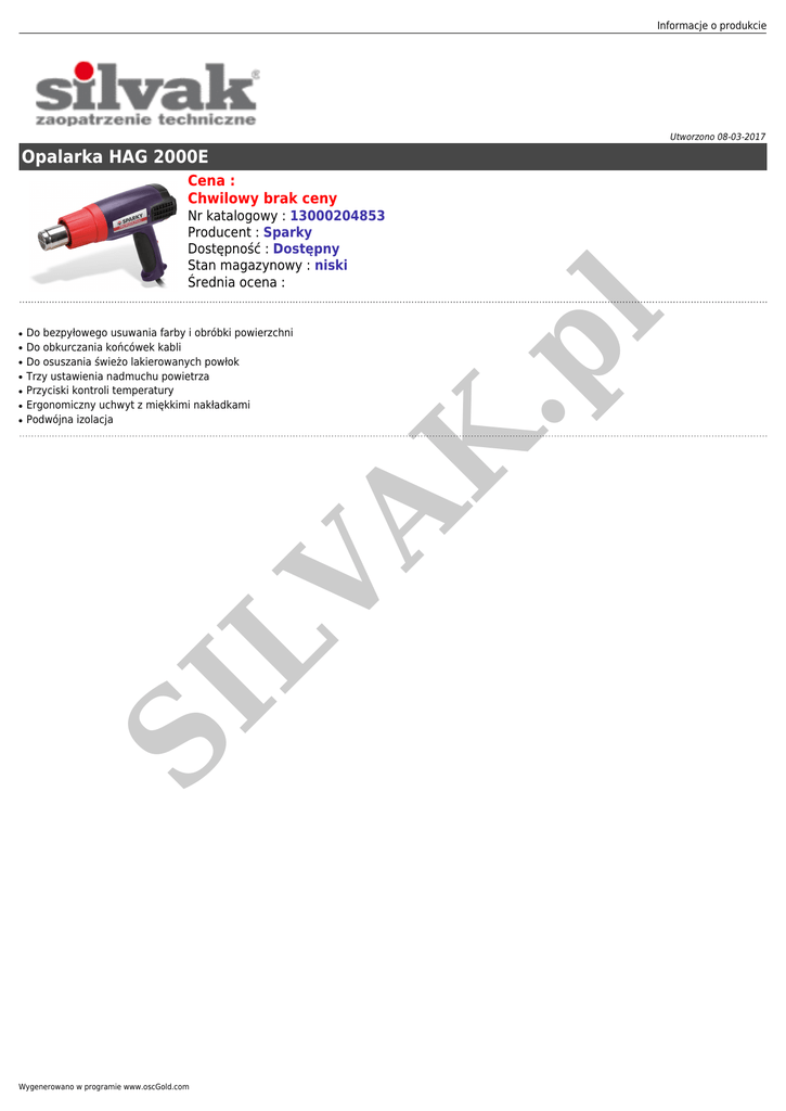 Informacje o produkcie Utworzono 08-03-2017 Opalarka HAG 2000E Cena : Chwilowy brak ceny ● ● ● ● ● SI LV ● Do bezpyłowego usuwania farby i obróbki powierzchni Do obkurczania końcówek kabli Do osuszania świeżo lakierowanych powłok Trzy ustawienia nadmuchu powietrza Przyciski kontroli temperatury Ergonomiczny uchwyt z miękkimi nakładkami Podwójna izolacja AK .p ● l Nr katalogowy : 13000204853 Producent : Sparky Dostępność : Dostępny Stan magazynowy : niski Średnia ocena : Wygenerowano w programie www.oscGold.com