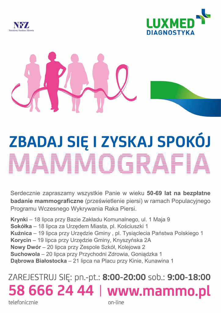 Serdecznie zapraszamy wszystkie Panie w wieku 50-69 lat na bezpłatne badanie mammograficzne (prześwietlenie piersi) w ramach Populacyjnego Programu Wczesnego Wykrywania Raka Piersi. Krynki – 18 lipca przy Bazie Zakładu Komunalnego, ul. 1 Maja 9 Sokółka – 18 lipca za Urzędem Miasta, pl. Kościuszki 1 Kuźnica – 19 lipca przy Urzędzie Gminy , pl. Tysiąclecia Państwa Polskiego 1 Korycin – 19 lipca przy Urzędzie Gminy, Knyszyńska 2A Nowy Dwór – 20 lipca przy Zespole Szkół, Kolejowa 2 Suchowola – 20 lipca przy Przychodni Zdrowia, Goniądzka 1 Dąbrowa Białostocka – 21 lipca na Placu przy Kinie, Kunawina 1