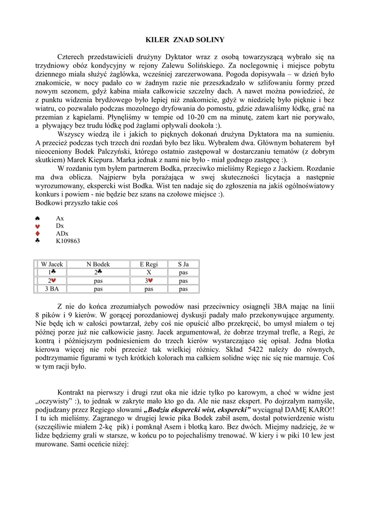KILER ZNAD SOLINY Czterech przedstawicieli drużyny Dyktator wraz z osobą towarzyszącą wybrało się na trzydniowy obóz kondycyjny w rejony Zalewu Solińskiego. Za noclegownię i miejsce pobytu dziennego miała służyć żaglówka, wcześniej zarezerwowana. Pogoda dopisywała – w dzień było znakomicie, w nocy padało co w żadnym razie nie przeszkadzało w szlifowaniu formy przed nowym sezonem, gdyż kabina miała całkowicie szczelny dach. A nawet można powiedzieć, że z punktu widzenia brydżowego było lepiej niż znakomicie, gdyż w niedzielę było pięknie i bez wiatru, co pozwalało podczas mozolnego dryfowania do pomostu, gdzie zdawaliśmy łódkę, grać na przemian z kąpielami. Płynęliśmy w tempie od 10-20 cm na minutę, zatem kart nie porywało, a pływający bez trudu łódkę pod żaglami opływali dookoła :). Wszyscy wiedzą ile i jakich to pięknych dokonań drużyna Dyktatora ma na sumieniu. A przecież podczas tych trzech dni rozdań było bez liku. Wybrałem dwa. Głównym bohaterem był nieoceniony Bodek Palczyński, którego ostatnio zastępował w dostarczaniu tematów (z dobrym skutkiem) Marek Kiepura. Marka jednak z nami nie było - miał godnego zastępcę :). W rozdaniu tym byłem partnerem Bodka, przeciwko mieliśmy Regiego z Jackiem. Rozdanie ma dwa oblicza. Najpierw była porażająca w swej skuteczności licytacja a następnie wyrozumowany, ekspercki wist Bodka. Wist ten nadaje się do zgłoszenia na jakiś ogólnoświatowy konkurs i powiem - nie będzie bez szans na czołowe miejsce :). Bodkowi przyszło takie coś Ax Dx ADx K109863 W Jacek 1 2 3 BA N Bodek 2 pas pas E Regi X 3 pas S Ja pas pas pas Z nie do końca zrozumiałych powodów nasi przeciwnicy osiągnęli 3BA mając na linii 8 pików i 9 kierów. W gorącej porozdaniowej dyskusji padały mało przekonywujące argumenty. Nie będę ich w całości powtarzał, żeby coś nie opuścić albo przekręcić, bo umysł miałem o tej późnej porze już nie całkowicie jasny. Jacek argumentował, że dobrze trzymał trefle, a Regi, że kontrą i późniejszym podniesieniem do trzech kierów wystarczająco się opisał. Jedna blotka kierowa więcej nie robi przecież tak wielkiej różnicy. Skład 5422 należy do równych, podtrzymamie figurami w tych krótkich kolorach ma całkiem solidne więc nic się nie marnuje. Coś w tym racji było. Kontrakt na pierwszy i drugi rzut oka nie idzie tylko po karowym, a choć w widne jest „oczywisty” :), to jednak w zakryte mało kto go da. Ale nie nasz ekspert. Po dojrzałym namyśle, podjudzany przez Regiego słowami „Bodziu ekspercki wist, ekspercki” wyciągnął DAMĘ KARO!! I tu ich mieliśmy. Zagranego w drugiej lewie pika Bodek zabił asem, dostał potwierdzenie wistu (szczęśliwie miałem 2-kę pik) i pomknął Asem i blotką karo. Bez dwóch. Miejmy nadzieję, że w lidze będziemy grali w starsze, w końcu po to pojechaliśmy trenować. W kiery i w piki 10 lew jest murowane. Sami oceńcie niżej: Ax Dx ADx K109863 KD109 KWxx Wx AW10 Wxxx Axxxx Kx Dx Xxx xx 109xxxx xx Drugie kilerskie rozdanie . Kto w w głównej roli? Znowu Bodek i Jacek tyle, że tym razem jako partnerzy w parze. Przeciwko Ja z Regim. Kto miał kartę - oczywiście Oni - nam nie szła zupełnie. Regi 10xxx --xxx KDWxxx Jacek Bodek A AKW63 Kx Axxxx Ja W Bodek 2 4 NT 6 XX KDW9x 1052 ADxxx --Xxx D9874 xxx xx N Regi 3trefl pas Pas pas E Jacek 1 4 5 pas Pas S Ja pas X X X! pas Licytacja wskazuje na zacietrzewienie graczy :), albo głęboką wiarę w licytację partnera. Bodek dał karną rekontrę, najwyraźniej lekceważąc tak solidnego :) zawodnika jakim ja jestem i oczywiście chcąc podtrzymać opinię, że naprawdę jest Kilerem znad Soliny. Bez trudu dostrzeżemy, że na podziale kar w bez atu idzie 13 lew, a w rezerwie jeszcze mamy impas kier, mało tego na tymże samym podziale kar idzie 7 karo, a jakby tego mało było to i 7 pik swobodnie da się uciągnąć. Nasza opozycja pokochała jednak kiery. Wielka nieodwzajemniona miłość? Finalna kontra dość słabo trzymała poziom (biję się w piersi), gdyż dzięki niej przeciwnik mógł się łatwo poprawić :). Wcześniejsze moje kontry na 4 trefl i 5 trefl osłabiły jednak czujność rewolucyjną opozycji :). Spodziewałem, przyznam, nieco więcej w kierach w Jackowym dziadku. Skąd we mnie było takie przekonanie, do dziś nie umiem wytłumaczyć :). Kolega Bodek, doświadczony ekspert, łatwo mógł mi dać popalić przenosząc chocby na 6BA, które jak wyżej wykazałem było nie do ugryzienia :). Ba ale 6 kier po dogłębniejszej analizie też idzie, przy założeniu, że kol. Biernat nie zwariował, a jak nie zwariował to musi mieć piątkę brakujących atutów. Trzeba tylko trafić czy ma cztery piki i dwa kara czy kara i piki po trzy. Zagranego K trefl bijemy asem, przebijamy trefla, cofamy się asem pik, zgrywamy K karo, karo do stołu, dwa razy piki i raz D karo na co wyrzucamy pozostałe trefle. W pieciokartowej końcówce my mamy pięć atutów i kontrowczyk też pięć. Zagrywamy fortę karo lub pik i gościa mamy na widelcu. Jeśli się podbije 7 kier dokładamy niższego kiera i już mamy go na wpuście musi nam najechać do 10 kier, a w kolejnej lewie wieńczymy dzieło impasując damę kier. Jeśli się biedaczek podbije 5 kier to nadbijamy 6 i odchodzimy 3 kier do 10 :) oddając tylko na Damę. Victoria! Oto pięciokartowa końcówka: Regi 10 --------KDxx Jacek Bodek -AKW63 ----- Ja K 105 xx ----D9874 ----- Na szcżęście nasz ekspert grał znakomicie tylko jak grał ze mną . Najwyraźnie był stremowany i przytłoczony odpowiedzialnością. W pierwszej lewie przebił trefla i całkowicie nie jak Bodziu (znany z długich analiz) w tempie zagrał 10 kier, którą pokryłem D kier. Drobiazgowa analiza być może pozwoliłaby jeszcze i teraz znaleźć wygrywającą rozgrywkę, ale już brak mi pary. W każdym razie Bodek przegrał bez jednej. Spory obrót :) Szczęśliwie grając ze mną part