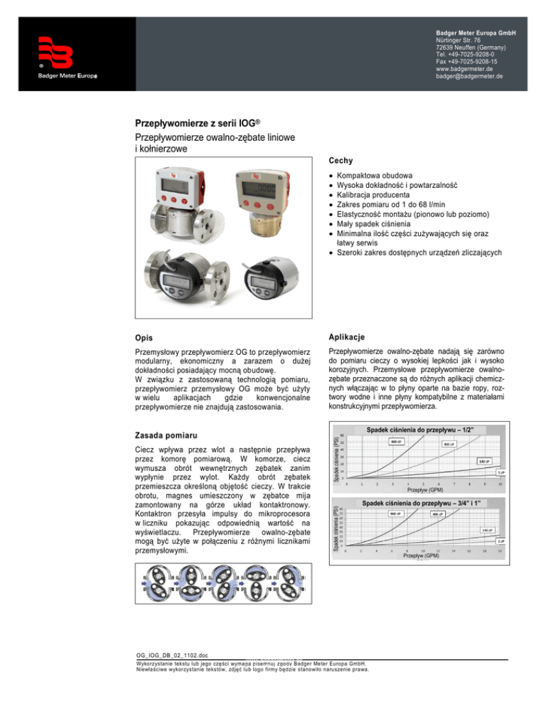 Badger Meter Europa GmbH Nürtinger Str. 76 72639 Neuffen (Germany) Tel. +49-7025-9208-0 Fax +49-7025-9208-15 www.badgermeter.de [email protected] Badger Meter Europa GmbH Nürtinger Str. 76 72639 Neuffen (Germany) Tel. +49-7025-9208-0 Fax +49-7025-9208-15 www.badgermeter.de [email protected] Przepływomierze z serii IOG® Przepływomierze owalno-zębate liniowe i kołnierzowe Cechy Kompaktowa obudowa Wysoka dokładność i powtarzalność Kalibracja producenta Zakres pomiaru od 1 do 68 l/min Elastyczność montażu (pionowo lub poziomo) Mały spadek ciśnienia Minimalna ilość części zużywających się oraz łatwy serwis Szeroki zakres dostępnych urządzeń zliczających Opis Aplikacje Przemysłowy przepływomierz OG to przepływomierz modularny, ekonomiczny a zarazem o dużej dokładności posiadający mocną obudowę. W związku z zastosowaną technologią pomiaru, przepływomierz przemysłowy OG może być użyty w wielu aplikacjach gdzie konwencjonalne przepływomierze nie znajdują zastosowania. Przepływomierze owalno-zębate nadają się zarówno do pomiaru cieczy o wysokiej lepkości jak i wysoko korozyjnych. Przemysłowe przepływomierze owalnozębate przeznaczone są do różnych aplikacji chemicznych włączając w to płyny oparte na bazie ropy, roztwory wodne i inne płyny kompatybilne z materiałami konstrukcyjnymi przepływomierza. Spadek ciśnienia (PSI) Ciecz wpływa przez wlot a następnie przepływa przez komorę pomiarową. W komorze, ciecz wymusza obrót wewnętrznych zębatek zanim wypłynie przez wylot. Każdy obrót zębatek przemieszcza określoną objętość cieczy. W trakcie obrotu, magnes umieszczony w zębatce mija zamontowany na górze układ kontaktronowy. Kontaktron przesyła impulsy do mikroprocesora w liczniku pokazując odpowiednią wartość na wyświetlaczu. Przepływomierze owalno-zębate mogą być użyte w połączeniu z różnymi licznikami przemysłowymi. Spadek ciśnienia do przepływu – 1/2” Przepływ (GPM) Spadek ciśnienia (PSI) Zasada pomiaru Spadek ciśnienia do przepływu – 3/4” i 1” meters Badger Meter Europa GmbH Nürtinger Str. 76 72639 Neuffen (Germany) Tel. +49-7025-9208-0 Fax +49-7025-9208-15 OG_IOG_DB_02_1102.doc www.badgermeter.de Wykorzystanie tekstu lub jego części wymaga pisemnej zgody Badger Meter Europa GmbH. [email protected] Niewłaściwe wykorzystanie tekstów, zdjęć lub logo firmy będzie stanowiło naruszenie prawa. Przepływ (GPM) (GPM) Dane techniczne Obudowa i przyłącza Średnice 1/2“, 3/4“ i 1“ Aluminium NPT, BSP, 150#, PN16 Stal nierdzewna NPT, BSP, 150#, 300#, PN16 Temperatura robocza (materiał zębatek) Stal nierdzewna -30 °C do +120 °C Plastik (PPS/LCP) -30 °C do +80 °C Maks. temperatura składo+79 °C wania Min. temperatura składo-30 °C wania Ciśnienie robocze Przyłącza NPT/BSP 55 bar (800 psi) Przyłącza kołnierzowe 150 lbs – 285 psi 16 bar (285 psi) 300 lbs – 740 psi 50 bar (740 psi) PN16 – 232 psi 15 bar (232 psi) Dla aplikacji o wyższym ciśnieniu należy skonsultować się z producentem. Lepkość Maks. 1000 cP. Przy większych lep kościach należy skonsultować się z producentem. Wykonanie materiałowe Korpus Stal nierdzewna 316L lub Aluminium 6061 Osłona Stal nierdzewna 316L lub Aluminium 6061 Wałek Stal nierdzewna 316L Owale zębate Stal nierdzewna 316L lub LCP (plastik) Tuleja Graphalloy (dla owali ze stali),dla owali z LCP bez tulejki O-ring Standard: Dla stali nierdzewnej – Aflas Dla aluminium – Viton Opcjonalnie: Buna, EPDM, Aflas, Viton Śruby osłony Stal nierdzewna Magnes Alnico 500 Zakres pomiaru Przyłącze l/min US gpm Lepkość cieczy Dokładność (%) Powtarzalność (%) 1/2“ 1 – 30 2 – 25 2 - 60 4.5 – 53 2.3 – 68 5.3 - 60 0.25 – 8 0.50 – 6.6 0.50 – 16 1.20 – 14 0.60 – 18 1.40 - 16 >5.0 cP <5.0 cP >5.0 cP <5.0 cP >5.0 cP <5.0 cP ±0.5 ±2.0 ±0.5 ±2.0 ±0.5 ±2.0 ±0.03 ±0.03 ±0.03 ±0.03 ±0.03 ±0.03 3/4“ 1“ Wymiary w mm 100 100 108* 108* 270* 251 97,5 130 92 110 170 170 *Wymiary wersji kołnierzowej bazują na przepływomierzu 1” – Wymiary zewnętrzne mogą się różnić w zależności od średnicy i typu kołnierzy/materiału – długość zabudowy 170 mm pozostaje bez zmian dla wszystkich wersji kołnierzowych. OG_IOG_DB_02_1102.doc Wykorzystanie tekstu lub jego części wymaga pisemnej zgody Badger Meter Europa GmbH. Niewłaściwe wykorzystanie tekstów, zdjęć lub logo firmy będzie stanowiło naruszenie prawa. Liczniki przemysłowe Typ ILR 700, 710, 720, 730, 740 Cechy ILR 740 ILR 700 ILR 710, 720, 730 Duży 6-cyffowy wyświetlacz LCD z trzema miejscami po przecinku Jednostka sumatora w litrach, pintach, ćwiartkach lub galonach Niekasowalny 11-cyfrowy sumator całościowy Kasowalny sumator – 5-cyfrowy Zakres temperatury pracy licznika Seria ILR: -20 °C do +60 °C Seria ER 420: -30 °C do +80 °C Wskaźnik niskiego poziomu baterii Baterie o długim czasie żywotności Współczynnik kalibracji zapisany w nieulotnej pamięci Programowalne wyjście impulsowe Opis Moduł licznika elektronicznego zawiera układ mikroprocesora zasilanego baterią litową. Może zostać zaprogramowany do zliczania w litrach, pintach, ćwiartkach lub galonach. Współczynnik kalibracji jest zaprogramowany podczas testu w fabryce. W przeciwieństwie do przepływomierzy mechanicznych, te przepływomierze mogą być ponownie skalibrowane gdy zaistnieje taka potrzeba. 6-cyfrowy wyświetlacz ciekłokrystaliczny, z dokładnością do 3 miejsc po przecinku, pokazuje dokładną objętość cieczy zmierzoną przez przepływomierz. Całość licznika jest chroniona przed normalnym zużyciem przez odporną na uderzenia obudowę. Licznik posiada również kasowalny sumator który wymaga aby przycisk total i reset były wciśnięte jednocześnie aby go wyzerować (przytrzymać przycisk “Total”, a następnie przycisnąć przycisk “Reset” aby wyzerować sumator podczas gdy wyświetlana jest wartość sumatora kasowalnego). T