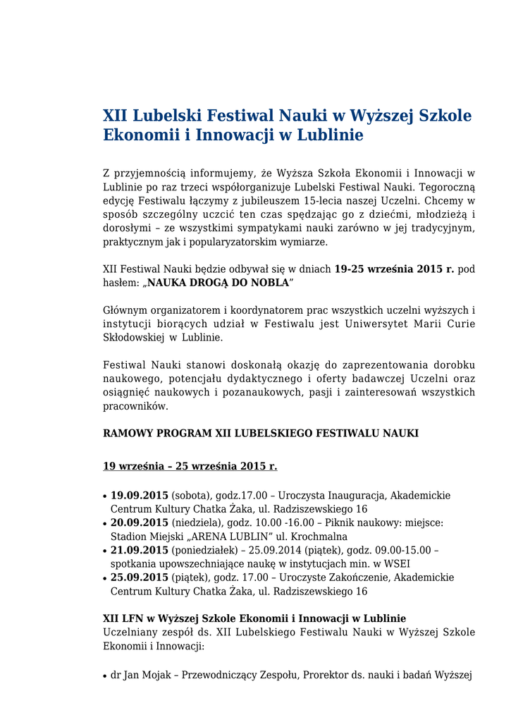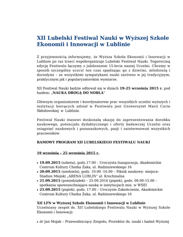 XII Lubelski Festiwal Nauki w Wyższej Szkole Ekonomii i Innowacji w Lublinie Z przyjemnością informujemy, że Wyższa Szkoła Ekonomii i Innowacji w Lublinie po raz trzeci współorganizuje Lubelski Festiwal Nauki. Tegoroczną edycję Festiwalu łączymy z jubileuszem 15-lecia naszej Uczelni. Chcemy w sposób szczególny uczcić ten czas spędzając go z dziećmi, młodzieżą i dorosłymi – ze wszystkimi sympatykami nauki zarówno w jej tradycyjnym, praktycznym jak i popularyzatorskim wymiarze. XII Festiwal Nauki będzie odbywał się w dniach 19-25 września 2015 r. pod hasłem: „NAUKA DROGĄ DO NOBLA” Głównym organizatorem i koordynatorem prac wszystkich uczelni wyższych i instytucji biorących udział w Festiwalu jest Uniwersytet Marii Curie Skłodowskiej w Lublinie. Festiwal Nauki stanowi doskonałą okazję do zaprezentowania dorobku naukowego, potencjału dydaktycznego i oferty badawczej Uczelni oraz osiągnięć naukowych i pozanaukowych, pasji i zainteresowań wszystkich pracowników. RAMOWY PROGRAM XII LUBELSKIEGO FESTIWALU NAUKI 19 września – 25 września 2015 r. ● ● ● ● 19.09.2015 (sobota), godz.17.00 – Uroczysta Inauguracja, Akademickie Centrum Kultury Chatka Żaka, ul. Radziszewskiego 16 20.09.2015 (niedziela), godz. 10.00 -16.00 – Piknik naukowy: miejsce: Stadion Miejski „ARENA LUBLIN” ul. Krochmalna 21.09.2015 (poniedziałek) – 25.09.2014 (piątek), godz. 09.00-15.00 – spotkania upowszechniające naukę w instytucjach min. w WSEI 25.09.2015 (piątek), godz. 17.00 – Uroczyste Zakończenie, Akademickie Centrum Kultury Chatka Żaka, ul. Radziszewskiego 16 XII LFN w Wyższej Szkole Ekonomii i Innowacji w Lublinie Uczelniany zespół ds. XII Lubelskiego Festiwalu Nauki w Wyższej Szkole Ekonomii i Innowacji: ● dr Jan Mojak – Przewodniczący Zespołu, Prorektor ds. nauki i badań Wyższej ● Szkoły Ekonomii i Innowacji w Lublinie, XII Lubelskiego Festiwalu Nauki w WSEI dr Agnieszka Żywicka – Wiceprzewodnicząca Zespołu, Koordynator Uczelniany XII Lubelskiego Festiwalu Nauki w WSEI członkowie: ● ● ● ● ● ● dr hab. Zbigniew Gaś – Pełnomocnik Dziekana Wydziału Pedagogiki i Psychologii WSEI ds. kierunku psychologia dr hab. Andrzej Cwynar – Dziekan Wydziału Ekonomii i Logistyki WSEI dr hab. Katarzyna Popik – Dziekan Wydziału Administracji WSEI dr inż. Józef Stokłosa – Prodziekan Wydziału Transportu i Informatyki WSEI mgr Maria Granat mgr Ewa Golec Informacje podstawowe: Festiwal odbywa się w formie projektowej. Projekty z naszej Uczelni mają być realizowane w budynku Uczelni. W dniu 20.09.2015 r. odbędzie się piknik naukowy dlatego prosimy o przygotowanie 3-4 projektów plenerowych. Głównym adresatem projektów jest młodzież gimnazjalna i ponadgimnazjalna i dorośli ale przewidujemy również możliwość przygotowania kilku projektów dla dzieci ze szkół podstawowych. Lubelski Festiwal Nauki stanowi doskonałą okazję do popularyzowania naszej Uczelni, dorobku pracowników, bazy dydaktycznej i nowoczesnego wyposażenia w szerokich kręgach odbiorców. W 2014 r. Festiwal organizowany był po raz jedenasty i z roku na rok cieszy się coraz większym zainteresowaniem mieszkańców Lubelszczyzny. Z uwagi na to wszyscy pracownicy Uczelni proszeni są do aktywnego włączenia sie w przedsięwzięcia festiwalowe. Zasady opracowywania i zgłaszania projektów na Festiwal: 1. Bezpośredniej rejestracji projektów na stronie LFN dokonuje Agnieszka Żywicka – Koordynator XII LFN w WSEI. 2. Kierownik projektu (osoba zgłaszająca projekt) powinna opracować koncepcję projektu zawierającą następujące dane: 1) Tytuł projektu: Zespól projektowy: (podać imiona i nazwiska osób realizujących projekt) 2) Data i godziny realizacji projektu: 3. 4. 5. 6. (termin i godziny, projekt powinien być realizowany w jednostkach 45 min. minimalny czas trwania projektu 45 min., projekt powinien być powtórzony kilkakrotnie dla kilku grup) 3) Liczba uczestników podczas jednej sesji projektu: (podać maksymalną i liczebność grupy, dla której ma być realizowany projekt) 4) Adresaci projektu: (wskazać grupę docelową: młodzież ponadgimnazjalna, młodzież gimnazjalna, dorośli, dzieci w wieku szkolnym, przedszkolaki, wszyscy): 5) Krótki opis projektu (maksymalnie 400 znaków, opis założeń projektu, co projekt ma na celu) 6) Miejsce realizacji (wskazać salę wraz z niezbędnym sprzętem i ewentualnymi materiałami potrzebnymi do realizacji projektu). Koncepcję projektu należy przesłać elektronicznie na adres [email protected] w terminie do 20.05.2015 r. Do realizacji projektów wyznaczona jest ograniczona liczba wykonawców: 2 – wykład, 5 (max. 4 wykonawców i kierownik) dla projektu praktycznego/doświadczalnego. Prezentacje festiwalowe odwiedzane są przez całe klasy, dlatego powinny być przeznaczone dla minimum 25-30 osób. Jeżeli wielkość danej pracowni pozwala na pokaz dla mniejszej liczby osób to prosimy o zaplanowanie dwóch – trzech następujących po sobie prezentacji. Dodatkowych informacji w kwestii zgłaszania projektów udziela koordynator Uczelniany LFN: Pani Agnieszka Żywicka, tel. 81 749 32 42 e-mail: [email protected] Rejestracja odbywa się za pośrednictwem strony internetowej XII Lubelskiego Festiwalu Nauki: https://www.festiwal.lublin.pl/projekty/projekty.html Plakaty I dzień Festiwalu - 21.09.2015