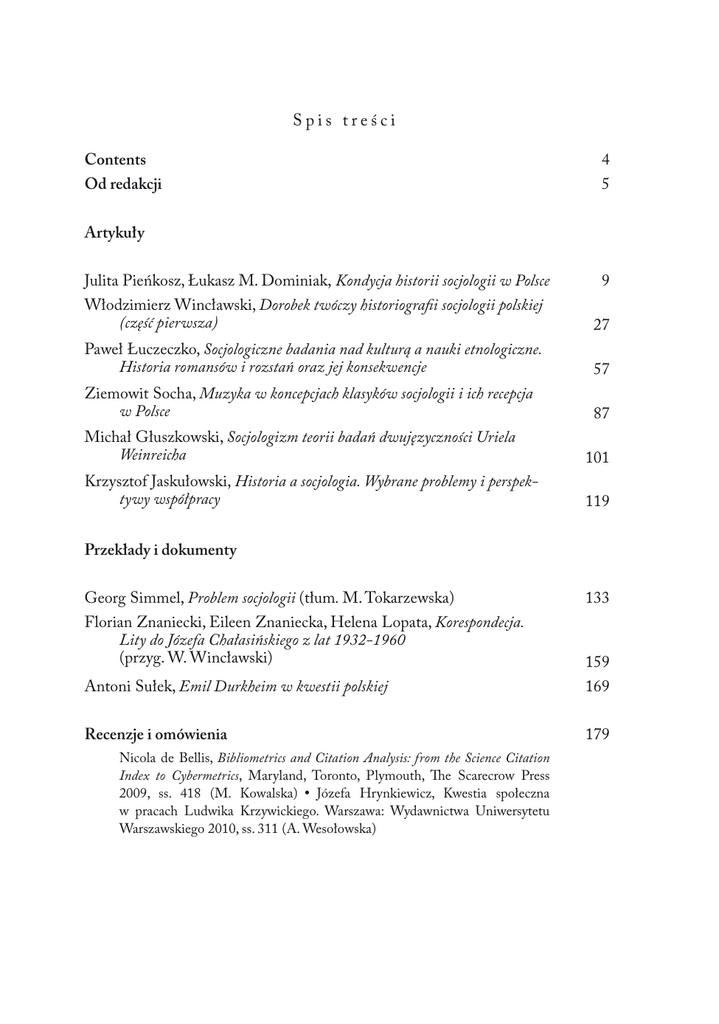 Spis treści Contents Od redakcji 4 5 Artykuły Julita Pieńkosz, Łukasz M. Dominiak, Kondycja historii socjologii w Polsce Włodzimierz Wincławski, Dorobek twóczy historiografii socjologii polskiej (część pierwsza) 9 27 Paweł Łuczeczko, Socjologiczne badania nad kulturą a nauki etnologiczne. Historia romansów i rozstań oraz jej konsekwencje 57 Ziemowit Socha, Muzyka w koncepcjach klasyków socjologii i ich recepcja w Polsce 87 Michał Głuszkowski, Socjologizm teorii badań dwujęzyczności Uriela Weinreicha 101 Krzysztof Jaskułowski, Historia a socjologia. Wybrane problemy i perspektywy współpracy 119 Przekłady i dokumenty Georg Simmel, Problem socjologii (tłum. M. Tokarzewska) Florian Znaniecki, Eileen Znaniecka, Helena Lopata, Korespondecja. Lity do Józefa Chałasińskiego z lat 1932-1960 (przyg. W. Wincławski) 133 Antoni Sułek, Emil Durkheim w kwestii polskiej 159 169 Recenzje i omówienia 179 Nicola de Bellis, Bibliometrics and Citation Analysis: from the Science Citation Index to Cybermetrics, Maryland, Toronto, Plymouth, The Scarecrow Press 2009, ss. 418 (M. Kowalska) • Józefa Hrynkiewicz, Kwestia społeczna w pracach Ludwika Krzywickiego. Warszawa: Wydawnictwa Uniwersytetu Warszawskiego 2010, ss. 311 (A. Wesołowska)