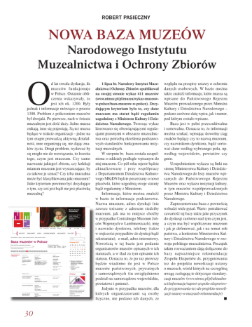 Robert Pasieczny Nowa baza muzeów Narodowego Instytutu Muzealnictwa i Ochrony Zbiorów O d lat trwała dyskusja, ile muzeów funkcjonuje w Polsce. Ostatnie obliczenia wskazywały, że jest ich ok. 1200. Były jednak i informacje mówiące o prawie 1300. Problem z policzeniem muzeów był dwojaki. Po pierwsze, ruch w świecie muzealnym jest dość duży. Jedne muzea znikają, inne się pojawiają. Są też muzea będące w trakcie organizacji – jedne na tym etapie prowadzą aktywną działalność, inne organizują się, nie dając znaków życia. Drugi problem, wydawać by się mogło nie do rozwiązania, to kwestia tego, czym jest muzeum. Czy samo nazwanie jakiegoś zbioru, czy kolekcji mianem muzeum jest wystarczające, by za takowe je uznać? Czy izba muzealna może być klasyfikowana jako muzeum? Jakie kryterium powinno być decydujące o tym, czy coś jest bądź nie jest placówką muzealną? 30 1 lipca br. Narodowy Instytut Muzealnictwa i Ochrony Zbiorów opublikował na swojej stronie wykaz 411 muzeów (www.nimoz.pl/pl/muzea/wykaz-muzeoww-polsce/baza-muzeow-w-polsce). Decydującym kryterium było to, czy dane muzeum ma statut bądź regulamin uzgodniony z Ministrem Kultury i Dziedzictwa Narodowego. Tworząc wykaz kierowano się obowiązującymi regulacjami prawnymi w obszarze muzealnictwa oraz potrzebą określenia podstawowych standardów funkcjonowania instytucji muzealnych. W sierpniu br. baza została uzupełniona o oddziały podległe wpisanym do niej muzeom. Co pół roku rejestr będzie aktualizowany i przy współpracy z Departamentem Dziedzictwa Kulturowego MKiDN będzie poszerzany o nowe placówki, które uzgodnią swoje statuty bądź regulaminy z Ministrem. Informacje, które można znaleźć w bazie to informacje podstawowe. Nazwa muzeum, adres dyrekcji (nie zawsze tożsamy z adresem siedziby muzeum, jak ma to miejsce choćby w przypadku Centralnego Muzeum Jeńców Wojennych w Łambinowicach), imię i nazwisko dyrektora, telefony (także w większości przypadków do dyrekcji bądź sekretariatu), e-mail, adres internetowy. Nowością w tej bazie jest podanie organizatorów muzeów opisanych w ich statutach, a w ślad za tym opisanie ich statusu. Oznacza to, że po raz pierwszy będzie wiadomo ile jest w Polsce muzeów państwowych, prywatnych i samorządowych (tu uwzględniono podział na samorządowe wojewódzkie, powiatowe i gminne). Jedynie w przypadku muzeów, dla których organizatorami są osoby fizyczne, nie podano ich danych, ze względu na przepisy ustawy o ochronie danych osobowych. W bazie można także znaleźć informacje, które muzea są wpisane do Państwowego Rejestru Muzeów prowadzonego przez Ministra Kultury i Dziedzictwa Narodowego – podano zarówno datę wpisu, jak i numer, pod którym zostało wpisane. Baza jest w pełni przeszukiwalna i sortowalna. Oznacza to, że informacji można szukać, wpisując dowolny ciąg znaków będący czy to nazwą muzeum, czy nazwiskiem dyrektora, bądź sortować dane według wybranego pola, np. według województw, powiatów czy gmin. Uzupełnieniem wykazu są linki na stronę Ministerstwa Kultury i Dziedzictwa Narodowego do listy muzeów wpisanych do Państwowego Rejestru Muzeów oraz wykazu instytucji kultury, w tym muzeów współprowadzonych przez Ministra Kultury i Dziedzictwa Narodowego. Zaprezentowana baza z pewnością wzbudzi wiele pytań. Warto potraktować zawartość tej bazy także jako przyczynek do dyskusji zarówno nad tym czym jest, a czym ma być współczesne muzeum i jak je definiować, jak i na temat roli państwa, a konkretnie Ministerstwa Kultury i Dziedzictwa Narodowego w rozwoju polskiego muzealnictwa. Początek takim rozważaniom dają dołączone do bazy najważniejsze rekomendacje Zespołu Ekspertów ds. przygotowania tez do projektu nowelizacji ustawy o muzeach, wśród których na szczególną uwagę zasługują te dotyczące standaryzacji muzeów (www.nimoz.pl/pl/aktualnosci/informacje/raport-zespolu-ekspertowds-przygotowania-tez-do-projektu-nowelizacji-ustawy-o-muzeach-rekomendacje) n