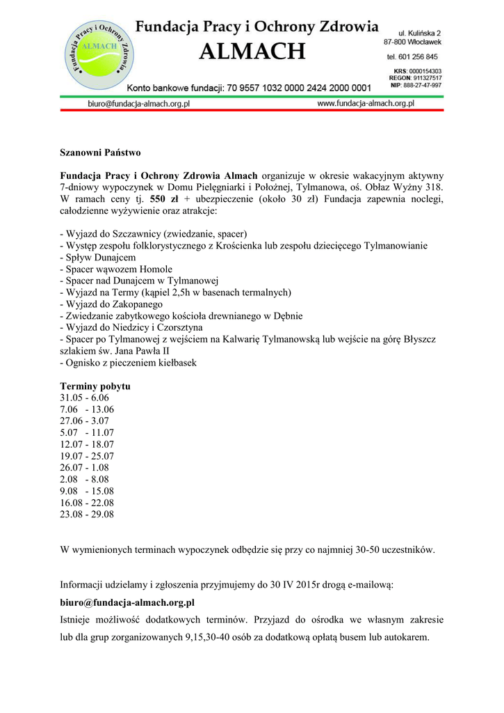 Szanowni Państwo Fundacja Pracy i Ochrony Zdrowia Almach organizuje w okresie wakacyjnym aktywny 7-dniowy wypoczynek w Domu Pielęgniarki i Położnej, Tylmanowa, oś. Obłaz Wyżny 318. W ramach ceny tj. 550 zł + ubezpieczenie (około 30 zł) Fundacja zapewnia noclegi, całodzienne wyżywienie oraz atrakcje: - Wyjazd do Szczawnicy (zwiedzanie, spacer) - Występ zespołu folklorystycznego z Krościenka lub zespołu dziecięcego Tylmanowianie - Spływ Dunajcem - Spacer wąwozem Homole - Spacer nad Dunajcem w Tylmanowej - Wyjazd na Termy (kąpiel 2,5h w basenach termalnych) - Wyjazd do Zakopanego - Zwiedzanie zabytkowego kościoła drewnianego w Dębnie - Wyjazd do Niedzicy i Czorsztyna - Spacer po Tylmanowej z wejściem na Kalwarię Tylmanowską lub wejście na górę Błyszcz szlakiem św. Jana Pawła II - Ognisko z pieczeniem kiełbasek Terminy pobytu 31.05 - 6.06 7.06 - 13.06 27.06 - 3.07 5.07 - 11.07 12.07 - 18.07 19.07 - 25.07 26.07 - 1.08 2.08 - 8.08 9.08 - 15.08 16.08 - 22.08 23.08 - 29.08 W wymienionych terminach wypoczynek odbędzie się przy co najmniej 30-50 uczestników. Informacji udzielamy i zgłoszenia przyjmujemy do 30 IV 2015r drogą e-mailową: [email protected] Istnieje możliwość dodatkowych terminów. Przyjazd do ośrodka we własnym zakresie lub dla grup zorganizowanych 9,15,30-40 osób za dodatkową opłatą busem lub autokarem.