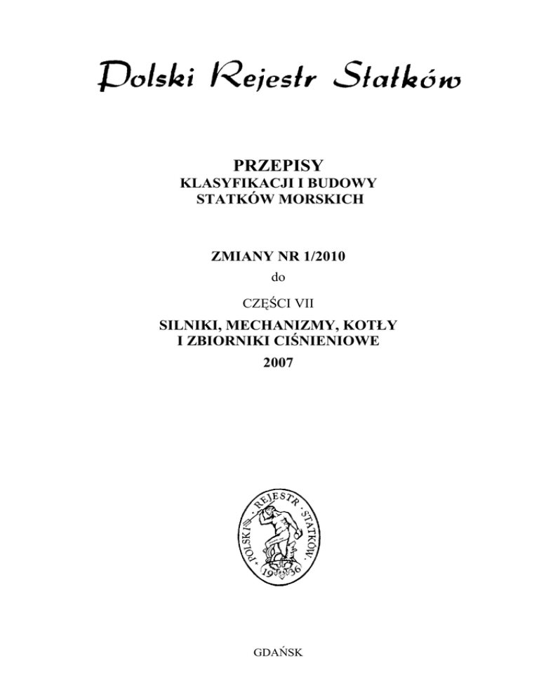 PRZEPISY KLASYFIKACJI I BUDOWY STATKÓW MORSKICH ZMIANY NR 1/2010 do CZĘŚCI VII SILNIKI, MECHANIZMY, KOTŁY I ZBIORNIKI CIŚNIENIOWE 2007 GDAŃSK Zmiany Nr 1/2010 do Części VII – Silniki, mechanizmy, kotły i zbiorniki ciśnieniowe – 2007, Przepisów klasyfikacji i budowy statków morskich, zostały zatwierdzone przez Zarząd Polskiego Rejestru Statków S.A. w dniu 28 kwietnia 2010 r. i wchodzą w Ŝycie z dniem 12 maja 2010 r. © Copyright by Polski Rejestr Statków, 2010 PRS/AW, 04/2010 Wprowadza się następujące zmiany do Części VII – Silniki, mechanizmy, kotły i zbiorniki ciśnieniowe – 2007: 1. Punkt 2.2.10 otrzymuje brzmienie : 2.2.10 Silnik powinien być wyposaŜony w system wykrywania mgły olejowej (lub urządzenie monitorujące temperaturę łoŜysk albo urządzenie równowaŜne) zapewniający: – alarm i zmniejszenie prędkości silnika – wymaganie dotyczy silników wolnoobrotowych o mocy znamionowej 2250 kW i większej lub jeŜeli średnica cylindra jest większa niŜ 300 mm, – alarm i zatrzymanie silnika – wymaganie dotyczy silników średnioobrotowych i wysokoobrotowych o mocy znamionowej 2250 kW i większej lub jeŜeli średnica cylindra jest większa niŜ 300 mm. System wykrywania mgły olejowej powinien być typu uznanego przez PRS. Urządzenia monitorujące temperaturę łoŜysk lub równowaŜne urządzenia bezpieczeństwa powinny być typu uznanego przez PRS. Zaleca się, aby silnik był wyposaŜony w alarm wysokiej temperatury łoŜyska oporowego, jeŜeli znajduje się ono wewnątrz silnika i ma połączenie ze skrzynią korbową. Uwaga: Za urządzenie równowaŜne uznaje się np. rozwiązanie konstrukcyjne stosowane w silnikach wysokoobrotowych, wykluczające ryzyko eksplozji w skrzyni korbowej. 2. W punkcie 2.2.11, w podpunkcie .8 dotychczasowy zapis: .8 system do wykrywania/ monitorowania mgły olejowej zmienia się na: .8 system wykrywania mgły olejowej a dotychczasowy zapis: W instrukcji obsługi systemu wykrywania/ monitorowania mgły olejowej zmienia się na: W instrukcji obsługi systemu wykrywania mgły olejowej 3. W punkcie 2.2.11, w podpunkcie .8 dotychczasowe zapisy w wyliczeniu pierwszym i czwartym zmienia się na, odpowiednio: – schemat systemu wykrywania mgły olejowej i systemu ostrzegawczego, pokazujący punkty poboru próbek w skrzyni korbowej oraz układ rurociągów lub kabli wraz z podaniem wymiarów rurociągów doprowadzonych do czujników, 3 – informację dotyczącą badania typu lub badania w czasie eksploatacji dla silnika z zamontowanym testowym systemem zabezpieczającym, posiadającym uznany system wykrywania mgły olejowej; 4. W punkcie 2.2.11, w podpunktach .9, .10, .12, .14, .15, .16, .17, .18, .19 dotychczasowe zapisy: wykrywania/monitorowania mgły olejowej oraz: monitorowania mgły olejowej zmienia się na: wykrywania mgły olejowej. 5. W punkcie 2.2.11 podpunkt .11 otrzymuje brzmienie: .11 KaŜdy silnik powinien być wyposaŜony w swój własny niezaleŜny system wykrywania mgły olejowej i w sygnalizację alarmową. 6. W punkcie 2.2.11, w Uwadze, trzy ostatnie wiersze otrzymują brzmienie: 1) wniosek o certyfikację silnika nosi datę 1 stycznia 2010 r. lub późniejszą. 2) silnik instalowany jest na statku, kontrakt na budowę którego zawarto w dniu 1 stycznia 2010 r. lub po tej dacie. 4