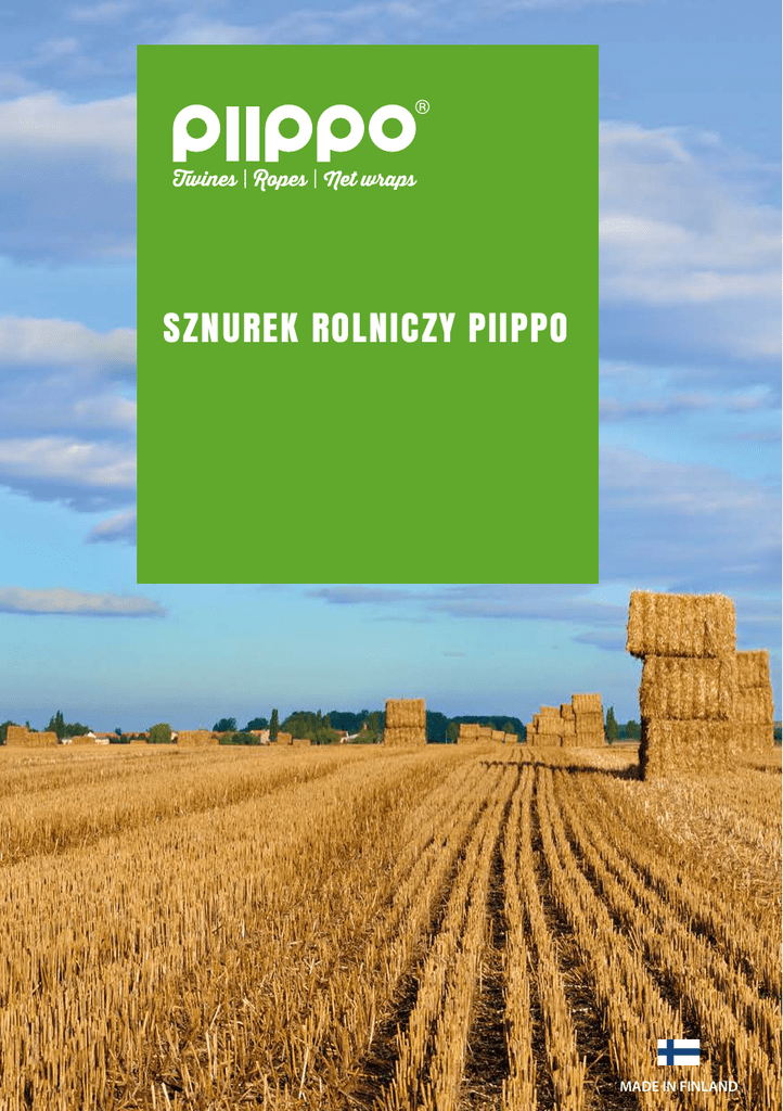 SZNUREK ROLNICZY PIIPPO MADE IN FINLAND Sznurek rolniczy Piippo zawiera wartosciowe koszyści Więcej metrów w kilogramie, w opakowaniu oraz na palecie. Dzięki unikatowej produkcji Folii Piippo, jedna paleta sznurka Piippo będzie posiadała do 25km więcej sznurka niż paleta wypełniona odpowiednim sznurkiem konkurencyjnym. Poprzez używanie sznurka Piippo, można otrzymać wiecej metrów i mniejszą wage na każdej palecie i zaoszczędzic ok 400 euro. Aktualne metry są gwarantowane- uważaj co kupujesz! Dzięki naszemu dokładnemu standardowi produkcji, sznurek owija tyle samo ile wskazuje opakowanie. Sznurek 130 owija 130m/kg, oraz sznurek 110 daje 110m/kg. Wybierając sznurek Piippo, uzyskujesz 20% więcej sznurka w porównaniu do produktu innych producentów. Do 30% większa wytrzymałość na zrywanie we wszystkich typach sznurka! Baloty pozostają w dobrej formie podczas składowania oraz przenoszenia. Koszt transportu może być zredukowany, ponieważ baloty nei rozpadają się podczas przechowywania. Oszczednosci w kosztach części zamiennych. Najmiększy sznurek na rynku działa łagodnie w prasie i wydłuża żywotność aparatów wiążących oraz MIEKKI innych metalowych części w prasie. Ćzysty swiat. Zrównoważony rozwój w działaniach Piippo jest osiągnięty przez efektywne użycie zużywalnych naturalnych materiałów. Jako wynik, nasz klient będzie osągał większą wytrzymałość sznurka na zrywanie na węźle, niższe koszty na metr oraz mniej odpadów. Jeden kilogram sznurka Piippo daje dłuższe i wytrzymalsze metry sznurka. Optymalizuj belowanie duzych kostek przez użycie sznurka odpowiedniego do Twojej prasy oraz warunków belowania. Sznurek Big Square 130 jest najlepiej sprzedającym się produktem i ma najniższącene za metr. Sznurek ten działa w większości prasach i warunkach. Dla nowych pras HD w szczególności w słomie, rekomendujemy sznurek Extreme 115 oraz Super Extreme 110. Zgodnie z naszymi testami, najmocniejszym sznurkiem na rynku jest sznurek Cropmaster 100. Jest odpowiedni do ekstremalnych warunków oraz dużych gestości bel- kiedy wszystko inne zawodzi. Sznurek PIIPPO DO DUZYCH KOSTEK Aktuale metry Rozmiar opakowania Ilość metrów/ opakowanie Wymiar palety Cropmaster 100 m/kg 21 2100 1008 kg Ex E treme Super 110 m/kg 21 2310 1008 kg Extreme 115 m/kg 18 2070 1008 kg Magnum 122 m/kg 18 2196 1008 kg Big Square 130 m/kg 18 2340 1008 kg Tradycyjny sznurek Piippo do małych kostek jest klasykiem od 1972 r. Ten sznurek jest również niezawodny oraz oferuje do 30% więcej metrów niż inne sznurki tego typu na rynku. Sznurek do pras kostkujących Aktualne metry Rozmiar opakowania Ilość metrów/ opakowanie Wymiar palety Hay 300 m/kg 10 3000 800 kg Traditional 400 m/kg 10 4000 800 kg Sznurek do pras zwijających oferuje niską tolerancje I ścisłe przyleganie dobalotu. Używając sznurek Long Champ można zaoszczędzić więcej pieniędzy niż dotychczas przy owijaniu. Sznurki do pras zwijających Aktualne metry Rozmiar opakowania 10 Ilość metrów/ opakowanie 6000 Wymiar palety Round Bale 600 m/kg Triathlon 700 m/kg 10 7000 800 kg 800 kg Long Champ 850 m/kg 10 8500 800 kg Sznurek sizalowy Piippo jest ekologicznym wyborem do pras zwijających do pras z dużą gęstością. Jest wyprodukowany z włókien agawy i jest nieelastyczny. Sisal 200 m/kg Package size18 kg Pallet size 1080 kg DOTRZYMUJEMY OBIETNIC AKTUALNE METRY PIIPPO 130 Wytrzymałość węzła 195 kp Aktualne metry 130 m/kg 130 m/kg 16% więcej sznurka w kilogramie! 16% więcej balotów! BALER TWINE ‘X’ 130 Wytrzymałość węzła180 kg Aktualne metry 112 m/kg PIIPPO OYJ, Sysmäjärventie 3, FIN-83500 OUTOKUMPU Tel. +358 (0) 13 562 555, fax +358 (0) 13 562 556 www.piippo.fi