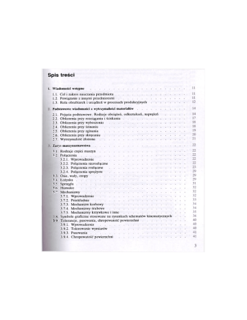 Spis treści 1. Wiadomości wstępne 1.1. Cel i zakres nauczania przedmiotu 1.2. Powiązanie z innymi przedmiotami 1.3. Rola obrabiarek i urządzeń w procesach produkcyjnych Podstawowe wiadomości z wytrzymałości materiałów 2.1. 2.2. 2.3. 2.4. 2.5. 2.6. 2.7. Pojęcia podstawowe. Rodzaje obciążeń, odkształceń, naprężeń Obliczenia przy rozciąganiu i ściskaniu Obliczenia przy wyboczeniu Obliczenia przy ścinaniu Obliczenia przy zginaniu Obliczenia przy skręcaniu Wytrzymałość złożona Zarys maszynoznawstwa 3.1. Rodzaje części maszyn _V2. Połączenia 3.2.1. Wprowadzenie 3.2.2. Połączenia nierozłączne 3.2.3. Połączenia rozłączne 3.2.4. Połączenia sprężyste 3.3. Osie, wały, czopy 3.4. Łożyska i 3.5. Sprzęgła ?.t>. Hamulce 3 Mechanizmy 3.7.1. Wprowadzenie 3.7.2. Przekładnie 3.7.3. Mechanizm korbowy 3.7.4. Mechanizmy śrubowe 3.7.5. Mechanizmy krzywkowe i inne 8 Symbole graficzne stosowane na rysunkach schematów kinematycznych 3.9. Tolerancje, pasowania, chropowatość powierzchni 3.9.1. Wprowadzenie 3.9.2. Tolerowanie wymiarów 3.9.3. Pasowania 3.9.4. Chropowatość powierzchni 3.10. Tarcie, smary, smarowanie 3.11. Konserwacja i zabezpieczanie przed korozją 4. Wybrane urządzenia elektryczne 4.1. 4.2. 4.3. 4.4. 4.5. 4.6. 4.7. 42 43 45 Pojęcia podstawowe Przewody elektryczne i ich zabezpieczanie Grzejnictwo elektryczne Silniki elektryczne Zasady uziemiania maszyn i urządzeń Działanie prądu na organizm człowieka i pierwsza pomoc w przypadku porażenia Przepisy bhp i przeciwpożarowe dotyczące urządzeń elektrycznych . . . . 5. Sprężarki, wentylatory i instalacje pneumatyczne 5.1. 5.2. 5.3. 5.4. 5.5. 5.6. Wiadomości ogólne Sprężarki Przemysłowe instalacje sprężonego powietrza Wentylatory Instalacje pneumatycznego odwiórowywania (odpylania) obrabiarek Przepisy bhp dotyczące urządzeń ciśnieniowych 52 . . . . 6. Ogólny przegląd narzędzi i obrabiarek do drewna 6.1. 6.2. 6.3. 6.4. 6.5. 6.6. Pojęcia podstawowe Budowa ostrza Kierunki obróbki i położenia skrawania Ogólny przegląd narzędzi tnących Materiały na narzędzia i wymagania techniczne Ogólny podział obrabiarek 7. Zespoły i główne części obrabiarek 7.1. Wprowadzenie i podział ogólny 7.2. Kadłub 7.3. Zespół roboczy i narzędzie 7.4. Zespól napędowy 7.5. Zespół posuwowy 7.6. Zespół prowadzący 7.7. Zespół podpierający 7.8. Zespół zaciskowy 7.9. Zespół dociskowy 7.10. Zespoły podające i odbierające 7.11. Zespół nastawczy 7.12. Osłony i urządzenia zwiększające bezpieczeństwo pracy 8. Piły i pilarki 8.1. Pilarka tarczowa stolarska 8.1.1. Zastosowanie technologiczne 8.1.2. Przygotowanie pilarki tarczowej do wykonania wybranego zadania technologicznego i wykonanie tego zadania 8.1.3. Przygotowanie pilarki tarczowej do innych zadań 8.1.4. Budowa i działanie zespołów pilarki tarczowej stolarskiej 8.1.5. Ogólna budowa i charakter\-;\K.. techniczna pilarki tarczowej stolarskiej; inne rozwiązania konstrukcyjne 8.2. Piła tarczowa dośrodkowo zbiezna 8.3. Klin rozszczepiający rzaz 8.4. Inne rodzaje pił tarczowych 4 45 46 47 48 50 50 51 52 53 54 58 59 62 63 63 63 65 66 67 68 70 70 70 71 72 72 73 74 75 75 76 76 78 81 81 81 82 84 85 89 91 94 94 8.5. 8.6. 8.7. 8.8. 8.9. 8.4.1. Piły tarczowe płaskie 8.4.2. Piły tarczowe odśrodkowo zbieżne 8.4.3. Piły tarczowe z nakładkami z węglików spiekanych Elementy klasyfikacji pił tarczowych Pilarki tarczowe formatowe 8.6.1. Zastosowanie technologiczne 8.6.2. Budowa i działanie Pilarka taśmowa stolarska 8.7.1. Zastosowanie technologiczne 8.7.2. Budowa i działanie 8.7.3. Urządzenia ochronne i wytyczne bhp 8.7.4. Charakterystyka cech konstrukcyjno-technologicznych 8.7.5. Inne odmiany pilarek taśmowych Piły taśmowe Wyrzynarka 94 97 98 102 102 102 103 105 105 105 107 109 109 109 HO Narzędzia do strugania i strugarki 113 9.1. 9.2. 9.3. 9.4. 113 113 115 116 116 117 119 120 120 120 123 124 126 129 9.5. 9.6. 9.7. ^.8. Zastosowanie technologiczne strugarek Noże do strugarek, wały nożowe, głowice Przygotowanie narzędzi strugarskich do pracy Strugarka wyrówniarka 9.4.1. Zastosowanie technologiczne 9.4.2. Budowa, działanie, charakterystyka techniczna 9.4.3. Urządzenia ochronne i wytyczne bhp 9.4.4. Inne rozwiązania konstrukcyjne strugarek wyrówniarek Strugarki grabiarki 9.5.1. Budowa, działanie, charakterystyka techniczna 9.5.2. Urządzenia ochronne Strugarki trzystronne Strugarki czterostronne Wygładzarka . . . . . Narzędzia frezarskie i frezarki 130 10.1. Wprowadzenie 10.2. Narzędzia frezarskie 10.2.1. Przegląd i zastosowanie 10.2.2. Frezy nasadzane całkowite pojedyncze 10.2.3. Frezy nasadzane złożone i kombinowane 10.2.4. Głowice frezowe nasadzane i noże do głowic 10.2.5. Frezy i głowice frezowe trzpieniowe 10.2.6. Ustawianie i mocowanie narzędzi frezarskich 10.3. Frezarki dolnowrzecionowe 10.4. Frezarki górnowrzecionowe 10.4.1. Wiadomości ogólne 10.4.2. Frezarka zwykła kopiarka 10.4.3. Frezarka ze stołem obrotowym 10.4.4. Frezarka dwustronna z przesuwnym stołem 130 132 132 132 135 135 141 142 145 148 148 148 150 151 t /opiarki i wczepiarki 153 11.1. 11.2. 11.3. h.4 153 155 157 158 Czopy, widlice i sposoby ich obróbki Czopiarka jednostronna Czopiarka dwustronna Czopiarka obwiedniowa 5 11.5. Wczepy i sposoby ich obróbki 11.6. Wczepiarka pozioma jednowrzecionowa z zestawem frezów nasadzanych 11.7. Wczepiarka pionowa z frezem trzpieniowym 12. Wiertła, pogłębiaki, wiertarki i wiertarko-frezarki 12.1. 12.2. 12.3. 12.4. 12.5. 12.6. Wprowadzenie Wiertła i pogłębiaki — charakterystyka i zastosowanie Ustawianie i mocowanie wierteł Wiertarki jednowrzecionowe Wiertarki wielowrzecionowe Wiertarko-frezarki 13. Dłuta i dłutarki 13.1. 13.2. 13.3. 13.4. Wprowadzenie Dłuta i dłutarki łańcuszkowe Dłuta i dłutarki oscylacyjne Dłuta i dłutarki kombinowane 14. Narzędzia tokarskie, tokarki i obtaczarki 14.1. 14.2. 14.3. 14.4. 14.5. 14.6. 14.7. 14.8. Wprowadzenie Noże do 